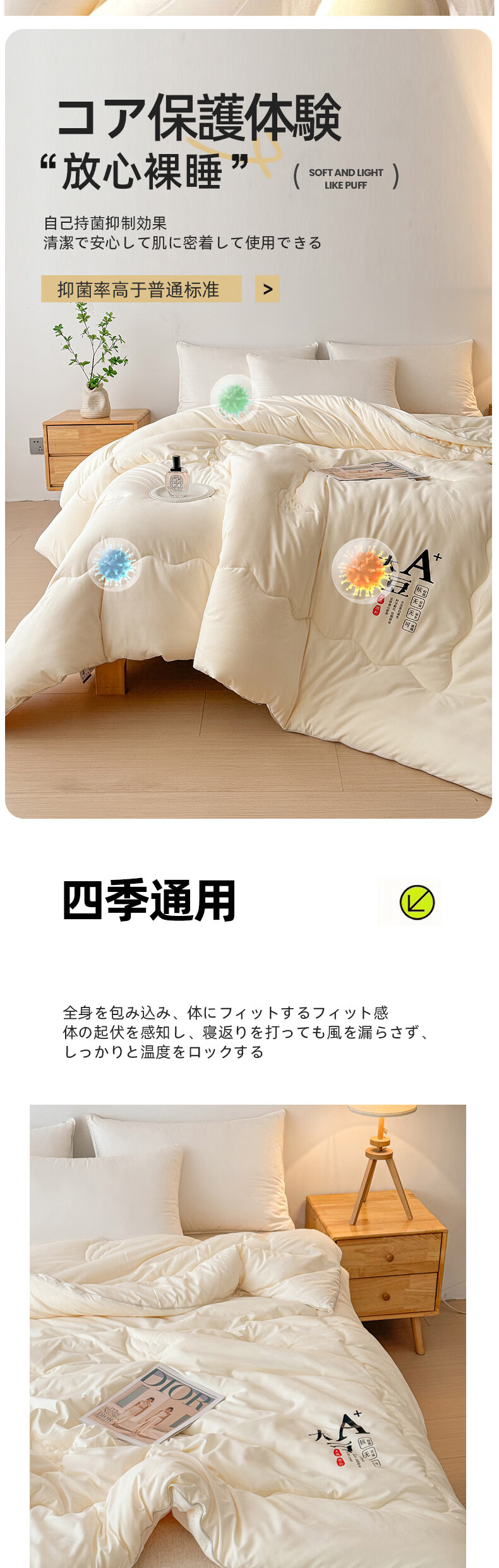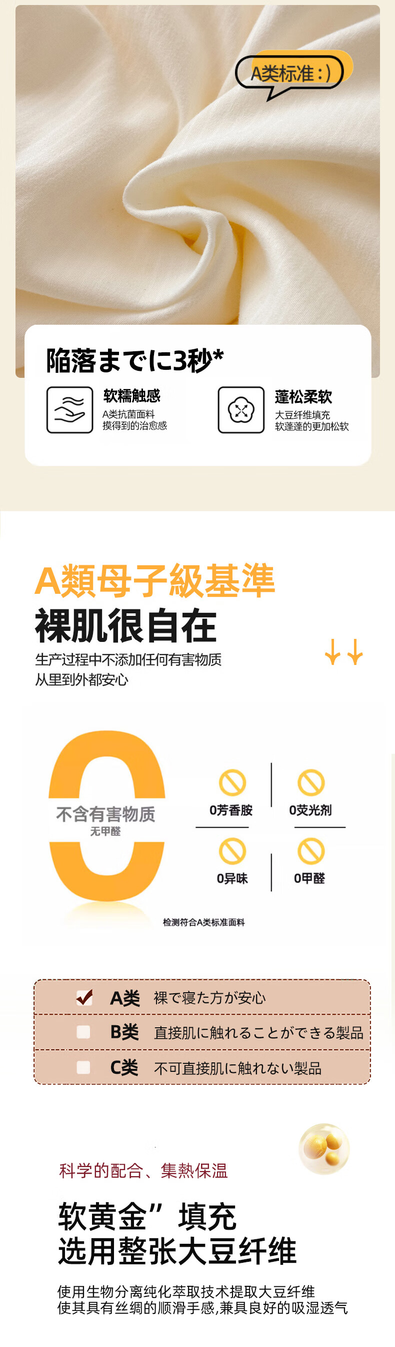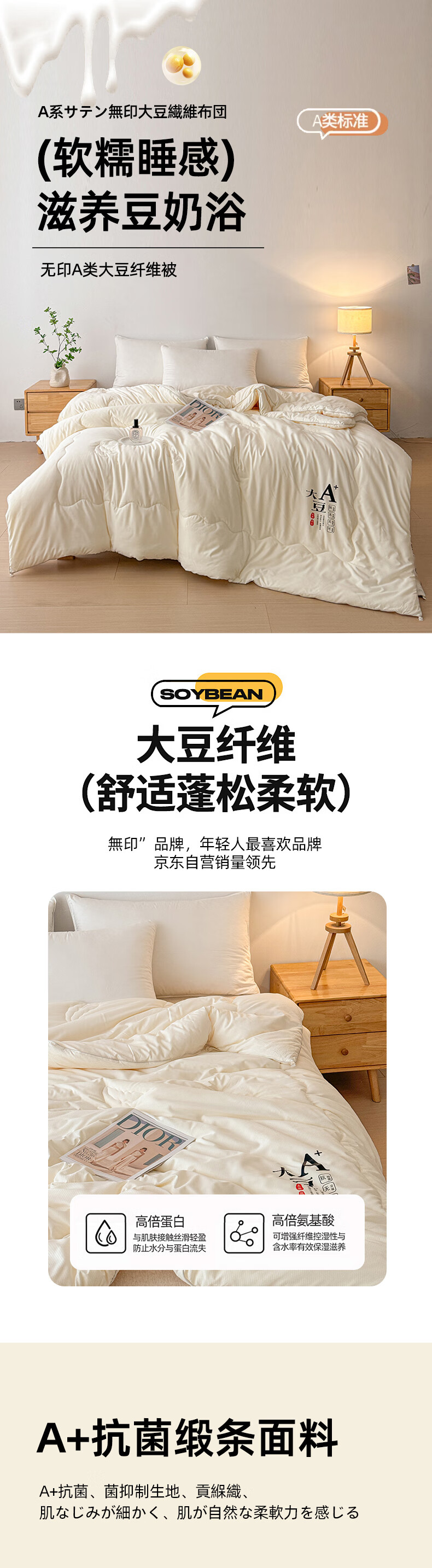 A+抗菌/抑菌面料,贡缎织造,亲肤细腻,肌肤感知自;大豆纤维-“软黄金”填充,科学配比,聚暖保温。;高品质、高材质、高标准,一款对生活高度负责的产品。