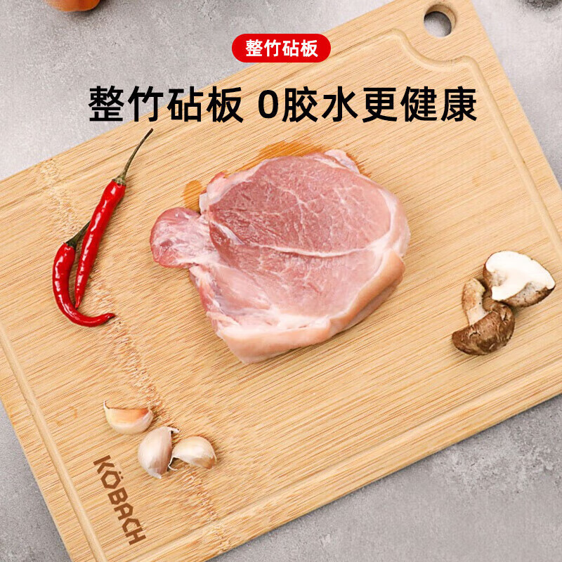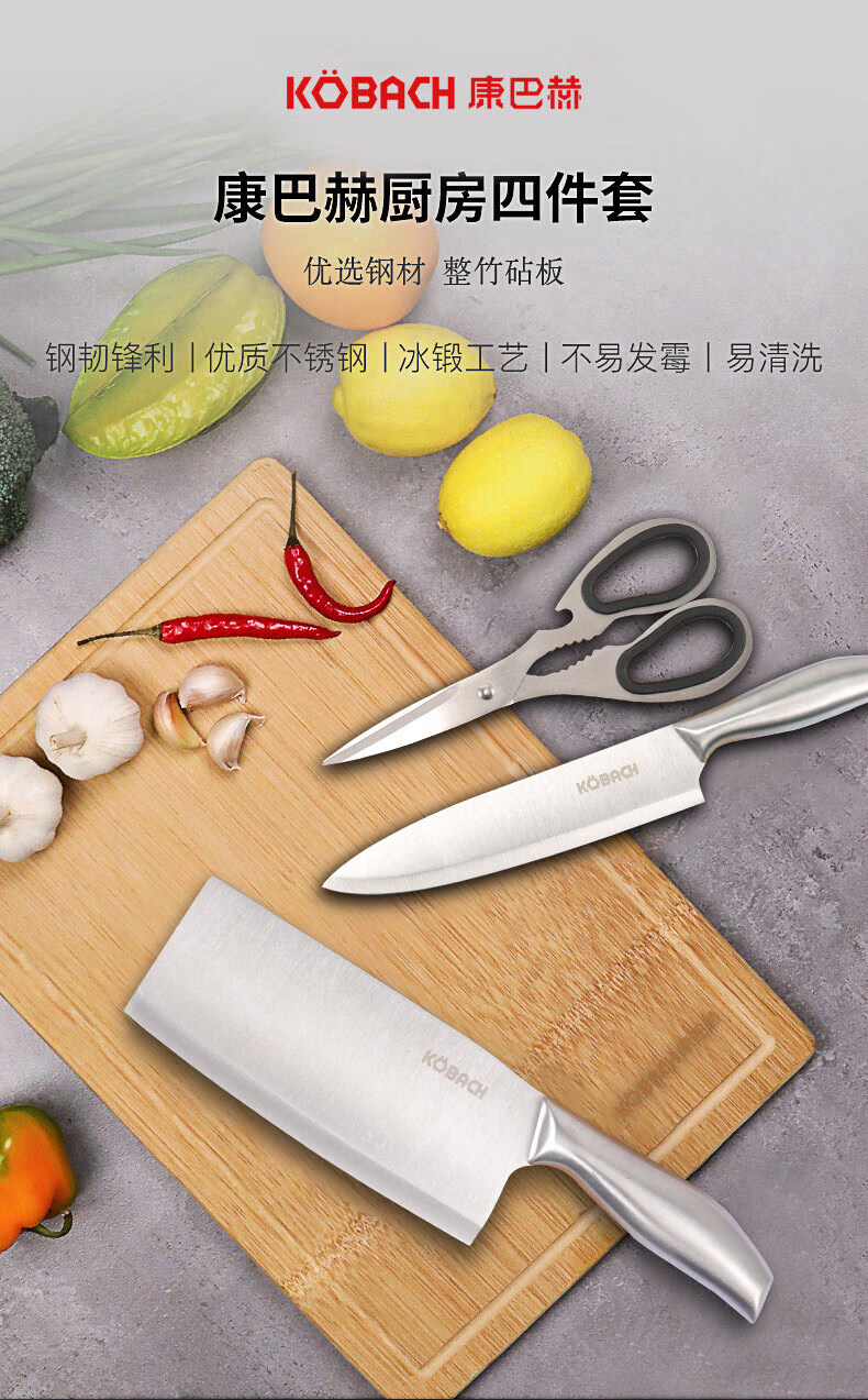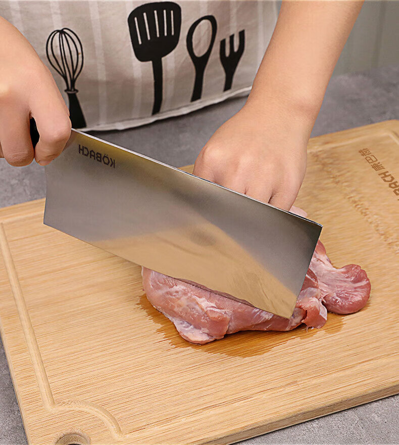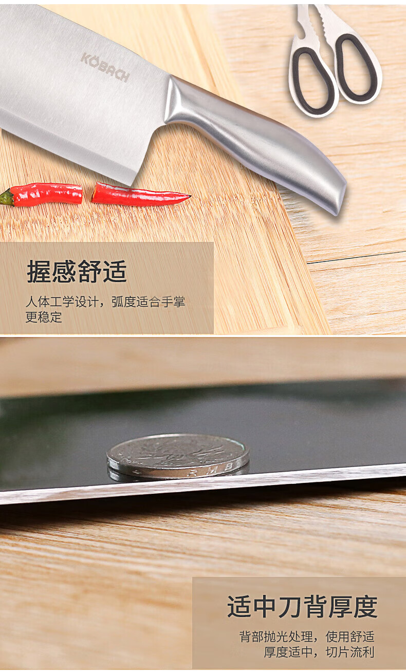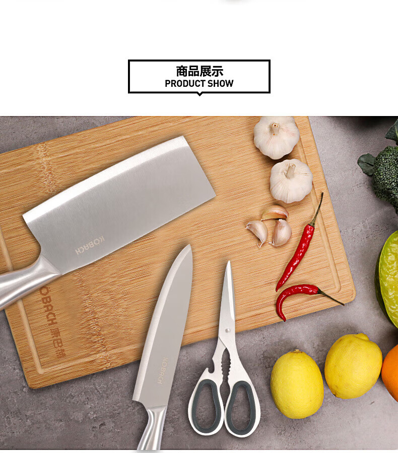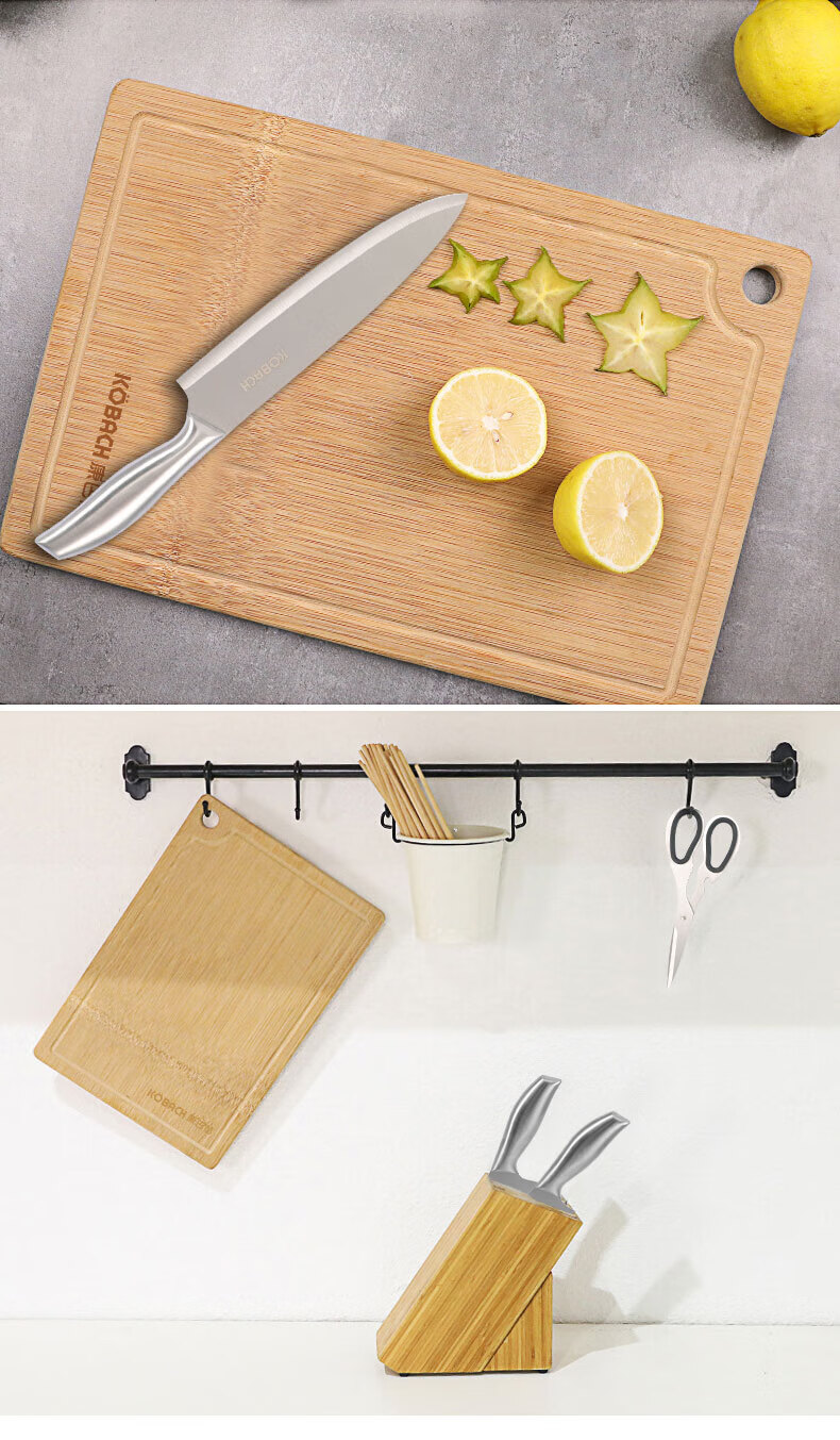 天然竹砧板:由整片竹子压铸而成;中式厨房必备的切片刀:精炼好钢;坚固锋利