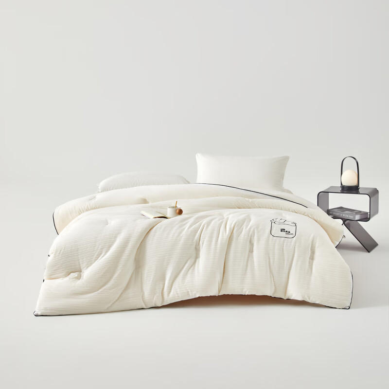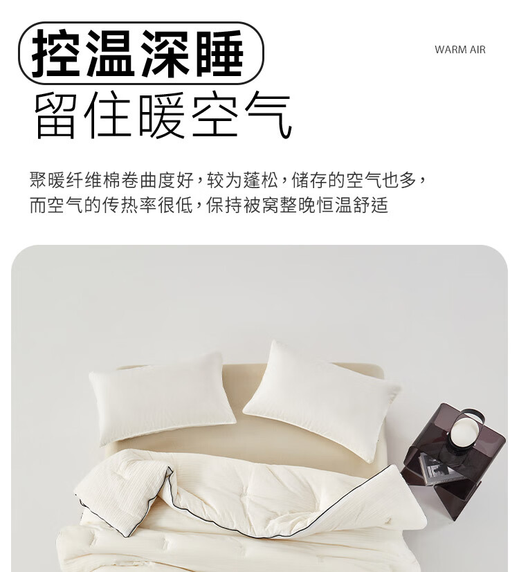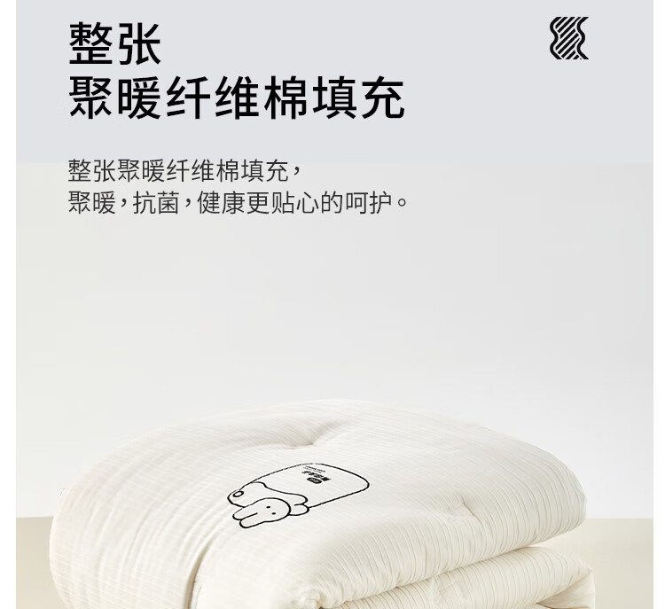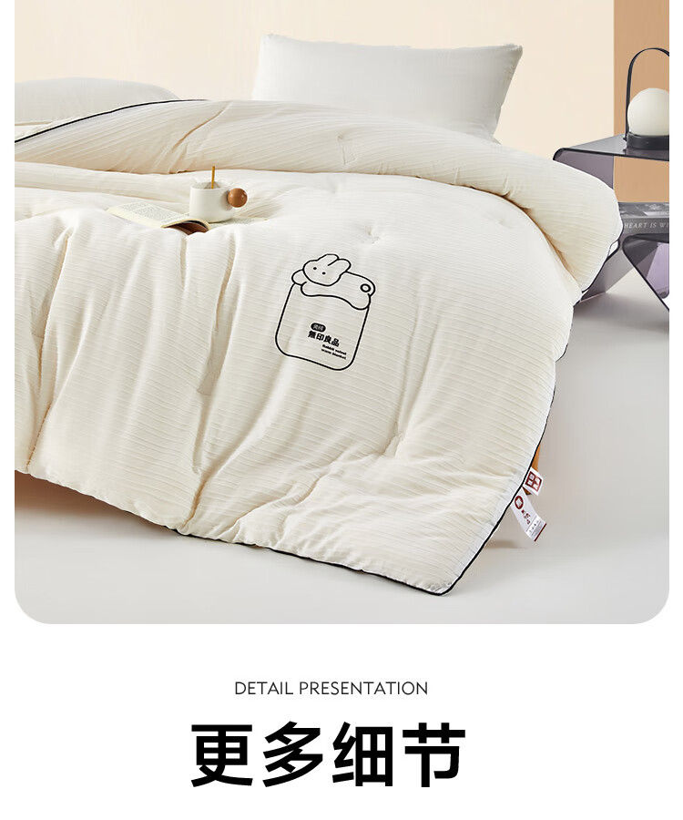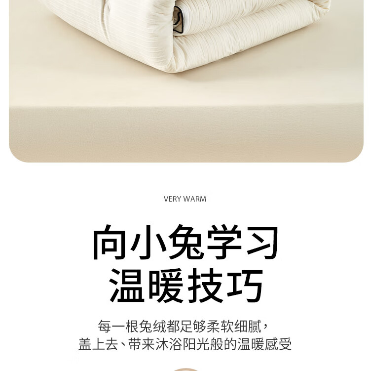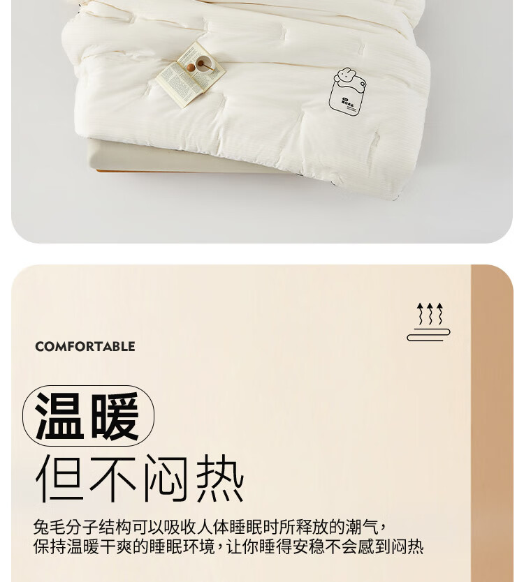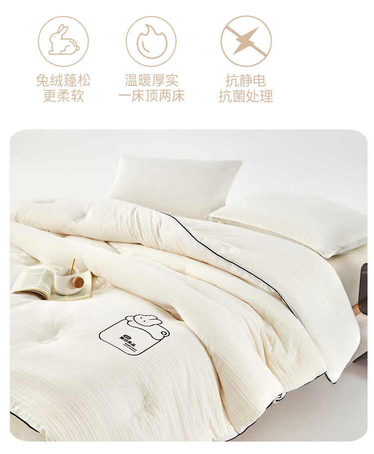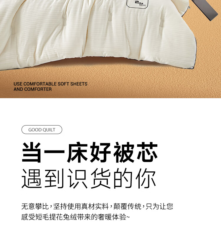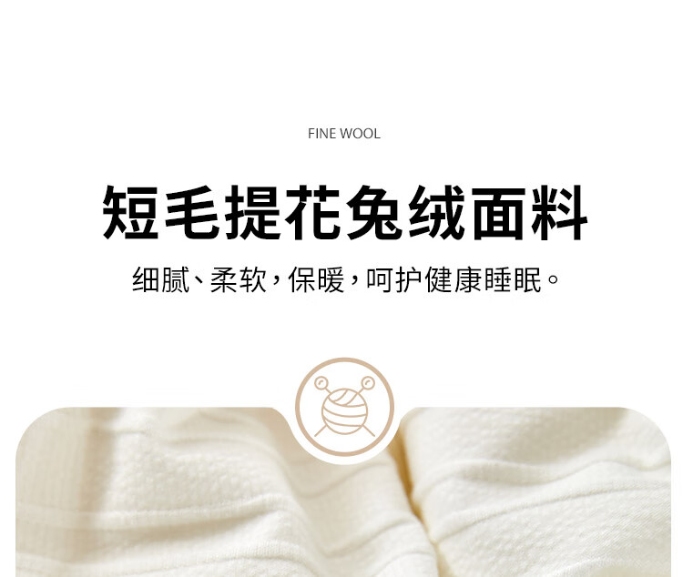 短毛提花兔绒面料,细腻、柔软,保暖,呵护健康睡眠;整张聚暖纤维棉填充,聚暖,抗菌,健康更贴心的呵护;高品质、高材质、高标准,一款对生活高度负责的产品