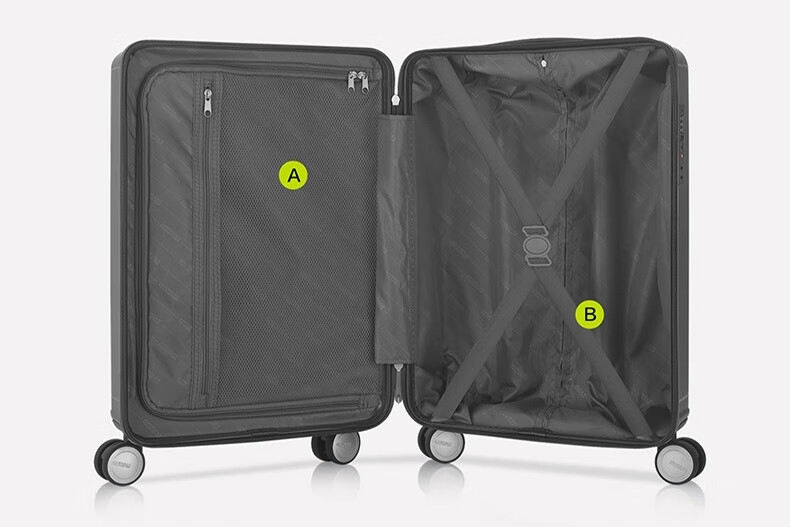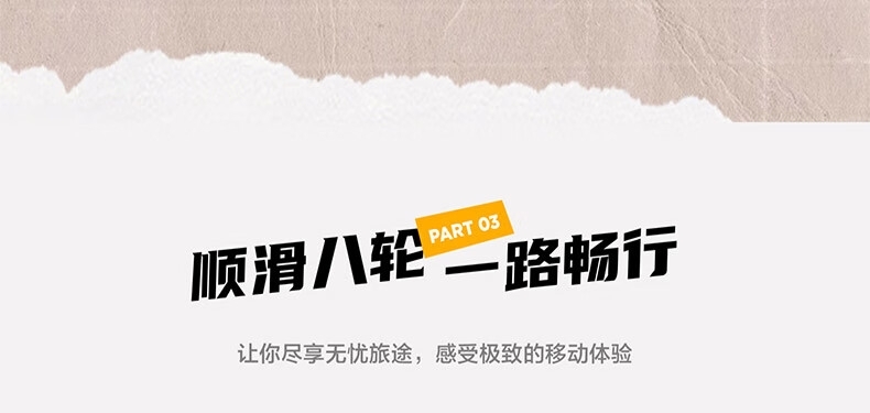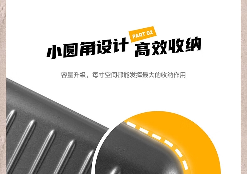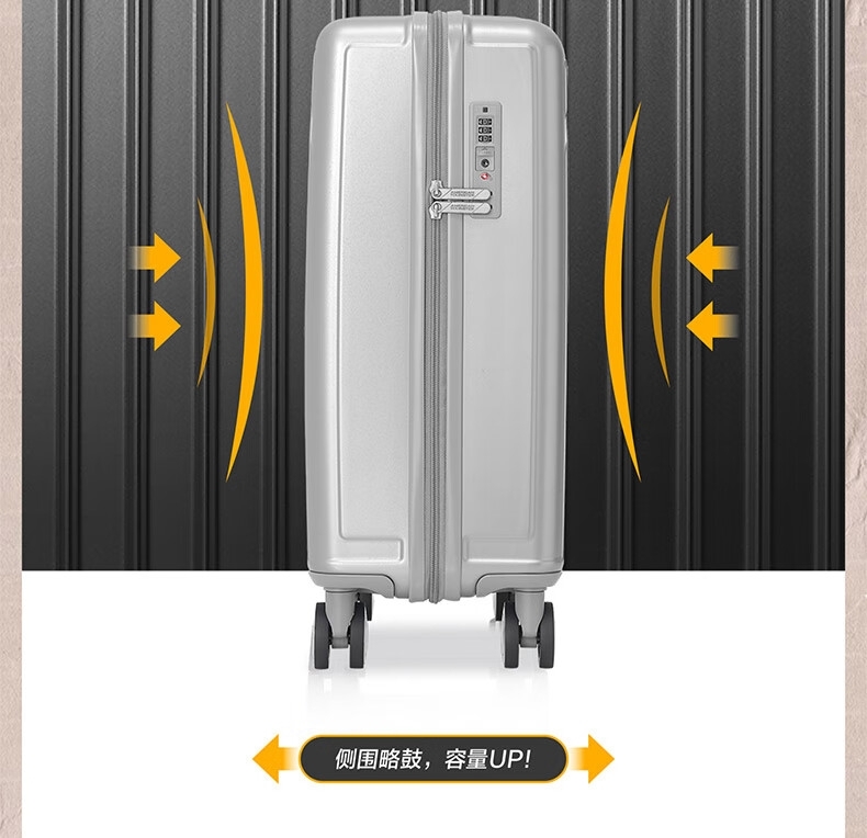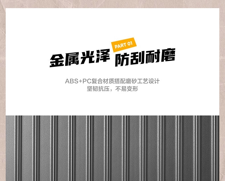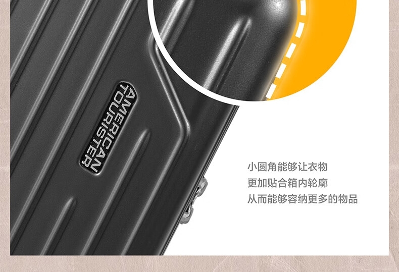 简约条纹设计,呈现金属光泽且防刮耐磨,;小圆角造型,贴合箱内轮廓,容纳更多的物品;嵌入式TSA密码锁