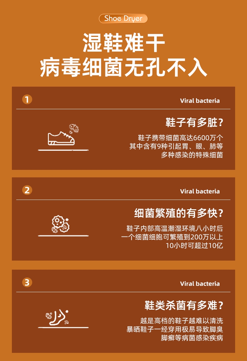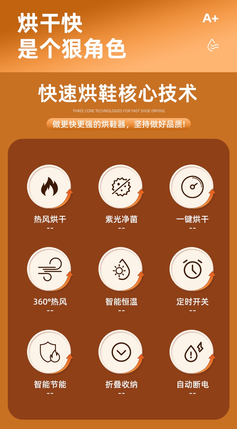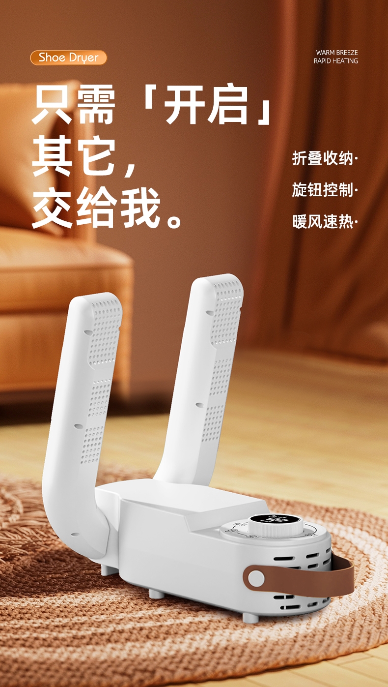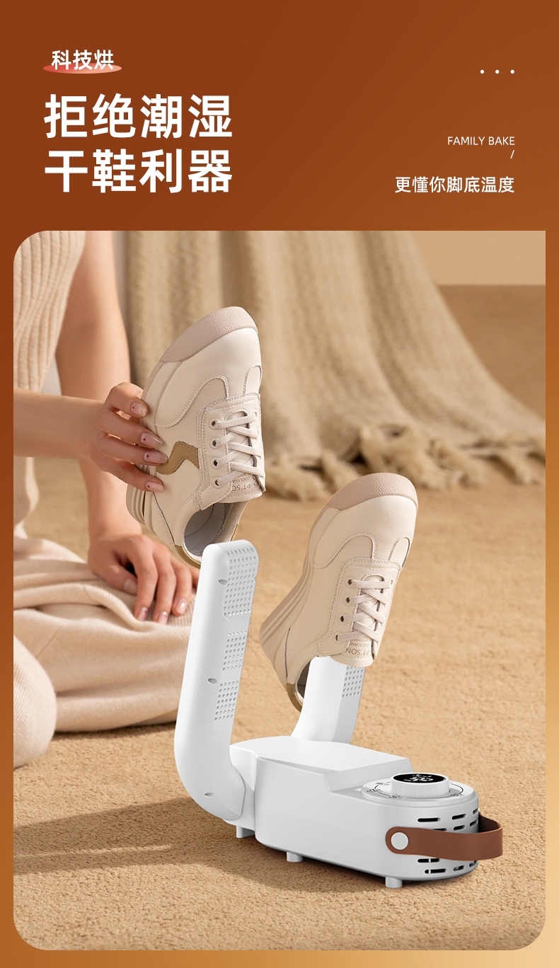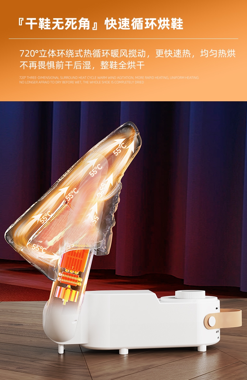 皮质提手设计,轻奢便携;;旋钮定时,无需值守,工作完自动断电;;紫光抑菌除臭,无死角;