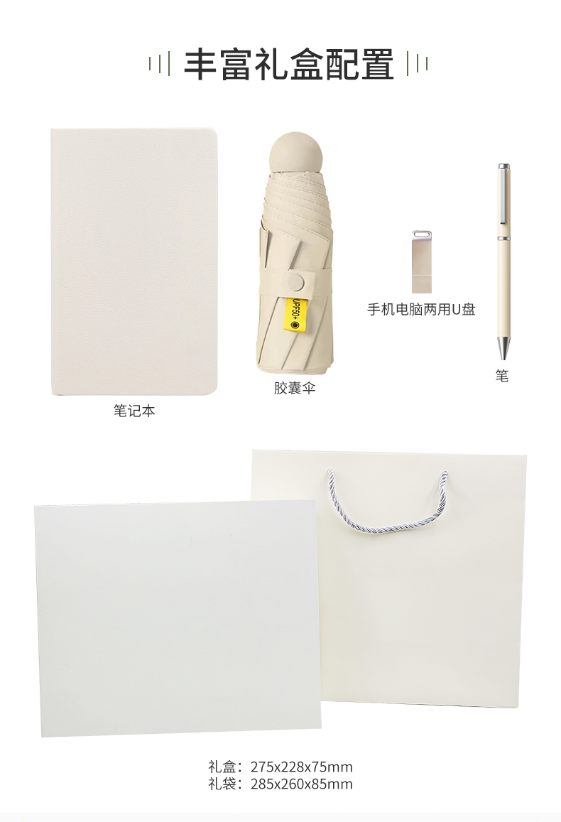 配置清单:笔记本*本、金属笔*1支、胶囊伞*1把、U盘*1个
