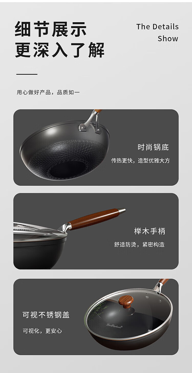 精铁材质制造,传热更快;手柄符合人体工学设计,美现实用,;可视破璃盖不锈钢包边,更安全牢固