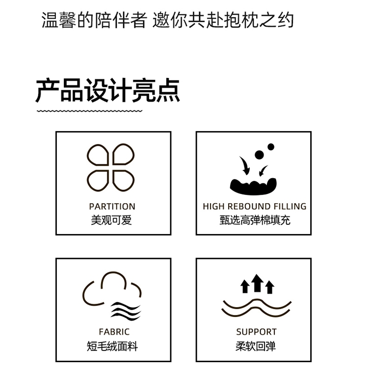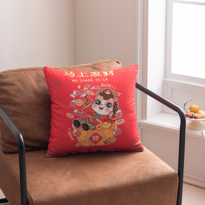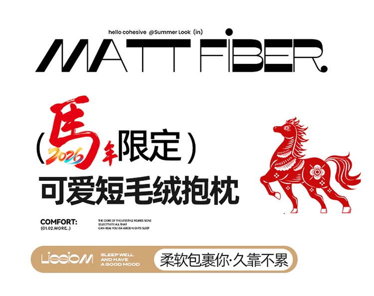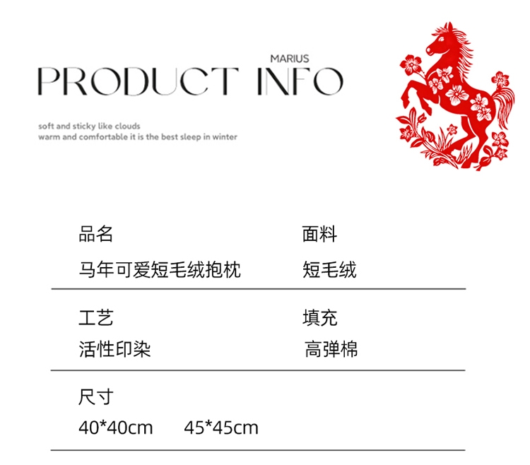 (马年限定)可爱短毛绒抱枕;超柔短毛绒面料不掉毛暖洋洋的触感;高克重短毛绒面料,丰满细腻的绒毛给肌肤柔软宠爱,