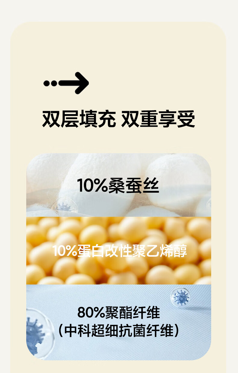 填充材质:10%蚕丝+10%大豆纤维+80%聚酯纤维