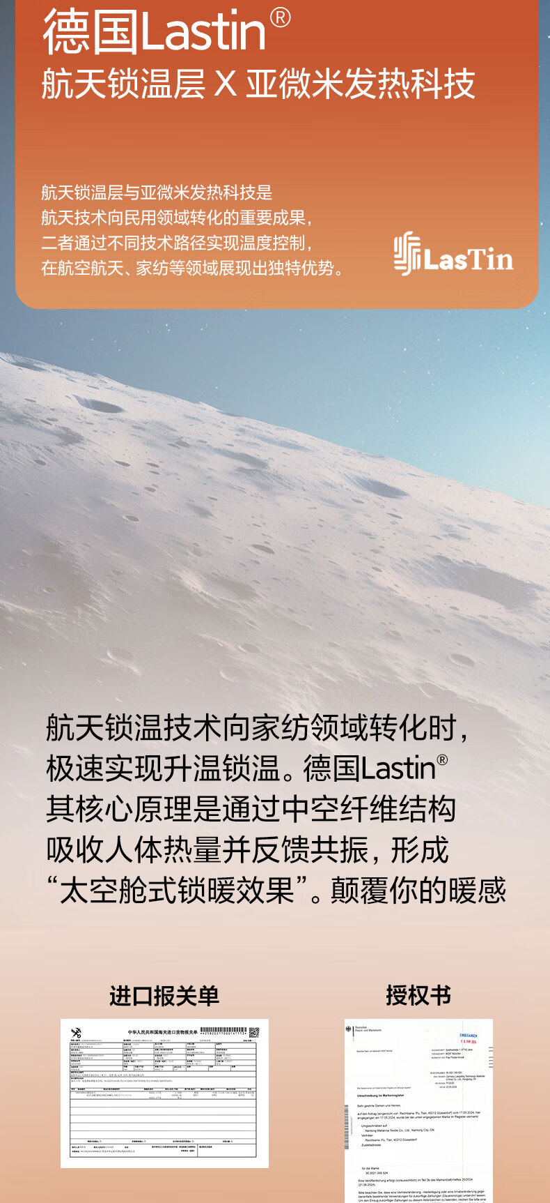 德国Lastin®航天锁温层与亚微米发热科技;二者通过不同技术路径实现温度控制;是航天技术向民用领域转化的重要成果;其核心原理是通过中空纤维结构吸收人体热量并反馈共振;保暖性高15%,强度比羊毛高1-2.5倍