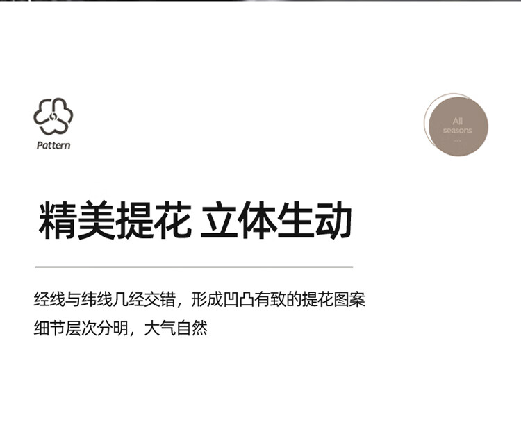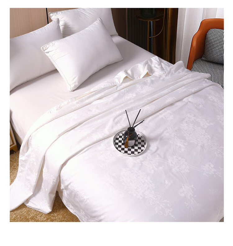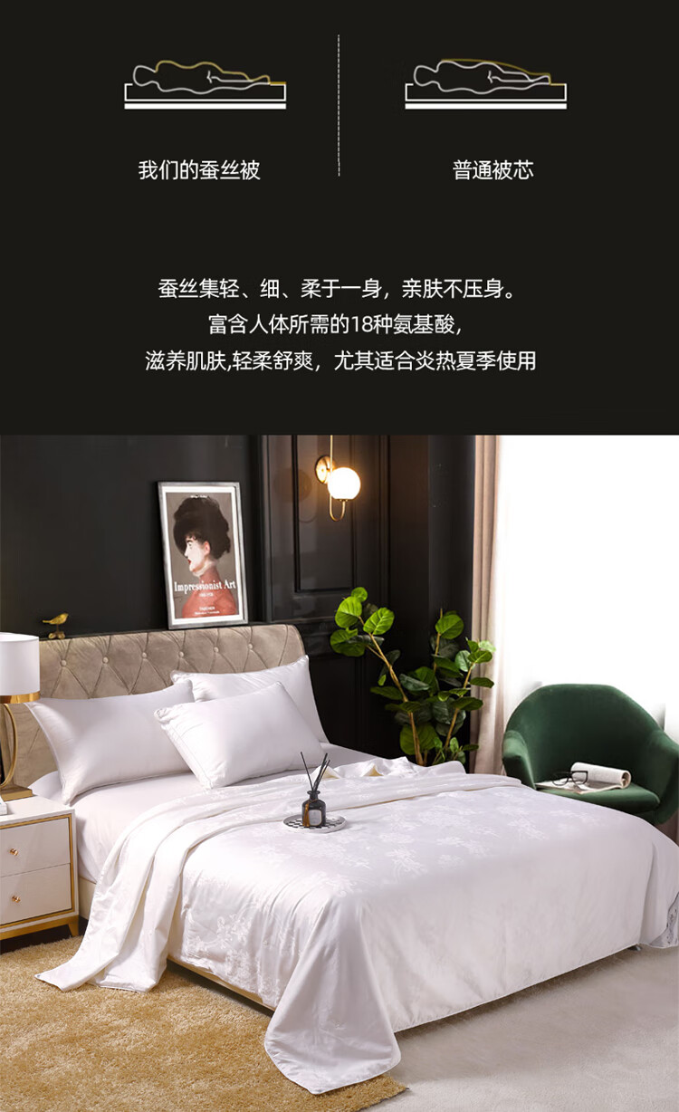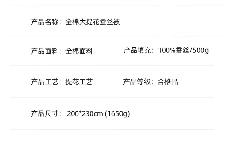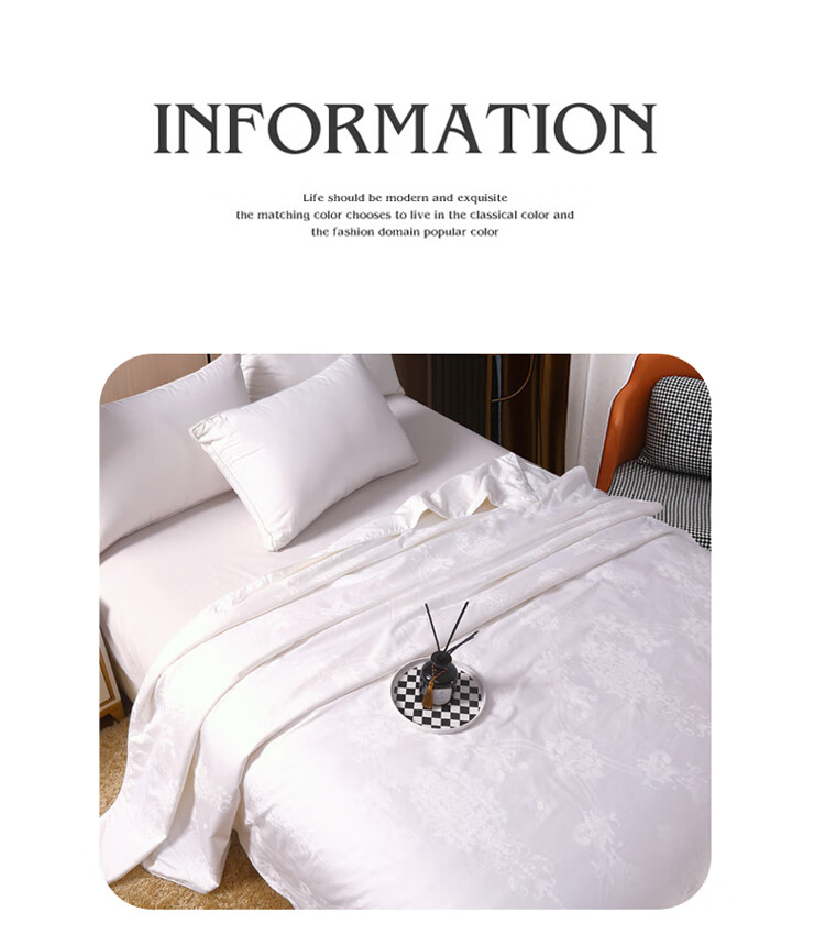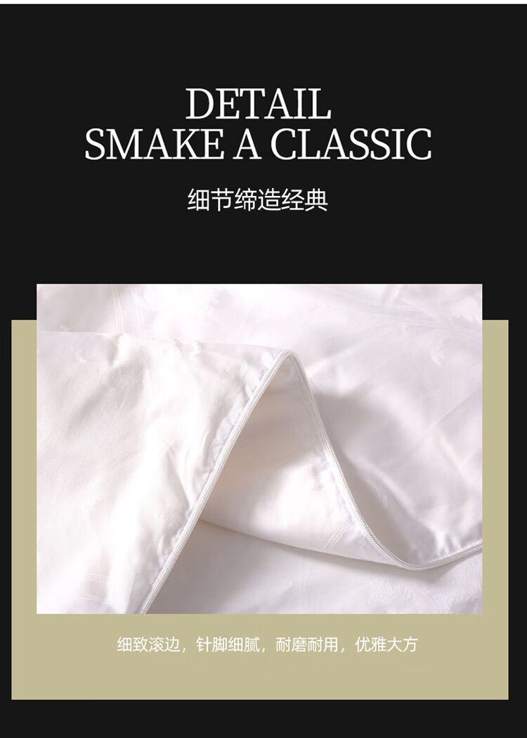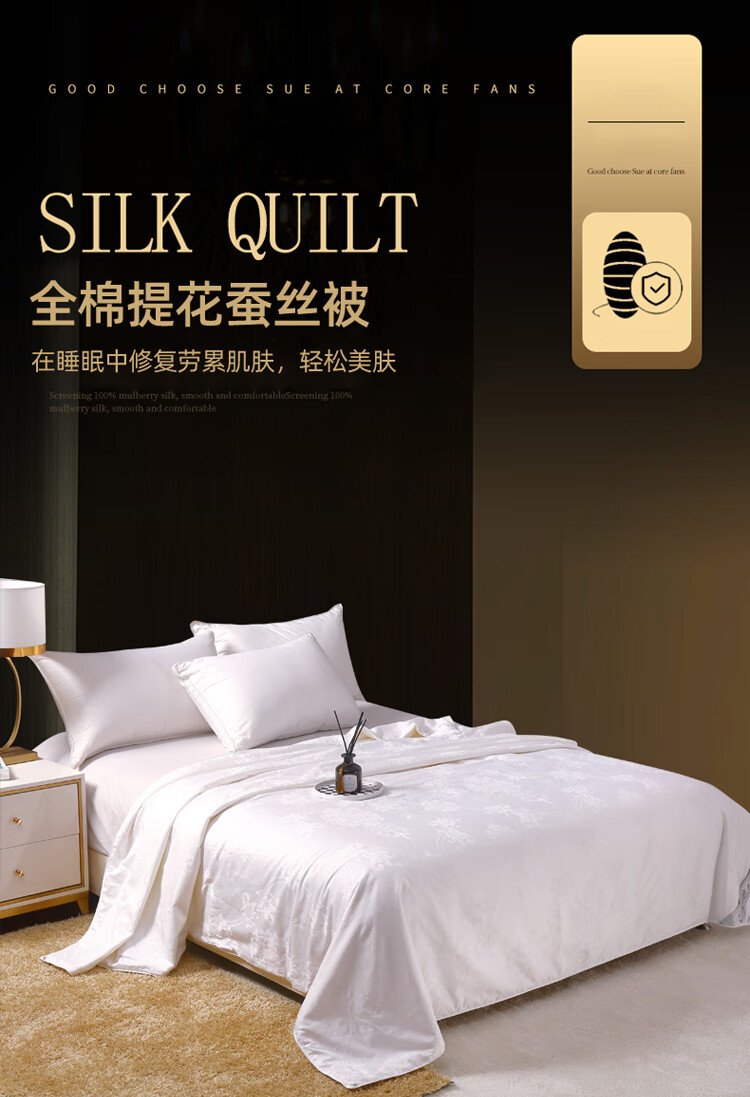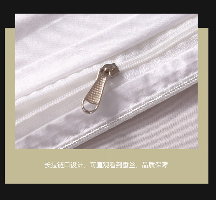 优质全棉贡缎大提花面料立体感强,透气舒适,亲肤有形;采用纯蚕丝长丝填充,轻盈透气,蓬松健康环保;有长拉链口可直观看到并可检测蚕丝,手工订花定位工艺