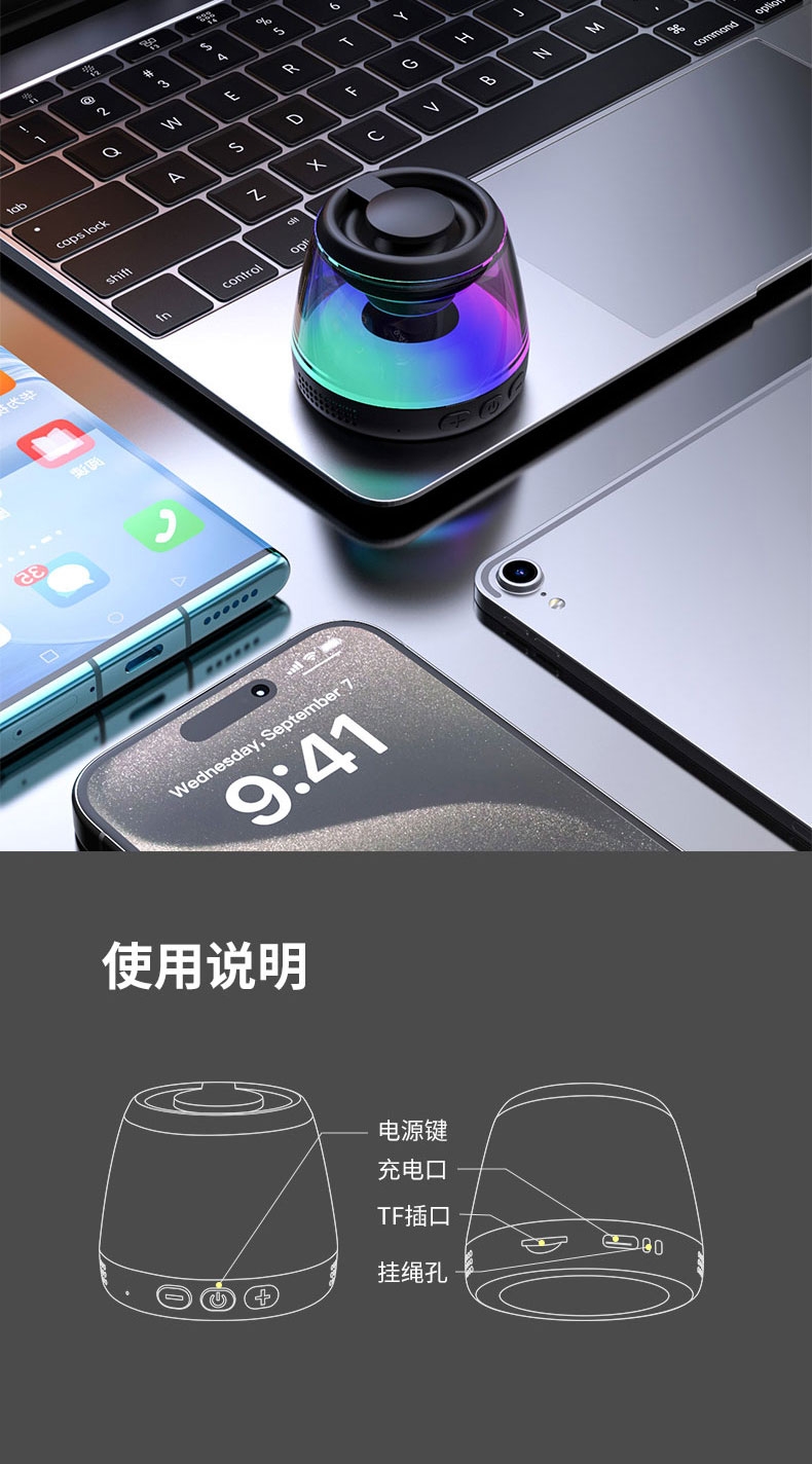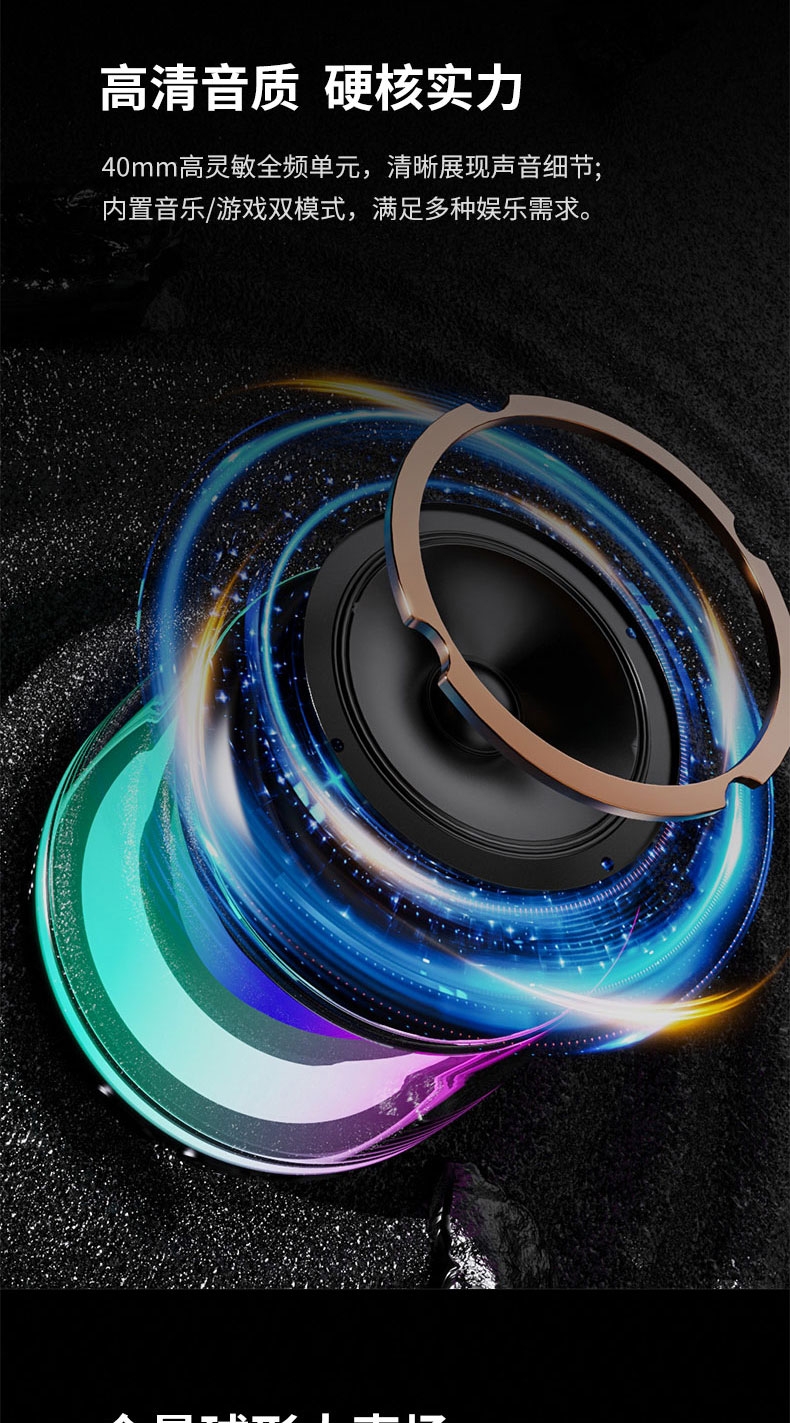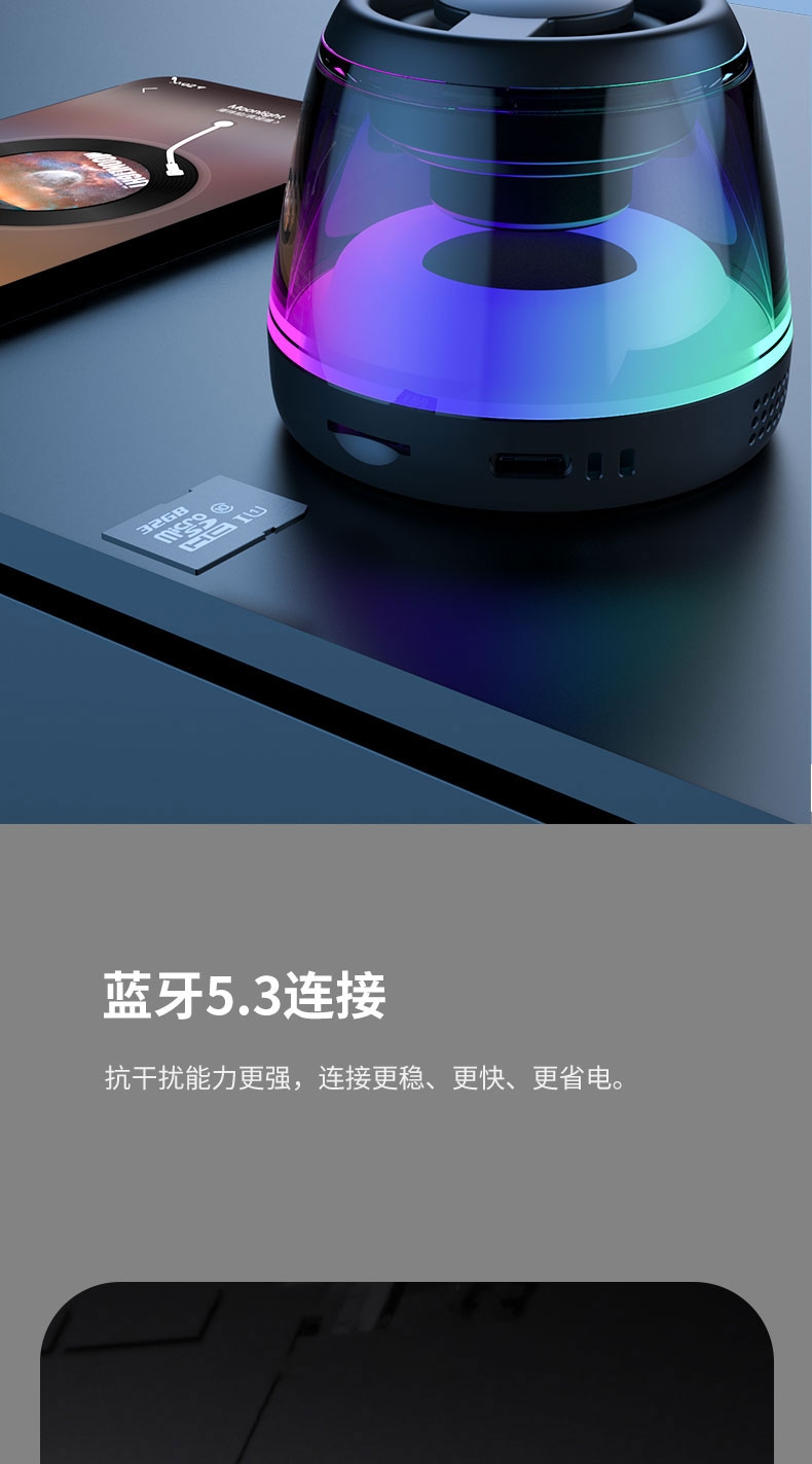 功能:插卡,语音提示,通话功能,重低音立体声,小夜灯,RGB灯效