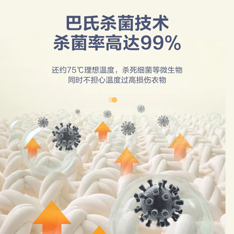 360°循环热风还原衣物自然蓬松;巴氏杀菌技术杀菌率高达99%;新升级分类晾衣架分类干衣更卫生;智能恒温护衣系统柔烘不伤面料不变形;180min定时烘干省心干衣无需看管