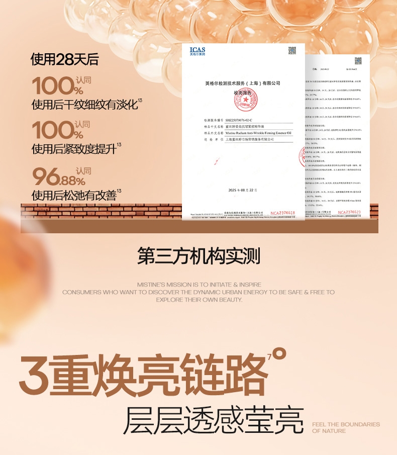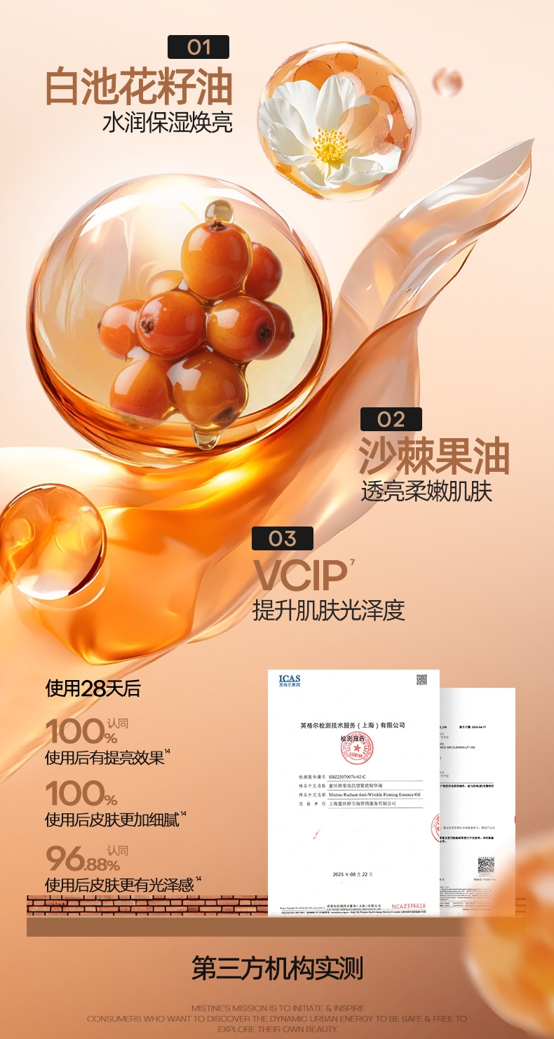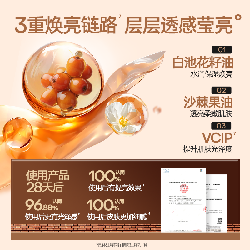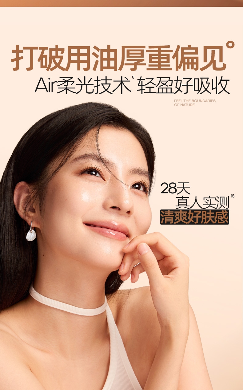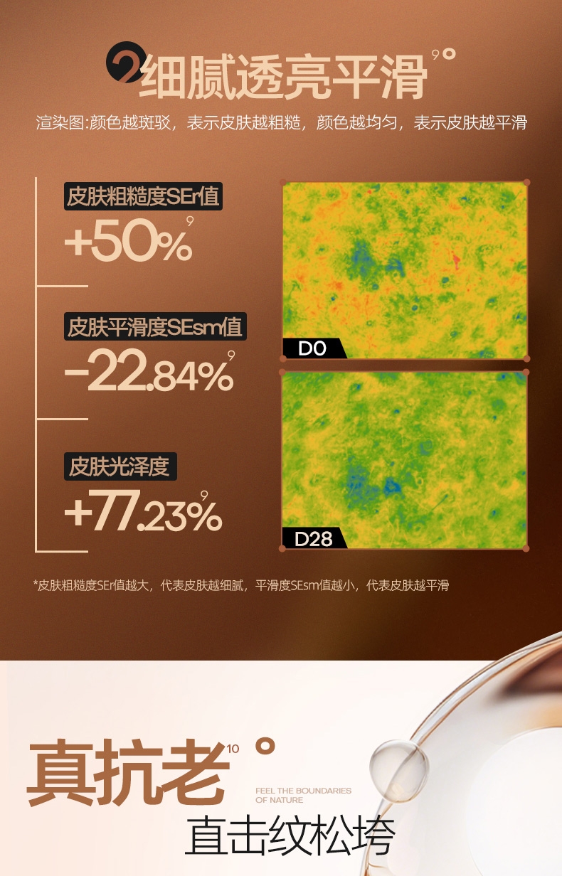 10分钟光感焕亮,14天紧致抗老;轻盈好吸收,打破用油厚重的偏见;五大不添加,敏感肌可用