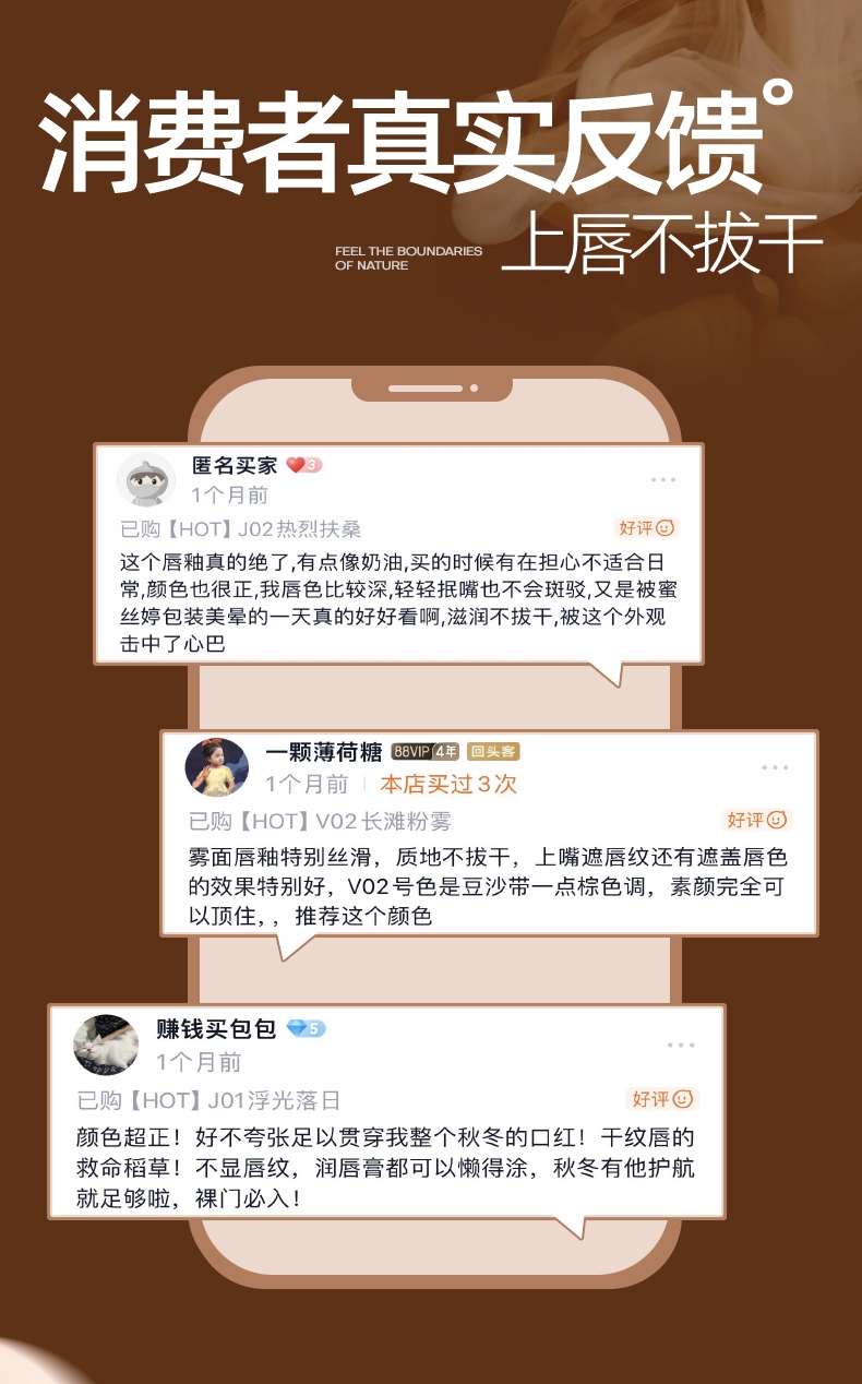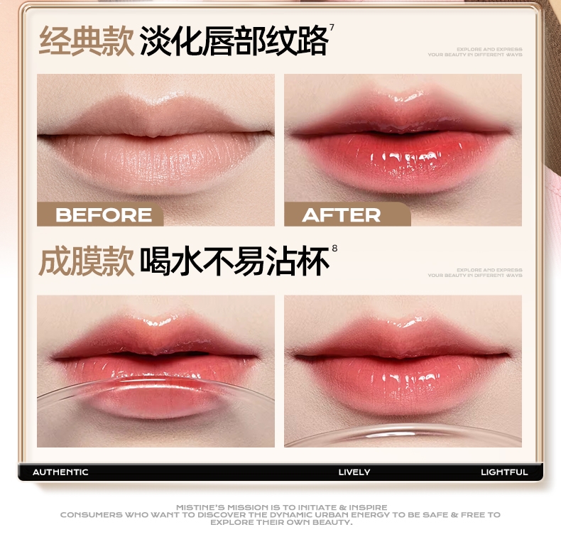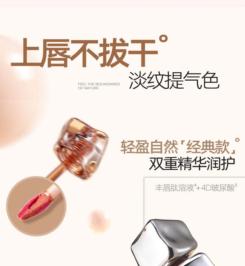 精华级唇釉,28天淡化唇纹;上唇不拔干,淡纹提气色;持久显色,不易沾杯