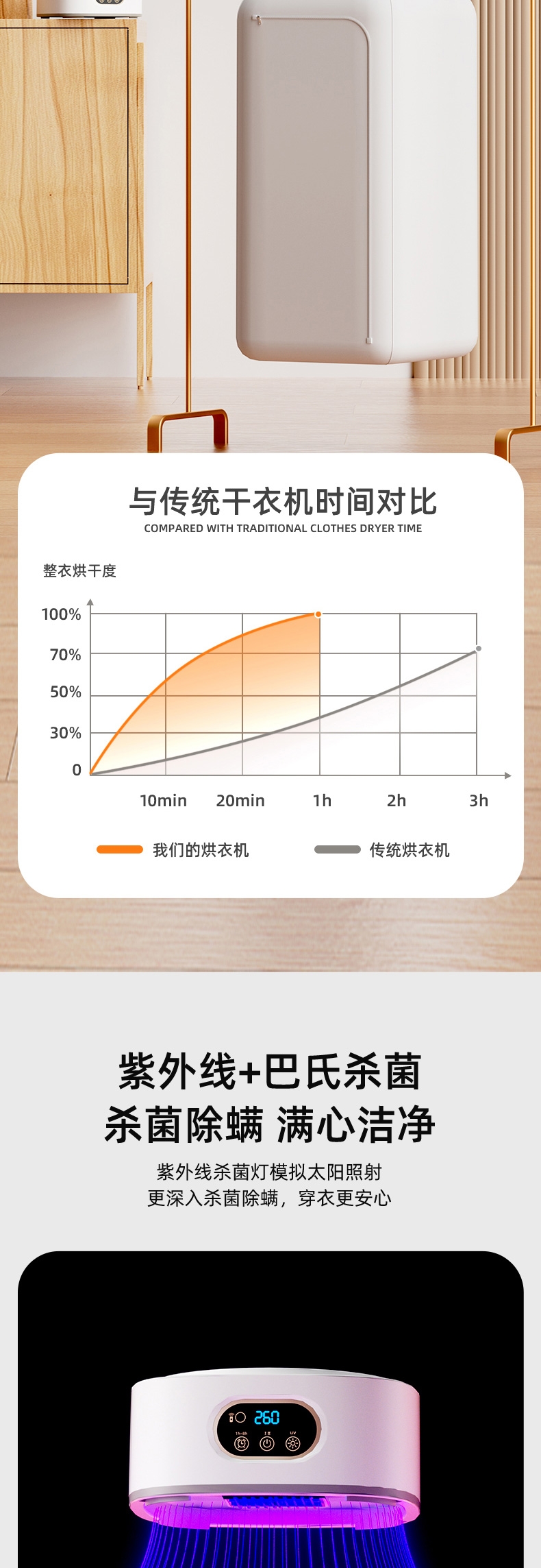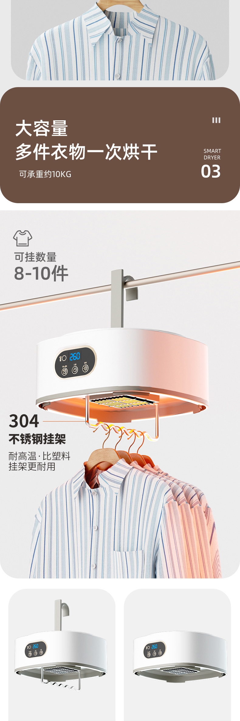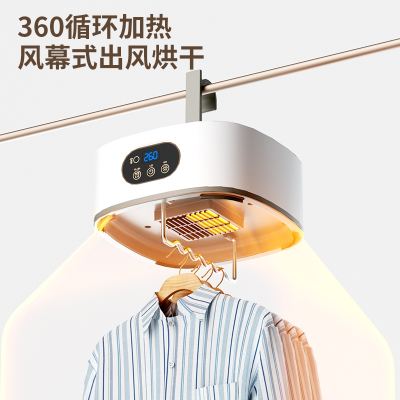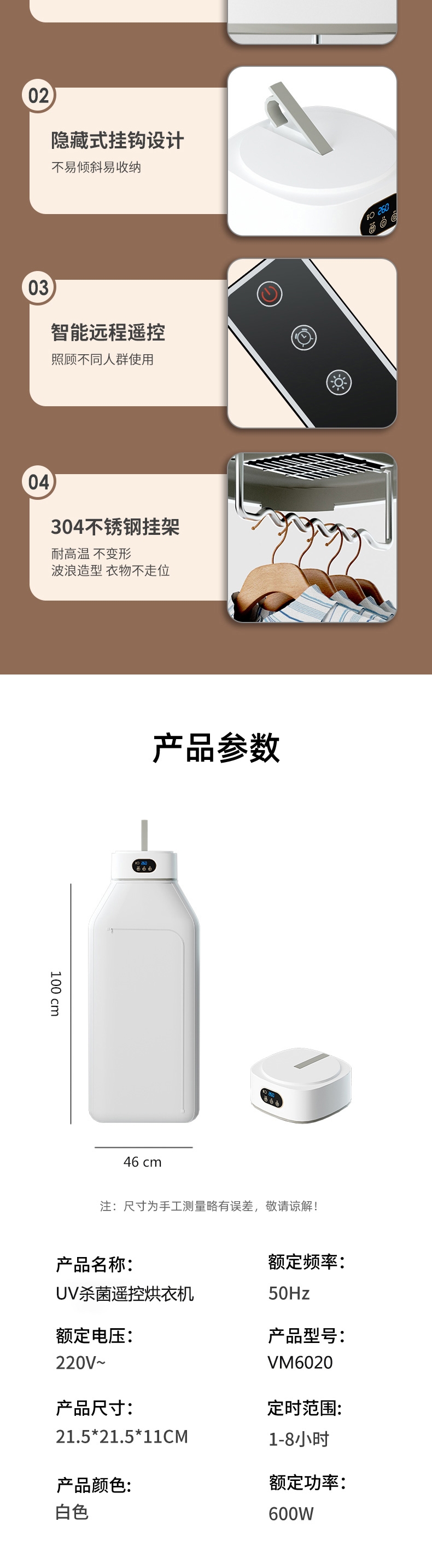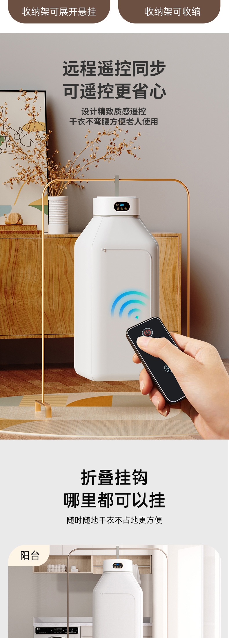 遥控操作,便携方便;双档调节,适用多种面料;紫外线UV杀菌灯,模拟太阳照射,穿衣更安心;304不锈钢挂架,耐高温更耐用,折叠收纳