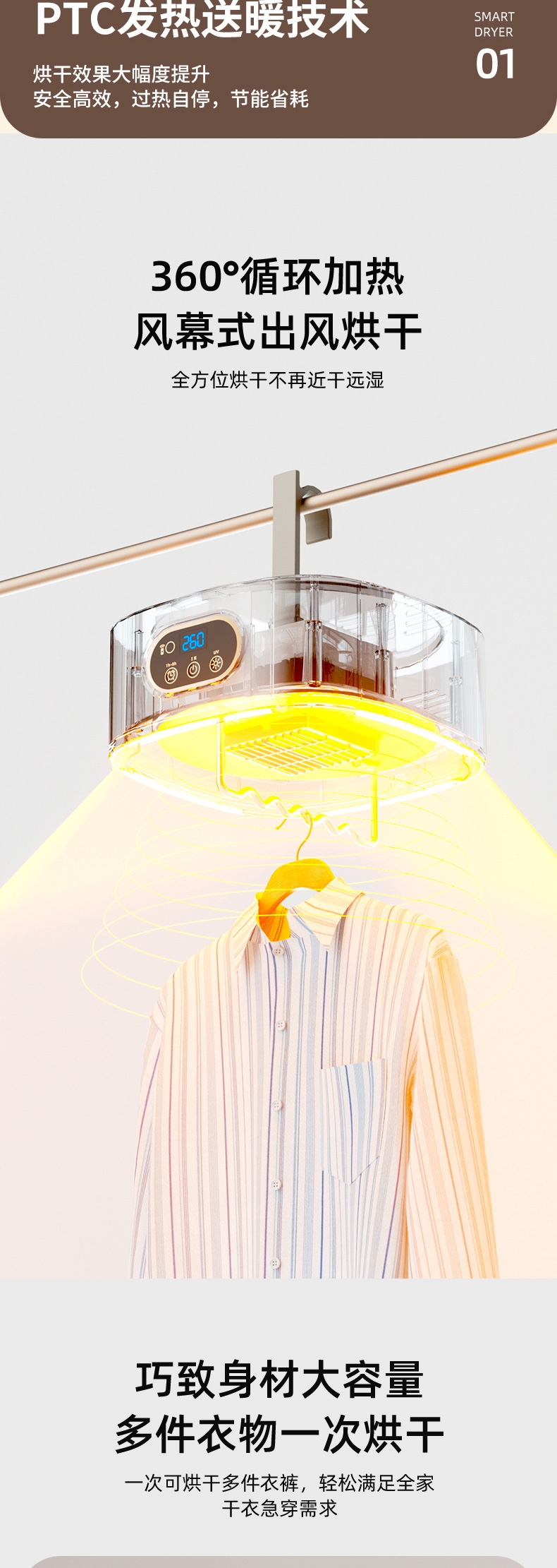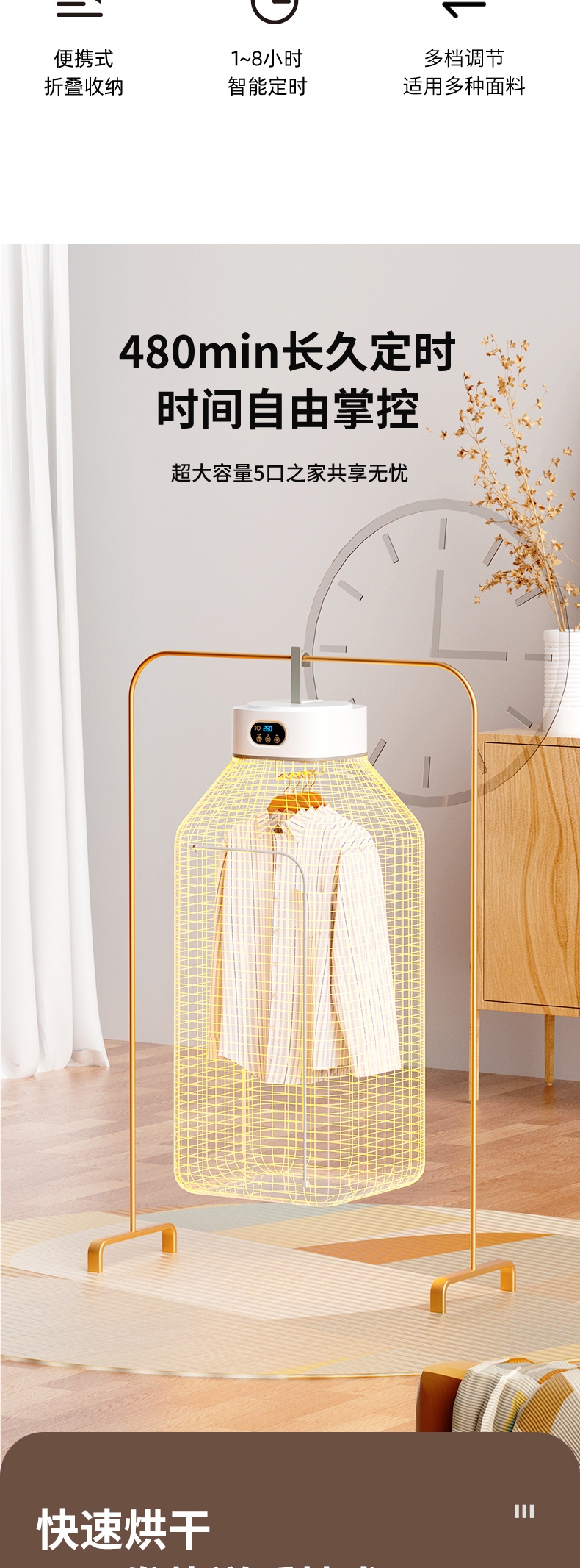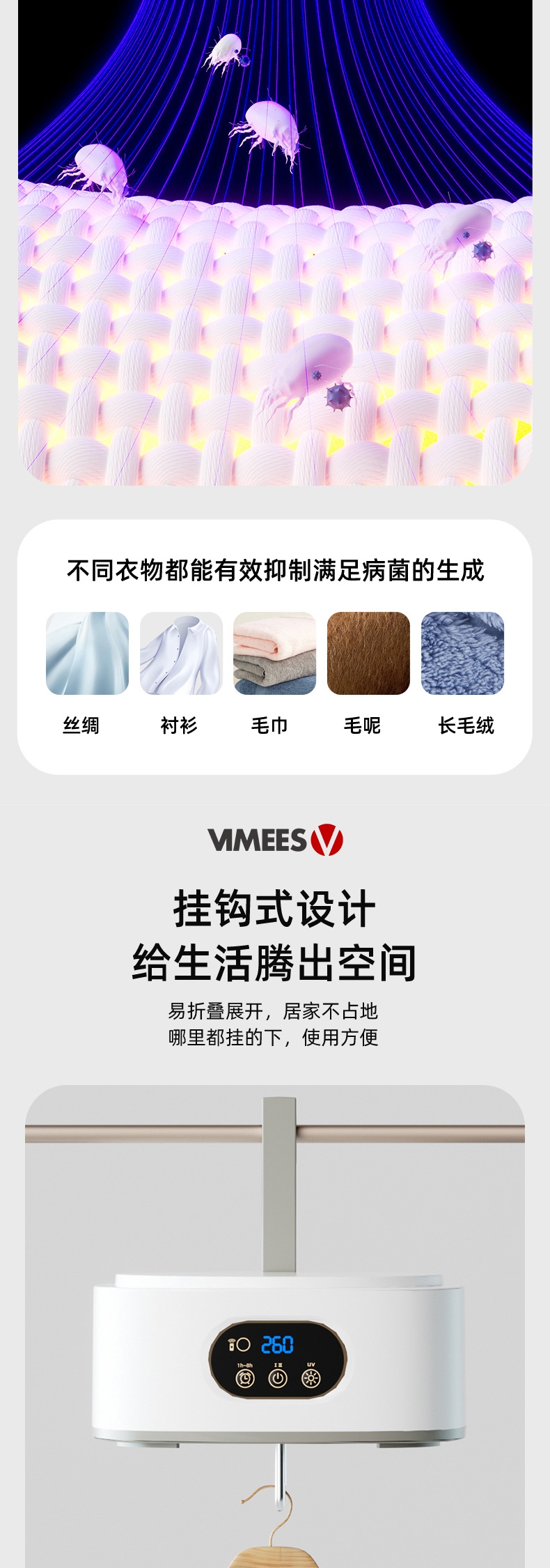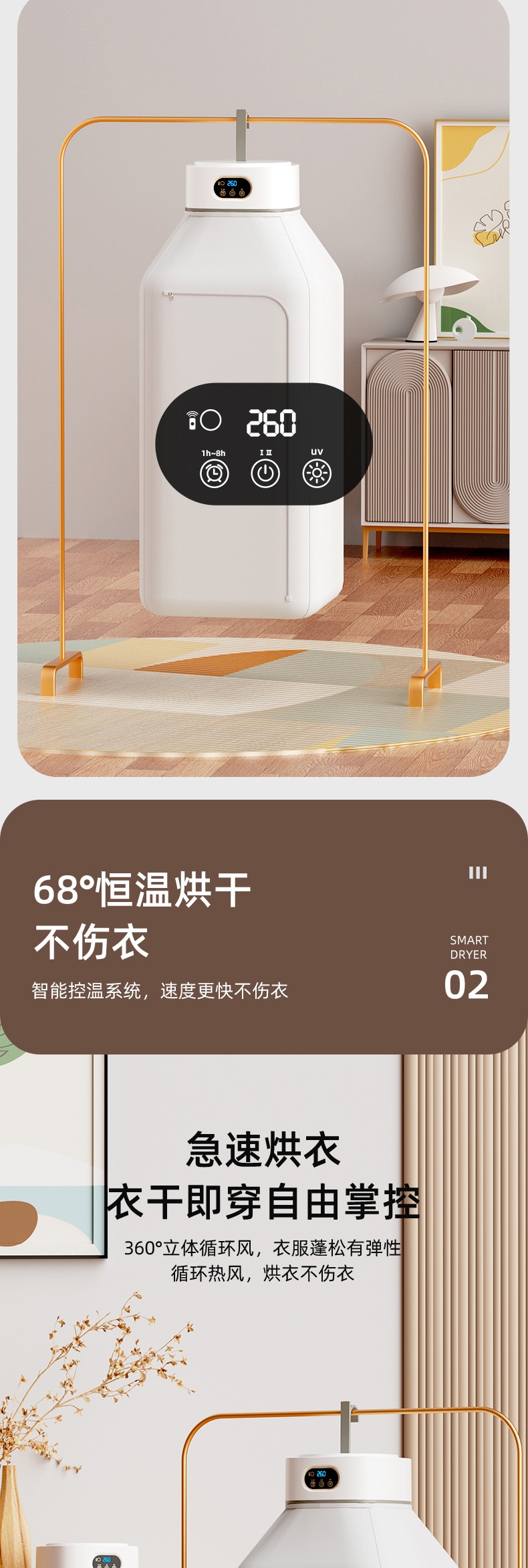 遥控操作,便携方便;双档调节,适用多种面料;紫外线UV杀菌灯,模拟太阳照射,穿衣更安心;304不锈钢挂架,耐高温更耐用,折叠收纳