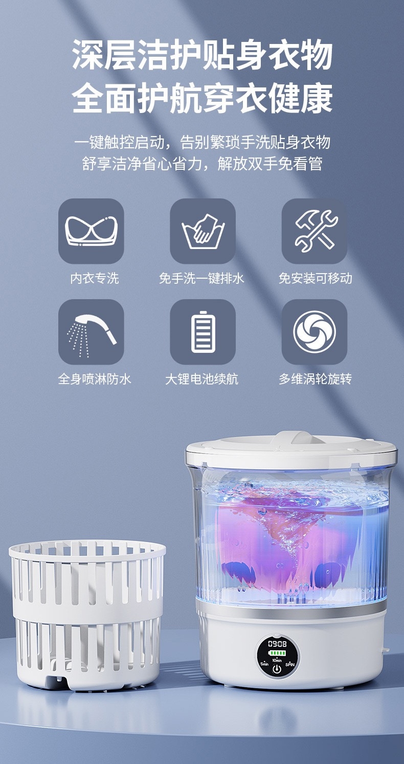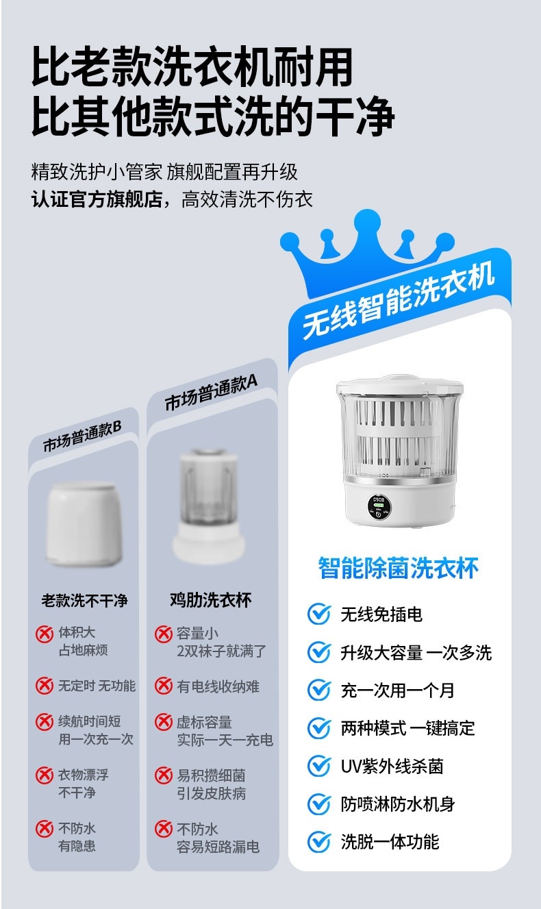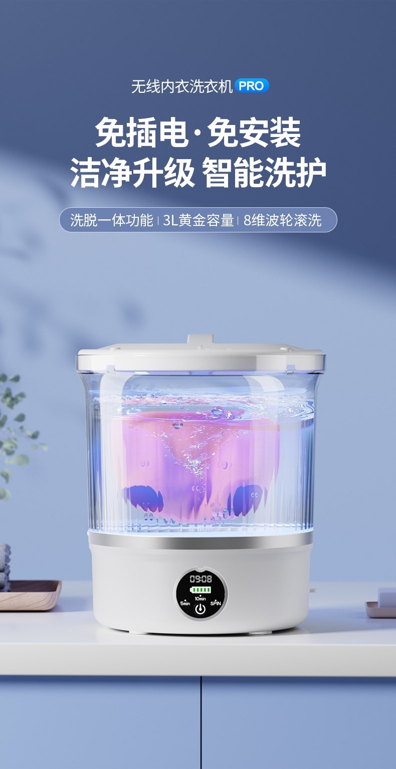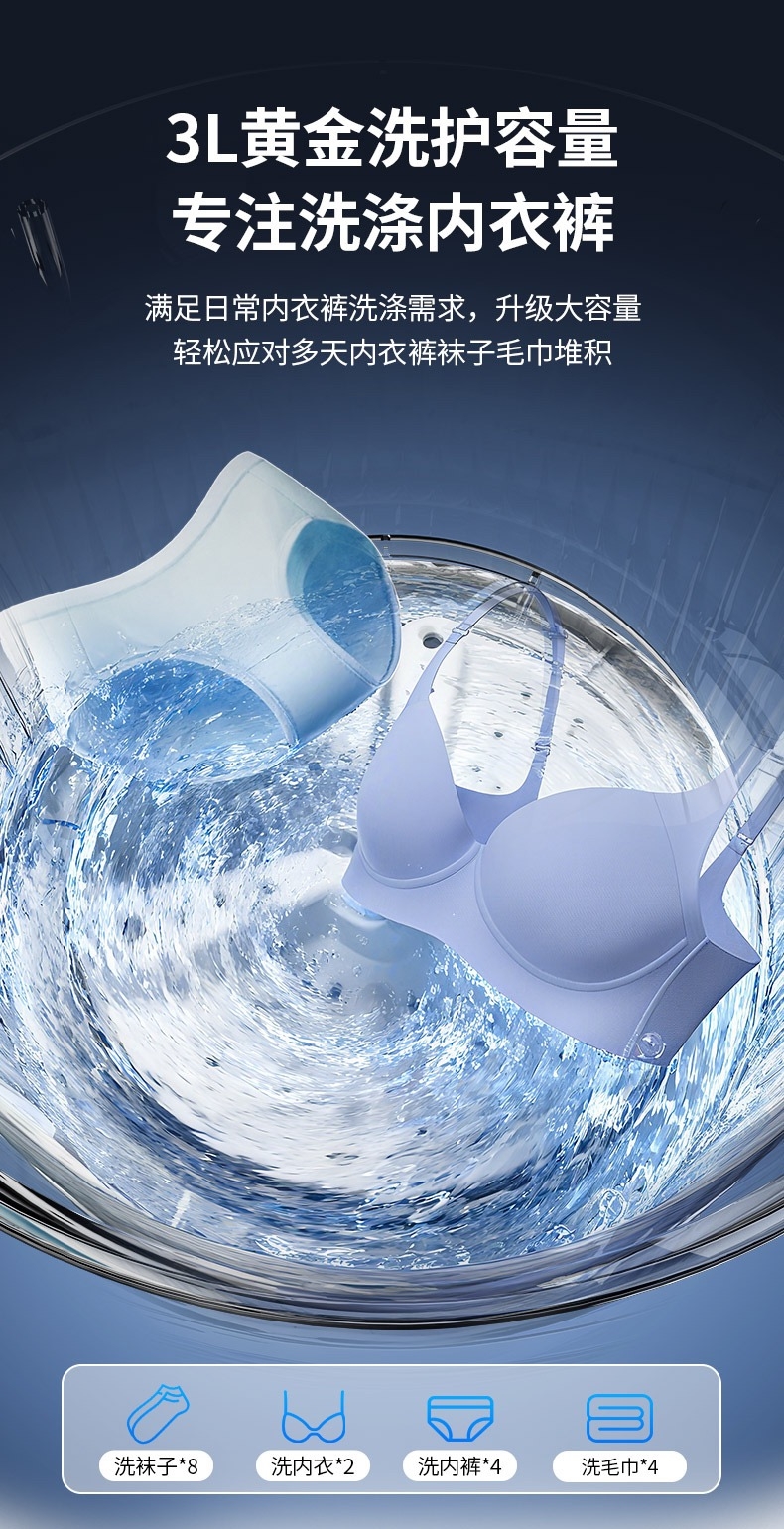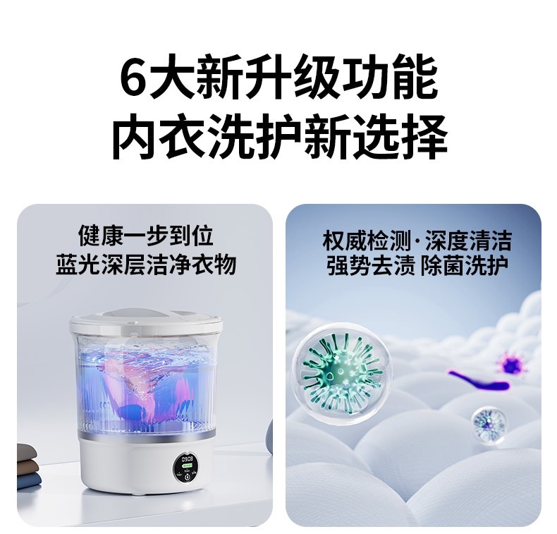 无线便携3L大容量电池续航久;蓝光杀菌深层清洗袜子内衣内裤小孩围巾等等;免插电免安装洁净升级智能洗护