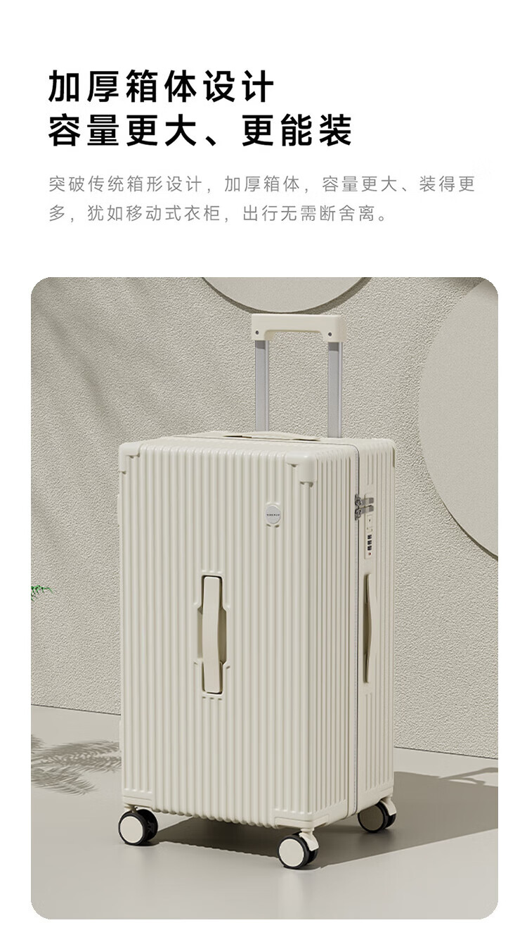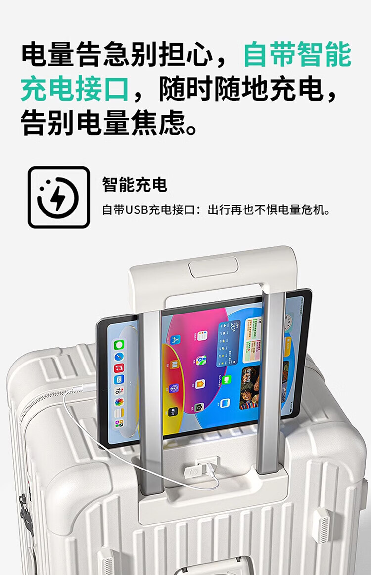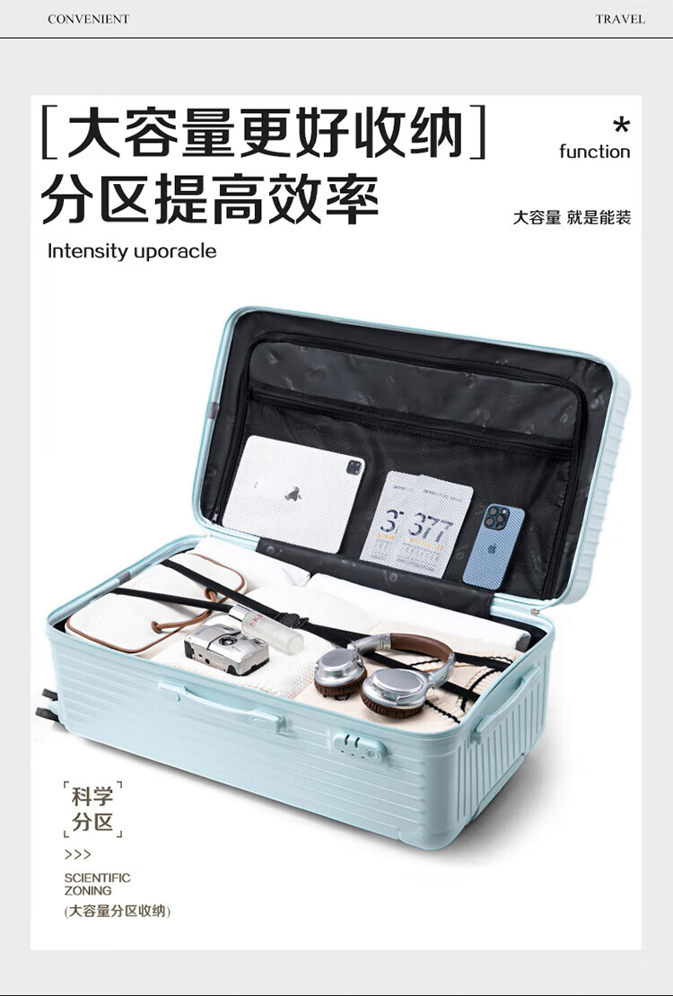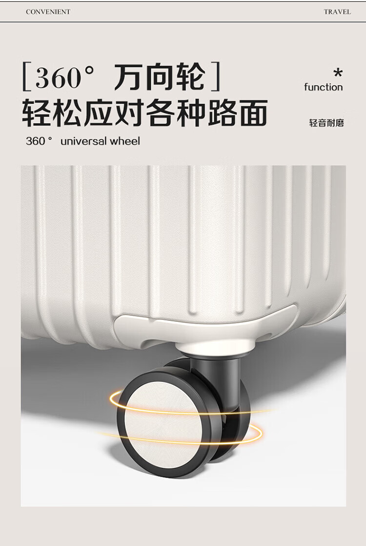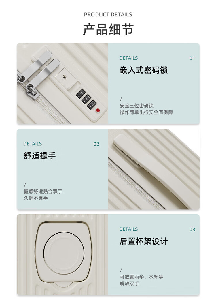 侧脚座挂钩设计,解放双手;采用嵌入式密码锁设计,有效降低撞击的可能性;静音双排飞机轮