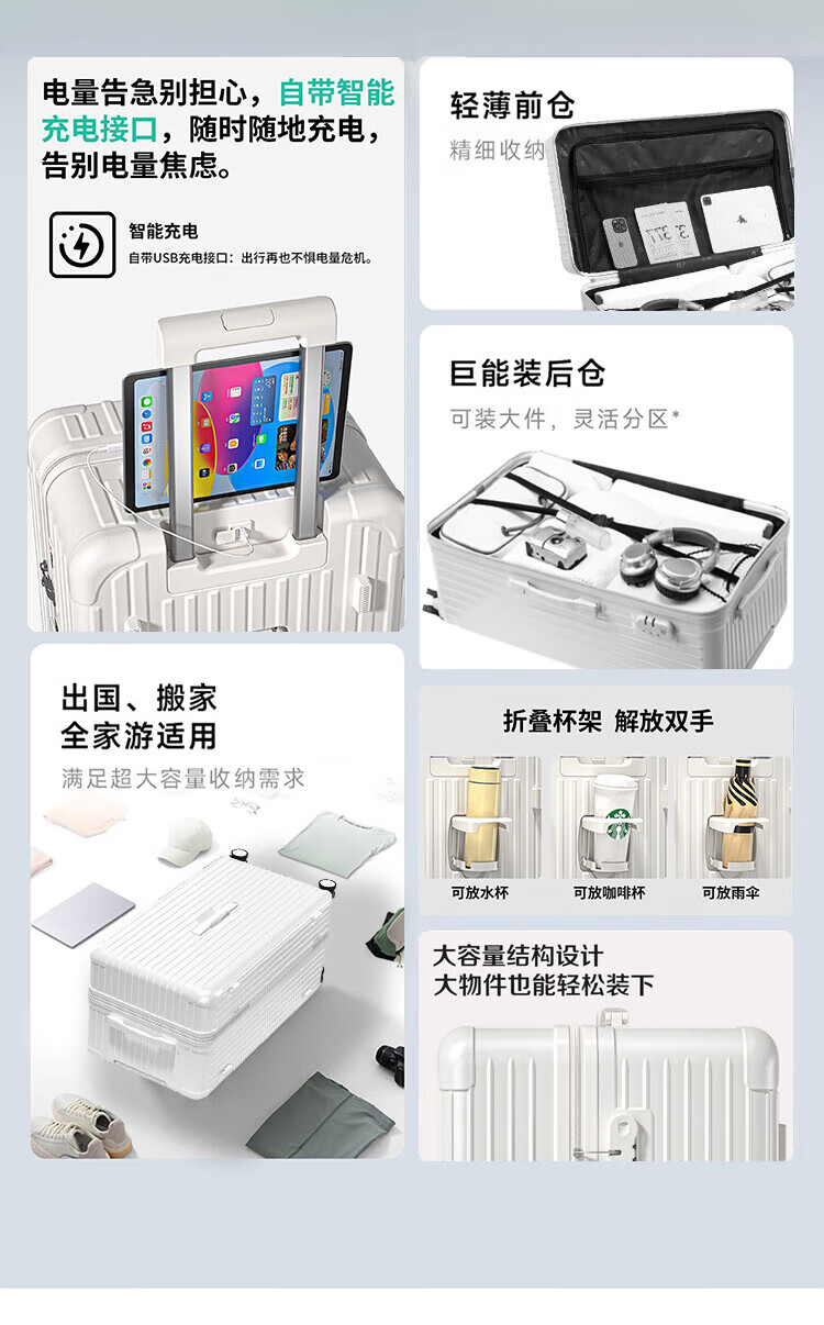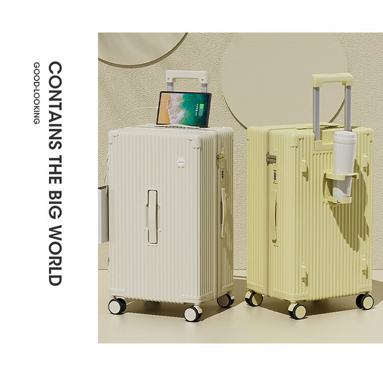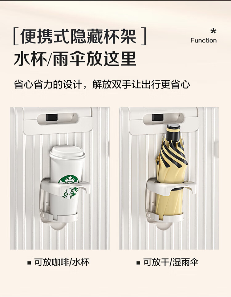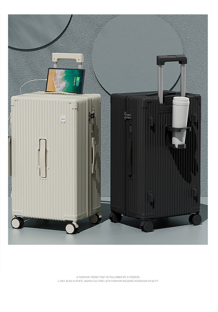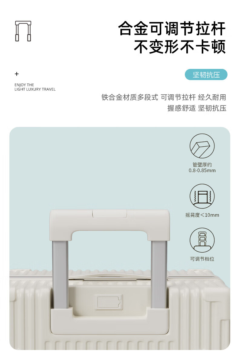 侧脚座挂钩设计,解放双手;采用嵌入式密码锁设计,有效降低撞击的可能性;静音双排飞机轮