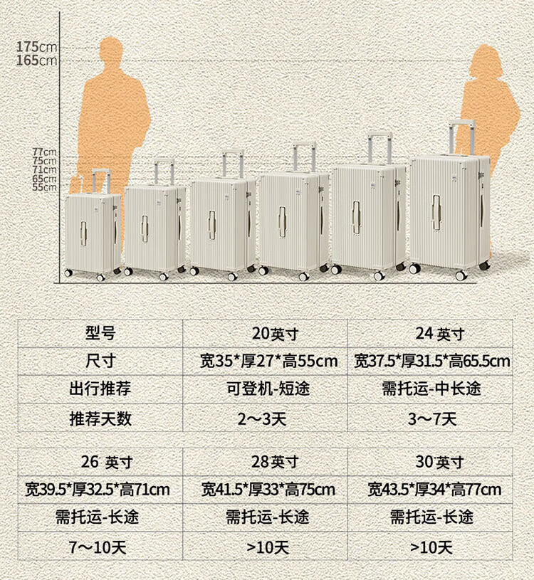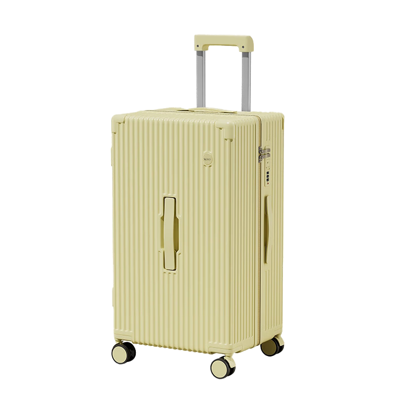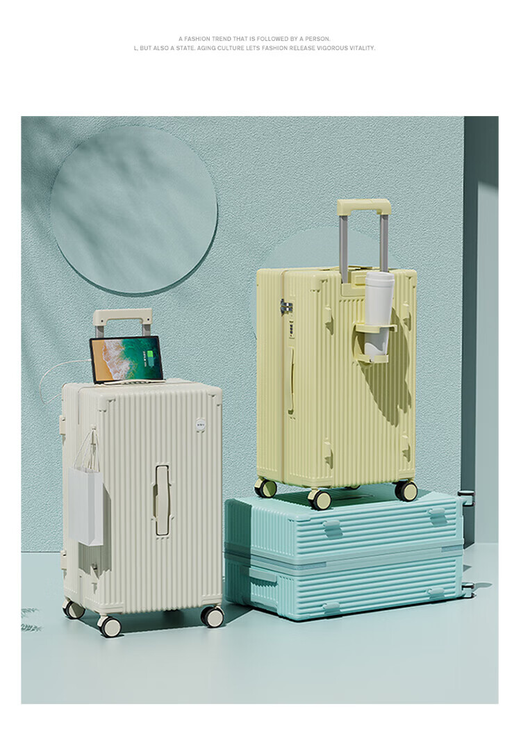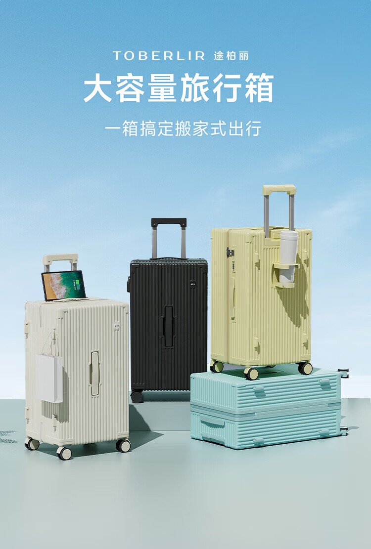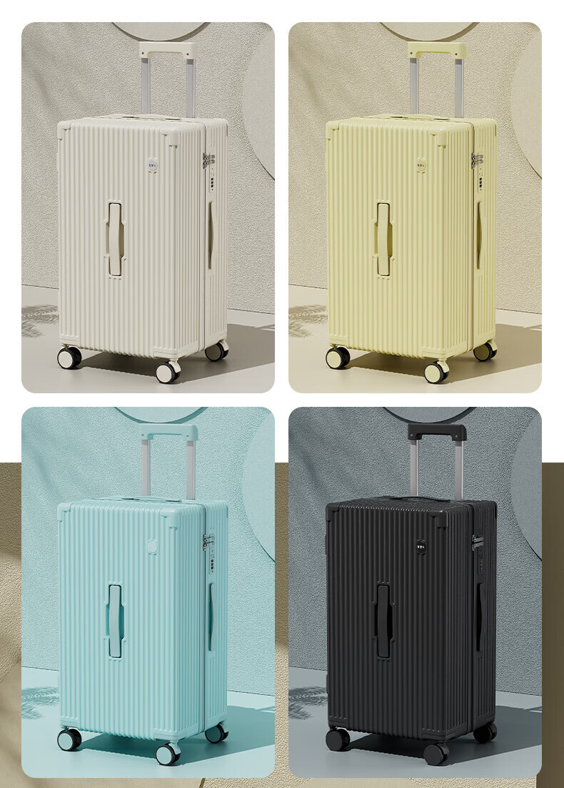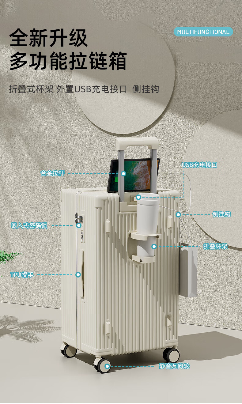 侧脚座挂钩设计,解放双手;采用嵌入式密码锁设计,有效降低撞击的可能性;静音双排飞机轮