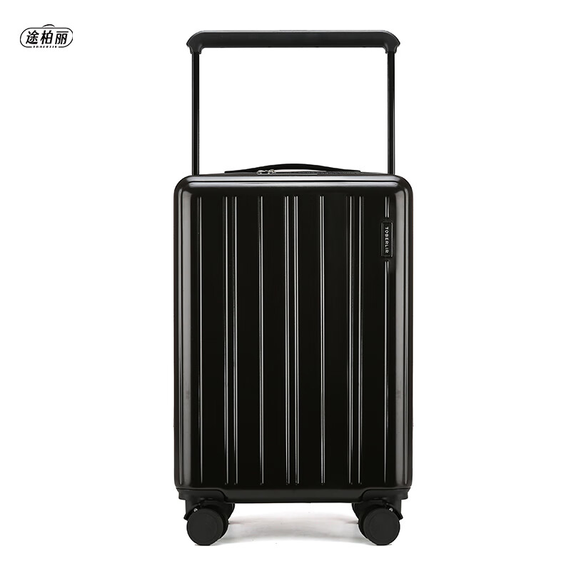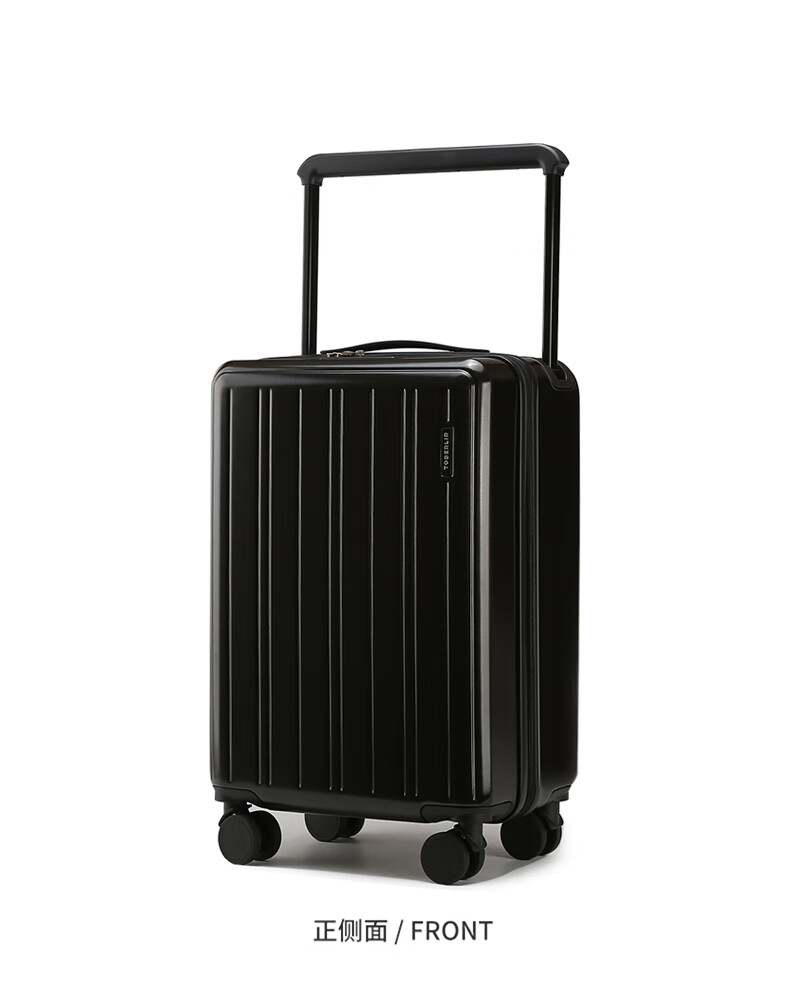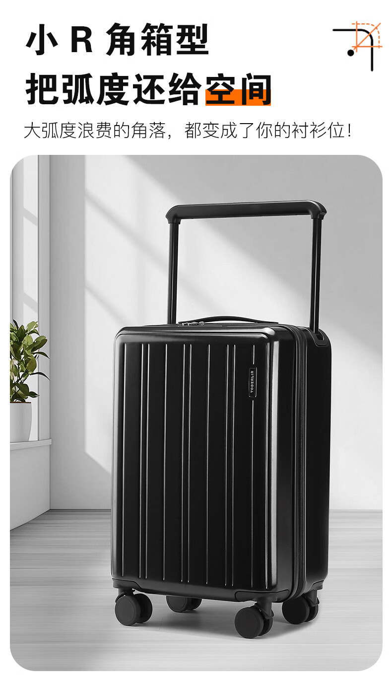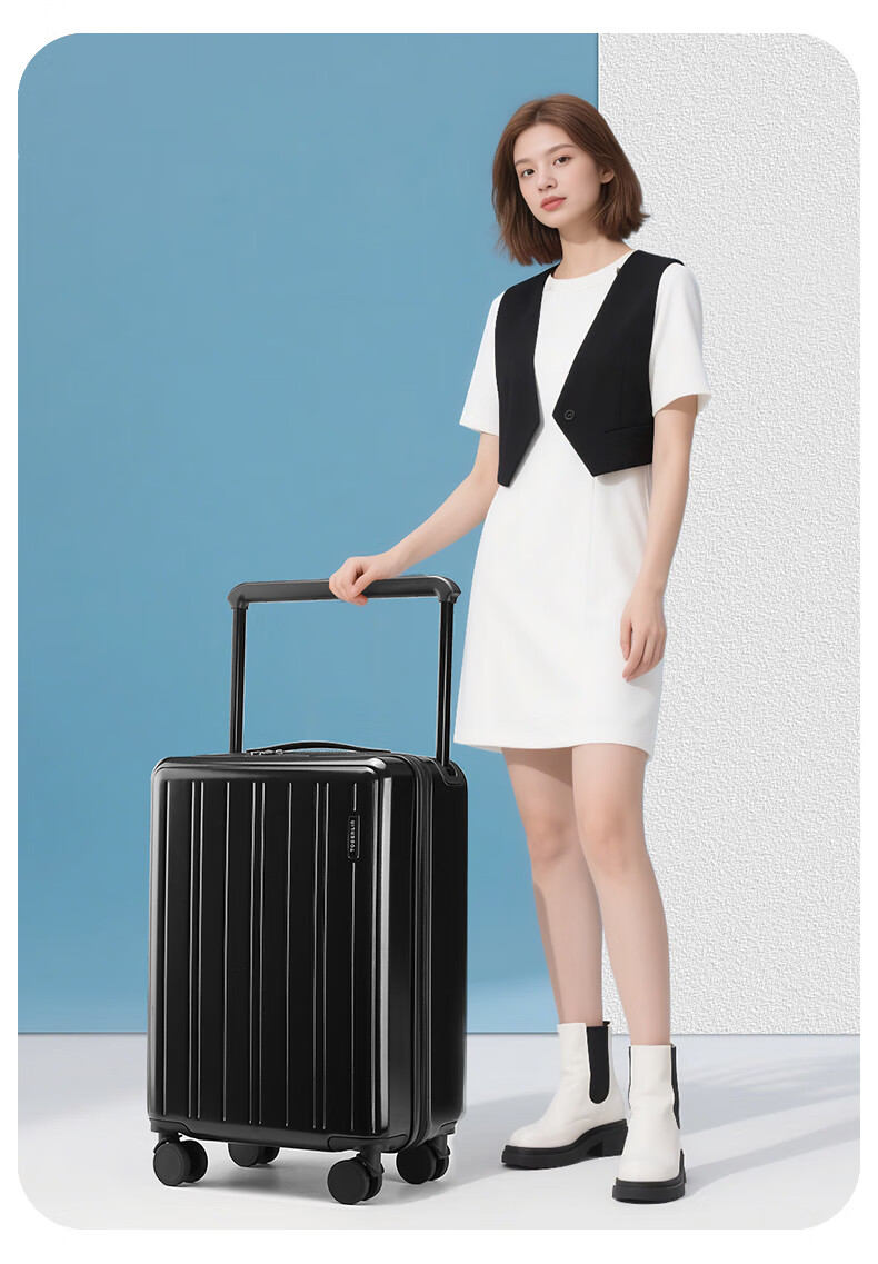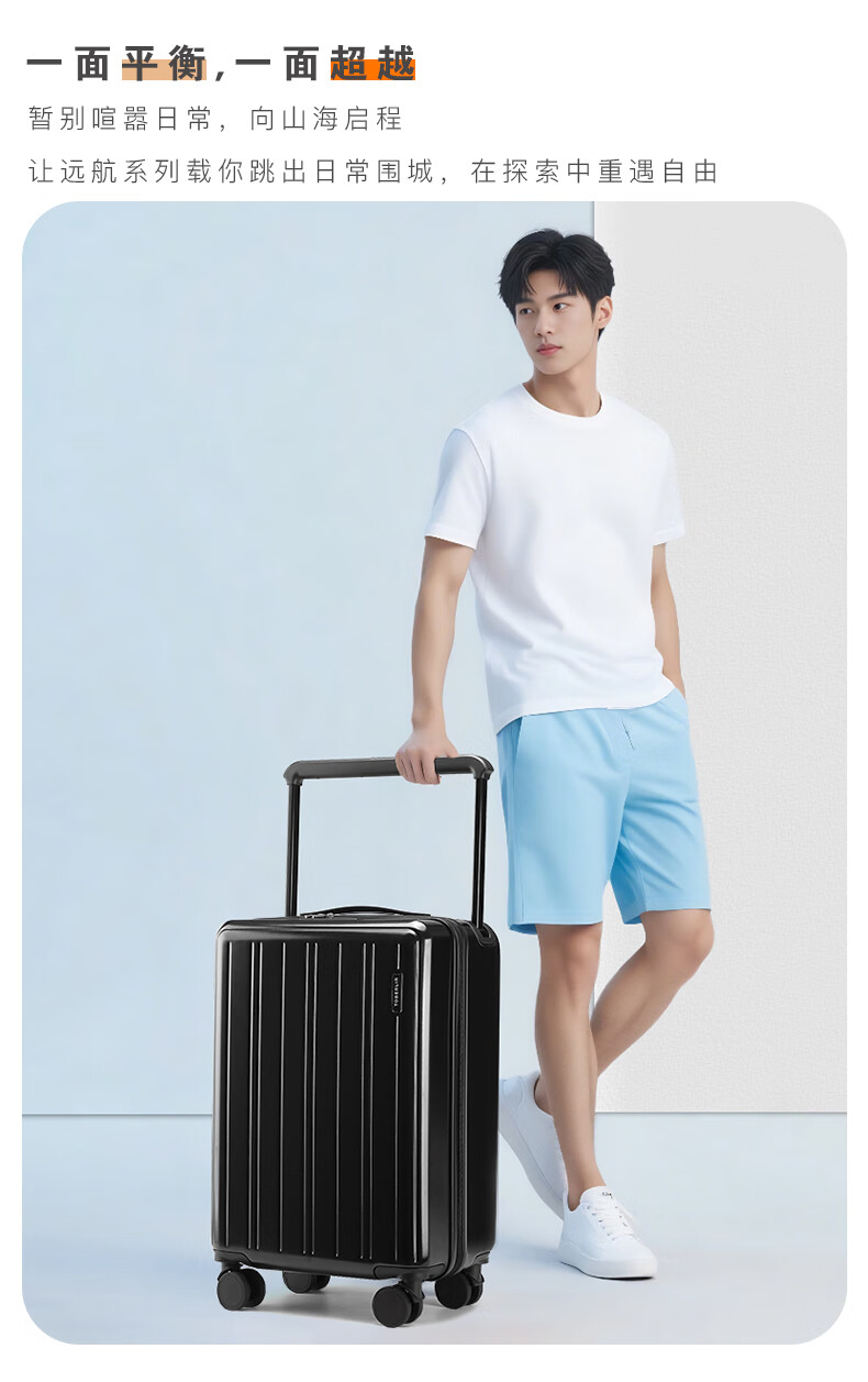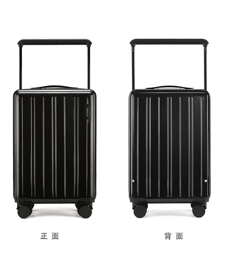 简约竖线条,小角度设计;ABS+PC材质,抗摔耐磨;静音双排飞机轮