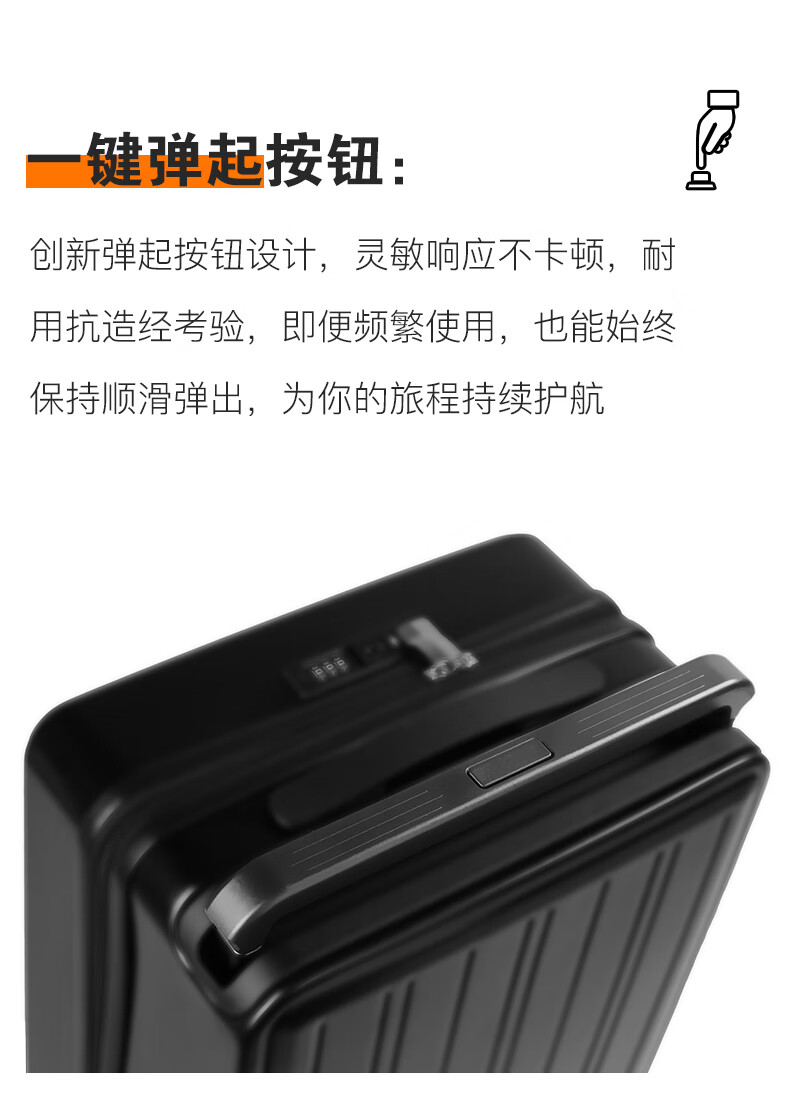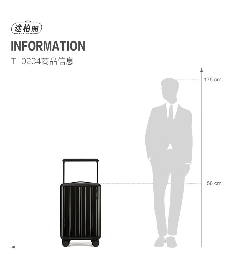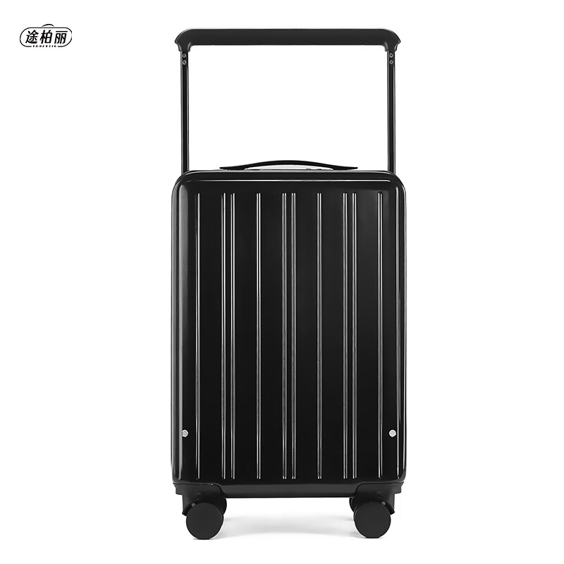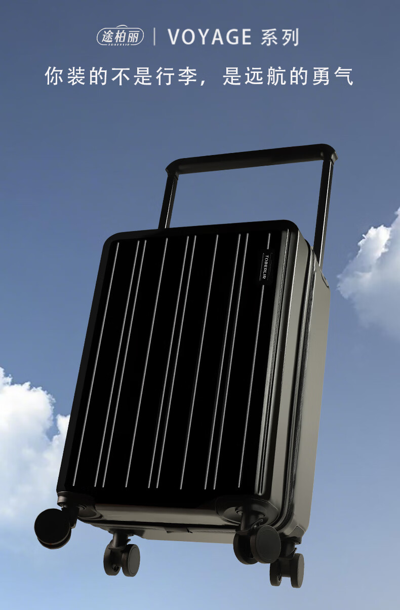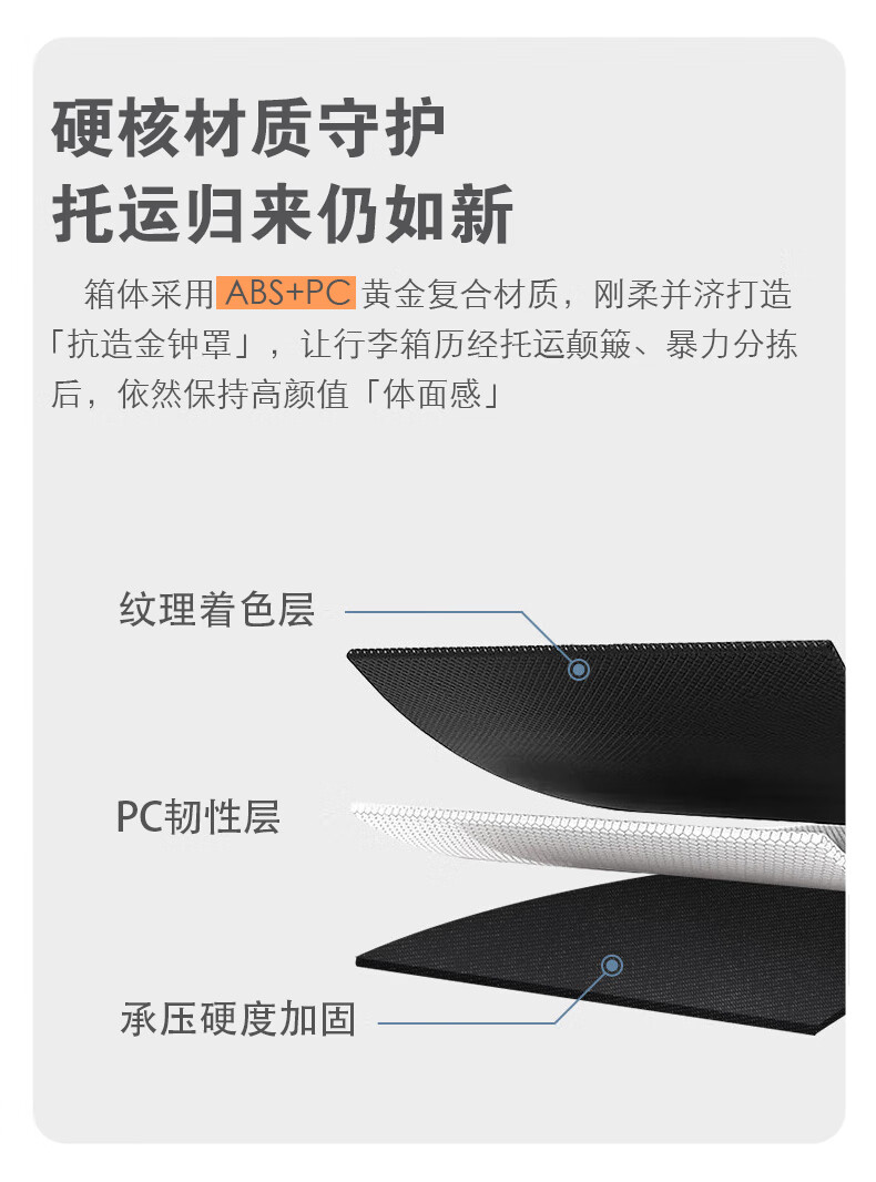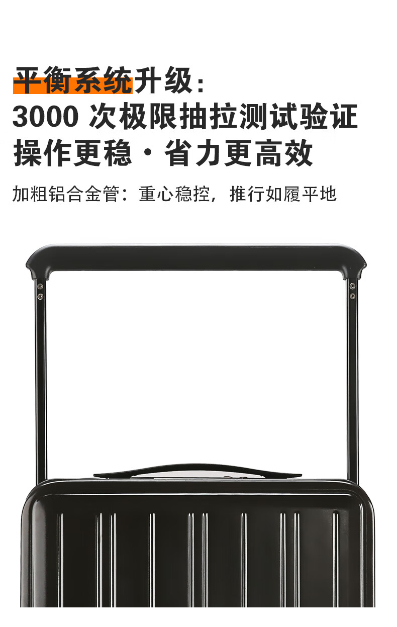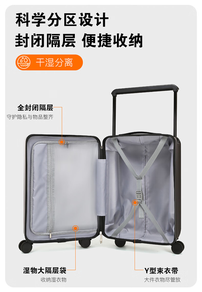 简约竖线条,小角度设计;ABS+PC材质,抗摔耐磨;静音双排飞机轮