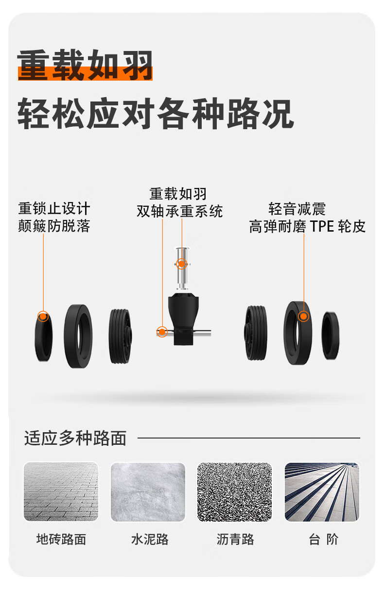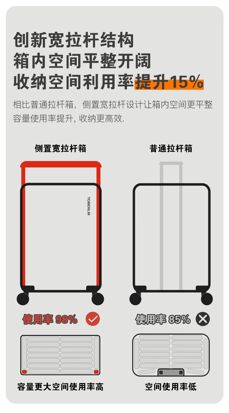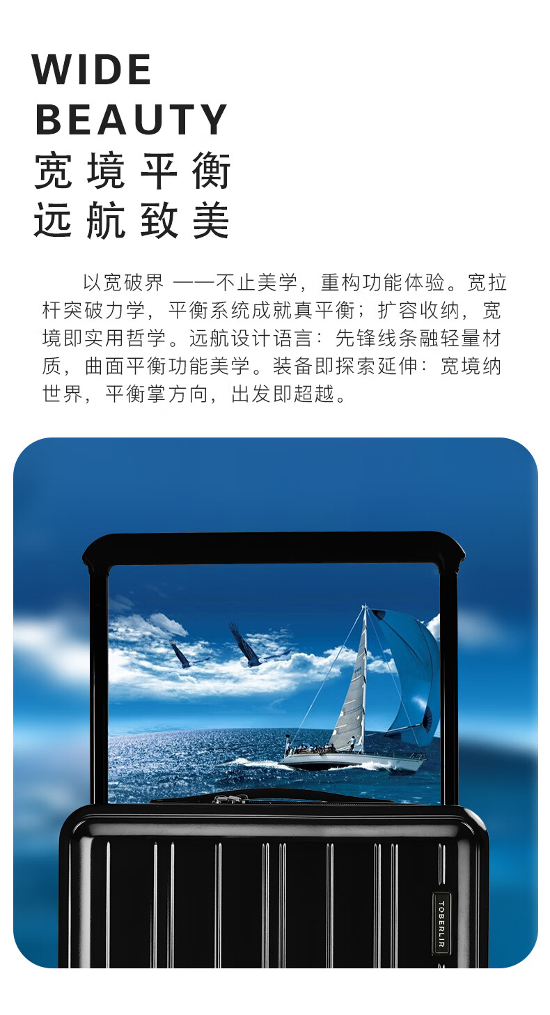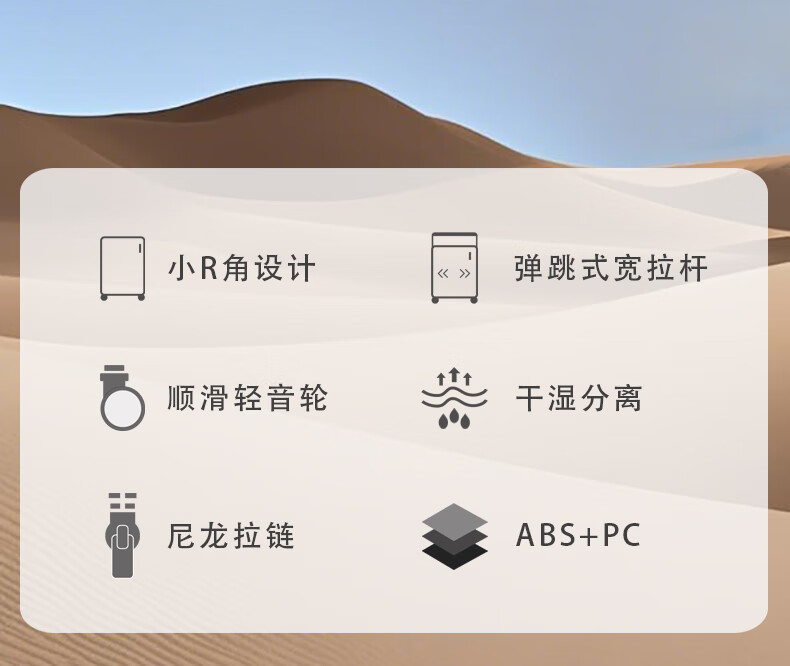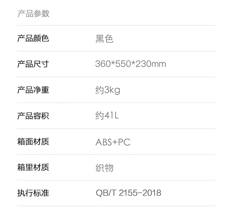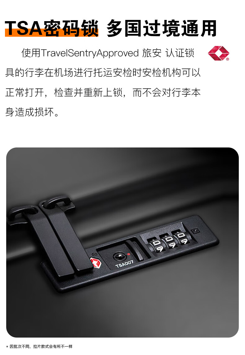 简约竖线条,小角度设计;ABS+PC材质,抗摔耐磨;静音双排飞机轮