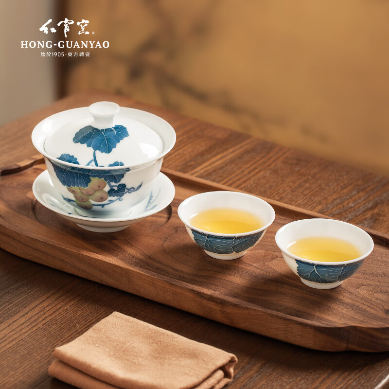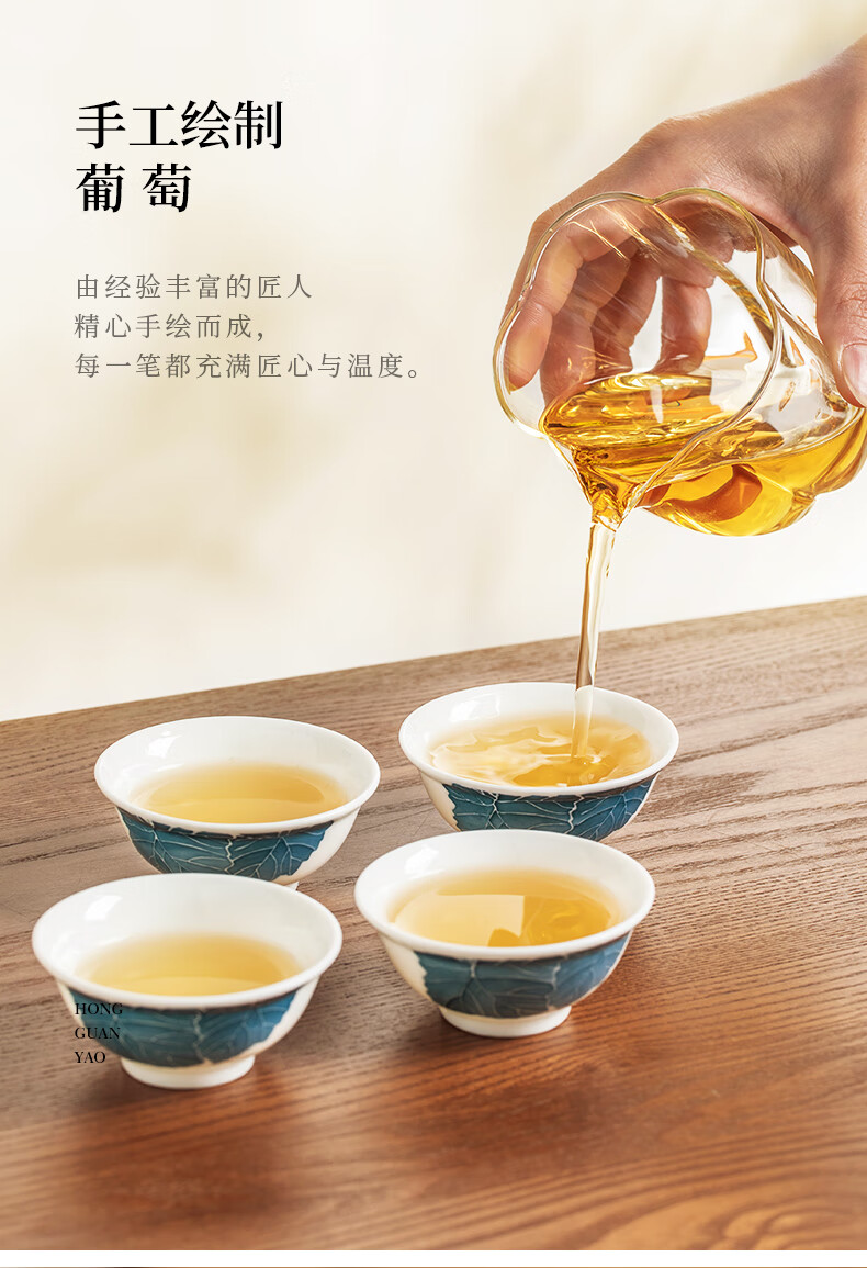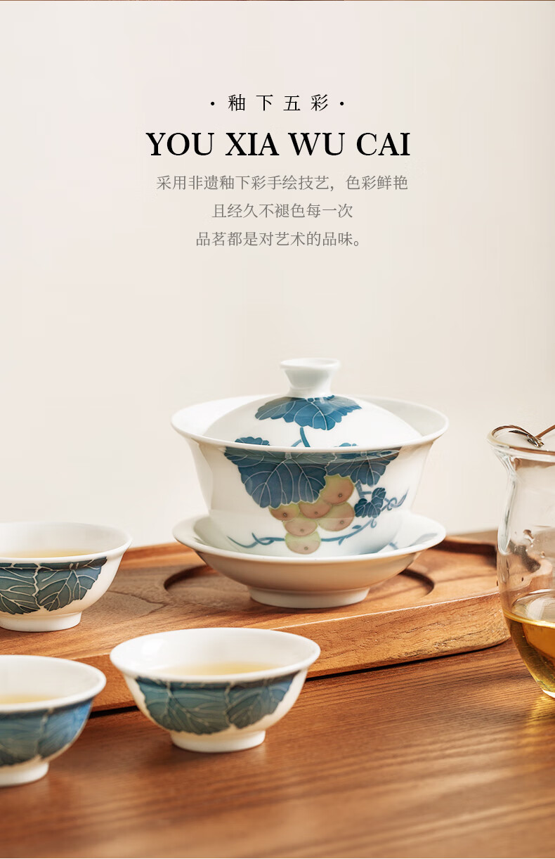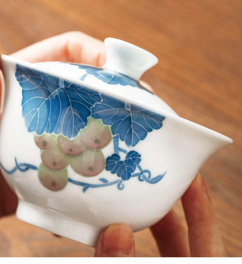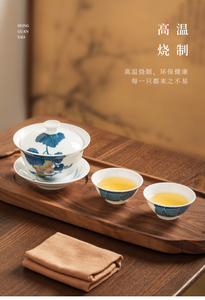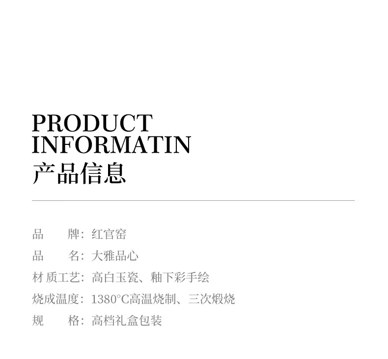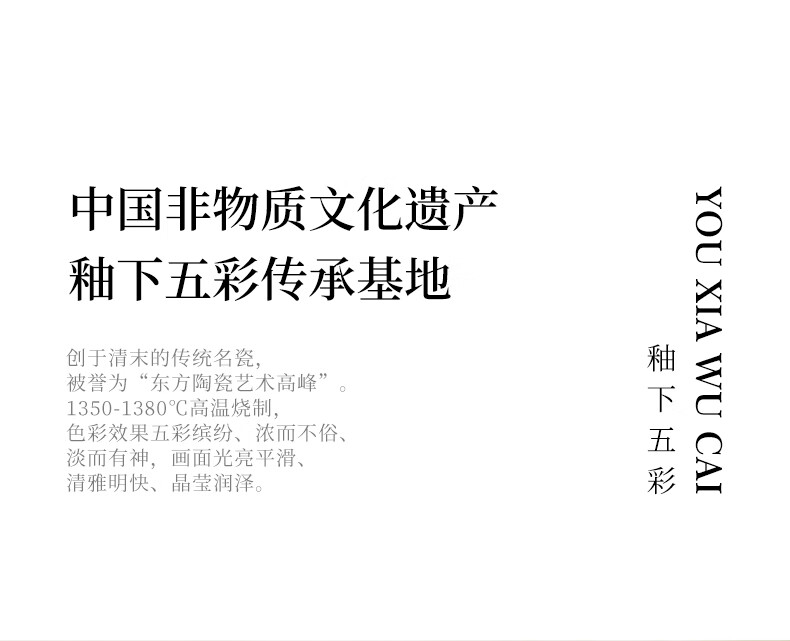 胎质洁白,均匀明净。;采用非遗釉下彩手绘技艺,色彩鲜艳。;高温烧制,环保健康。