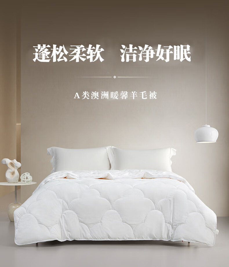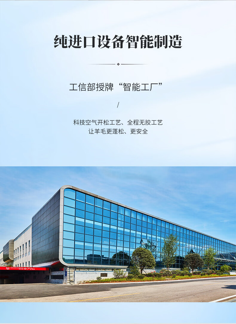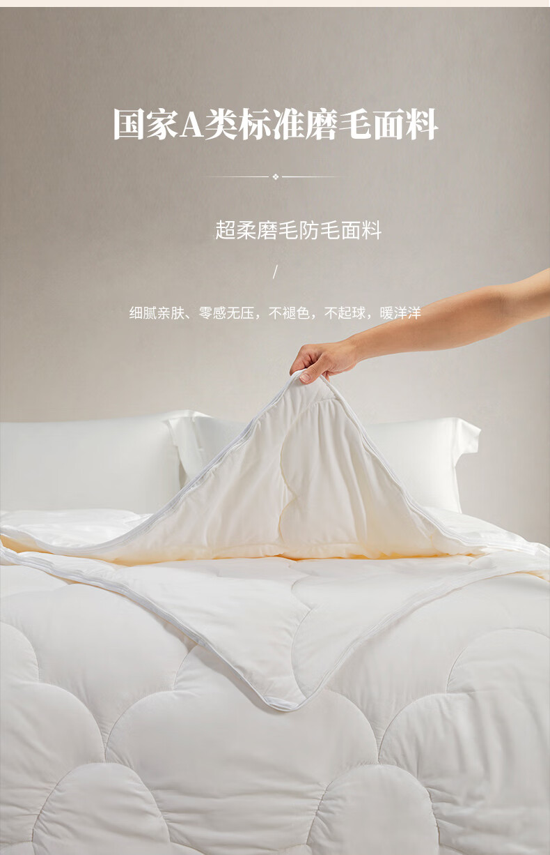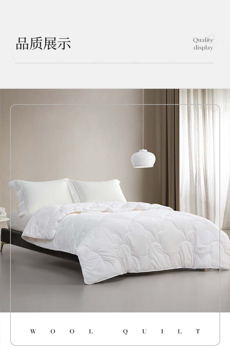 约22um的细羊毛作为填充内芯,柔软贴合,蓬松保暖;黄金配比,均匀混纺,结合羊毛良好的保暖性更舒适;睡眠“绗缝空气槽”设计,体感舒适