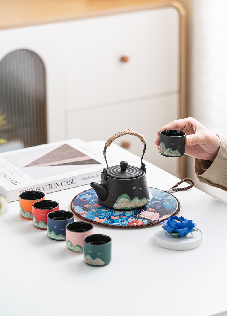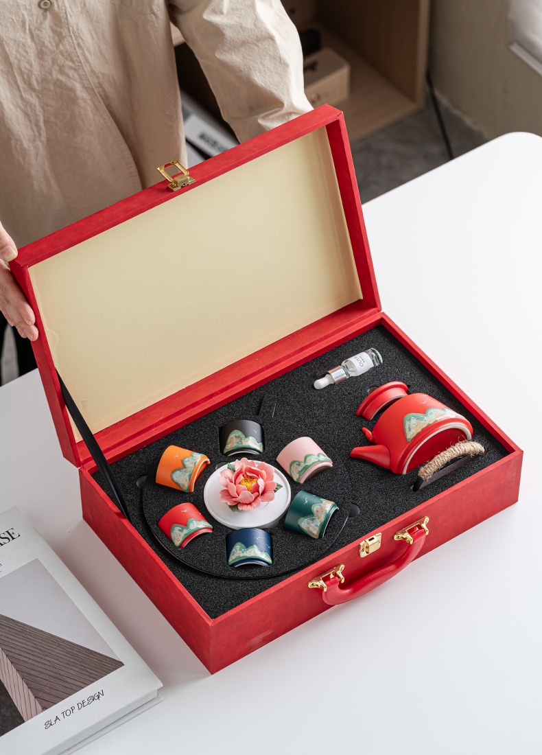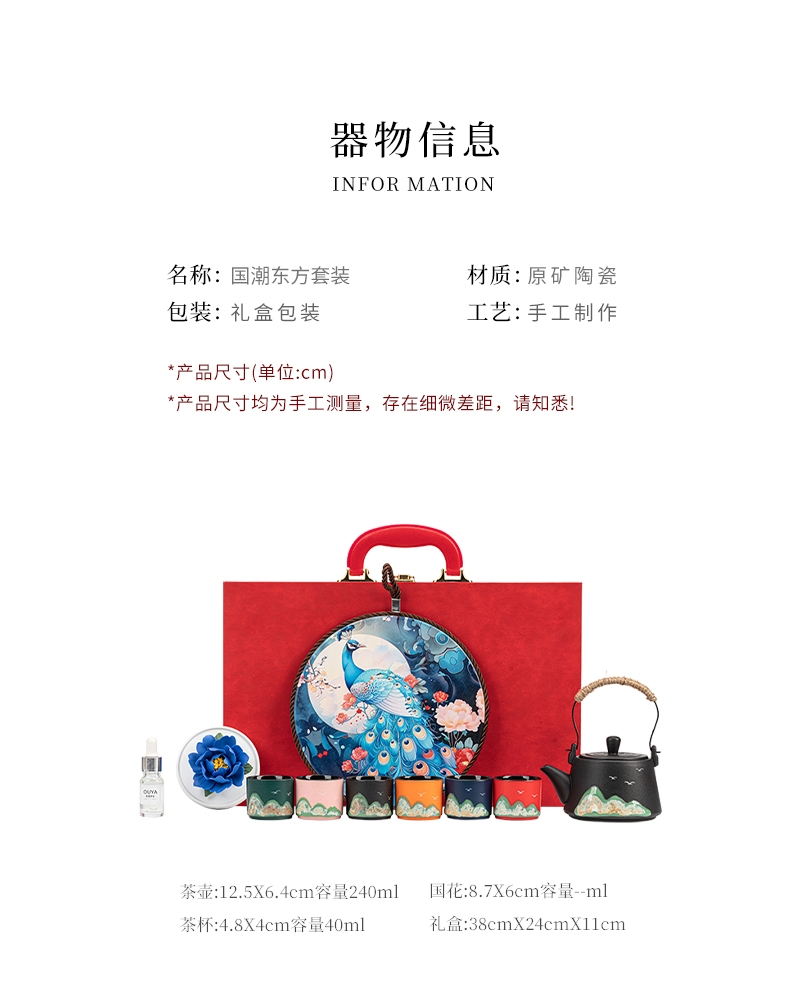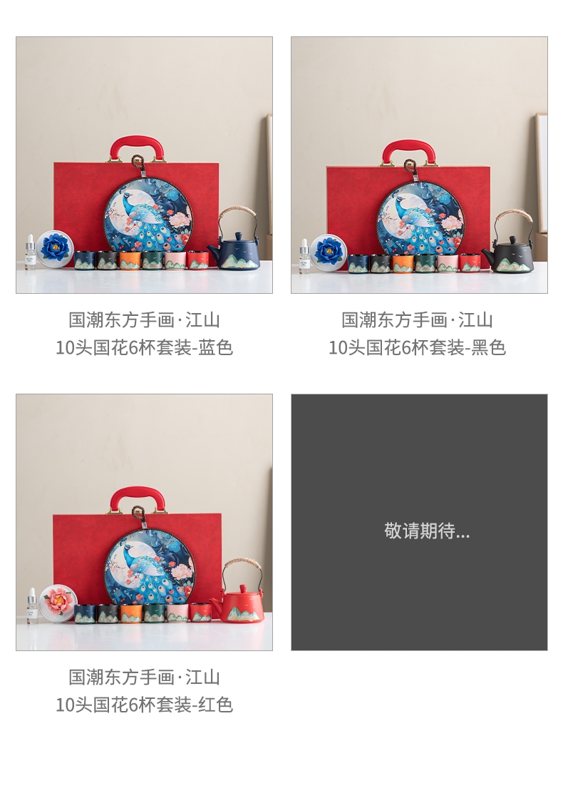 配置:提梁壶*1 品茗杯*6 国花*1 精油*1 圆茶盘*1 礼盒*1