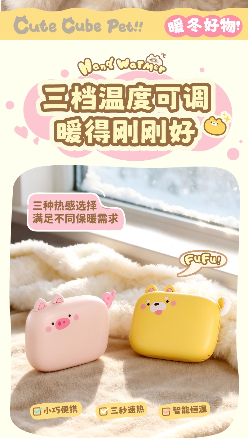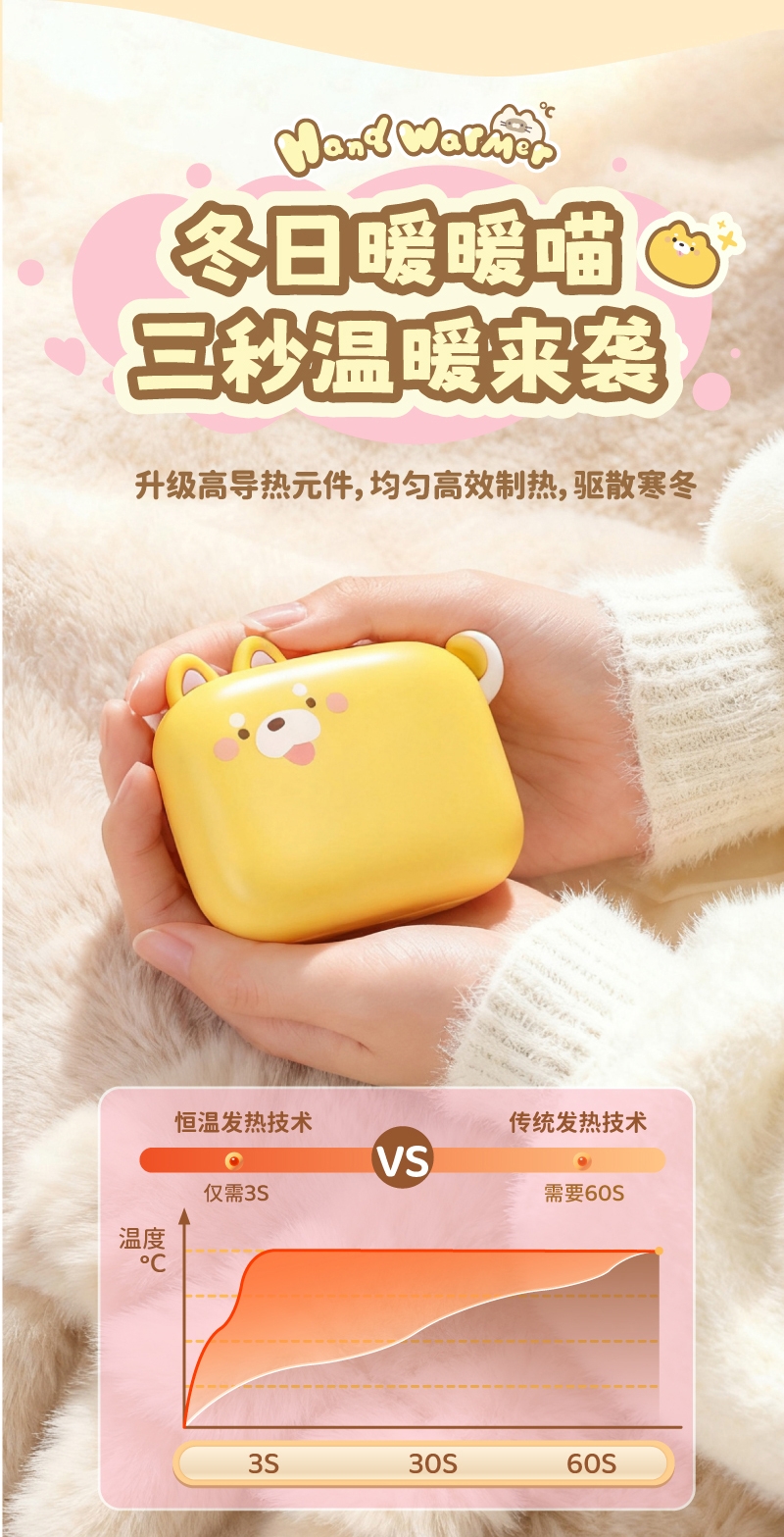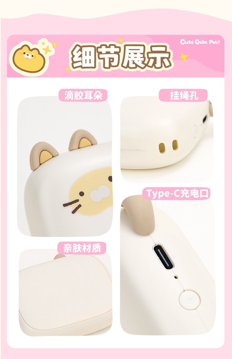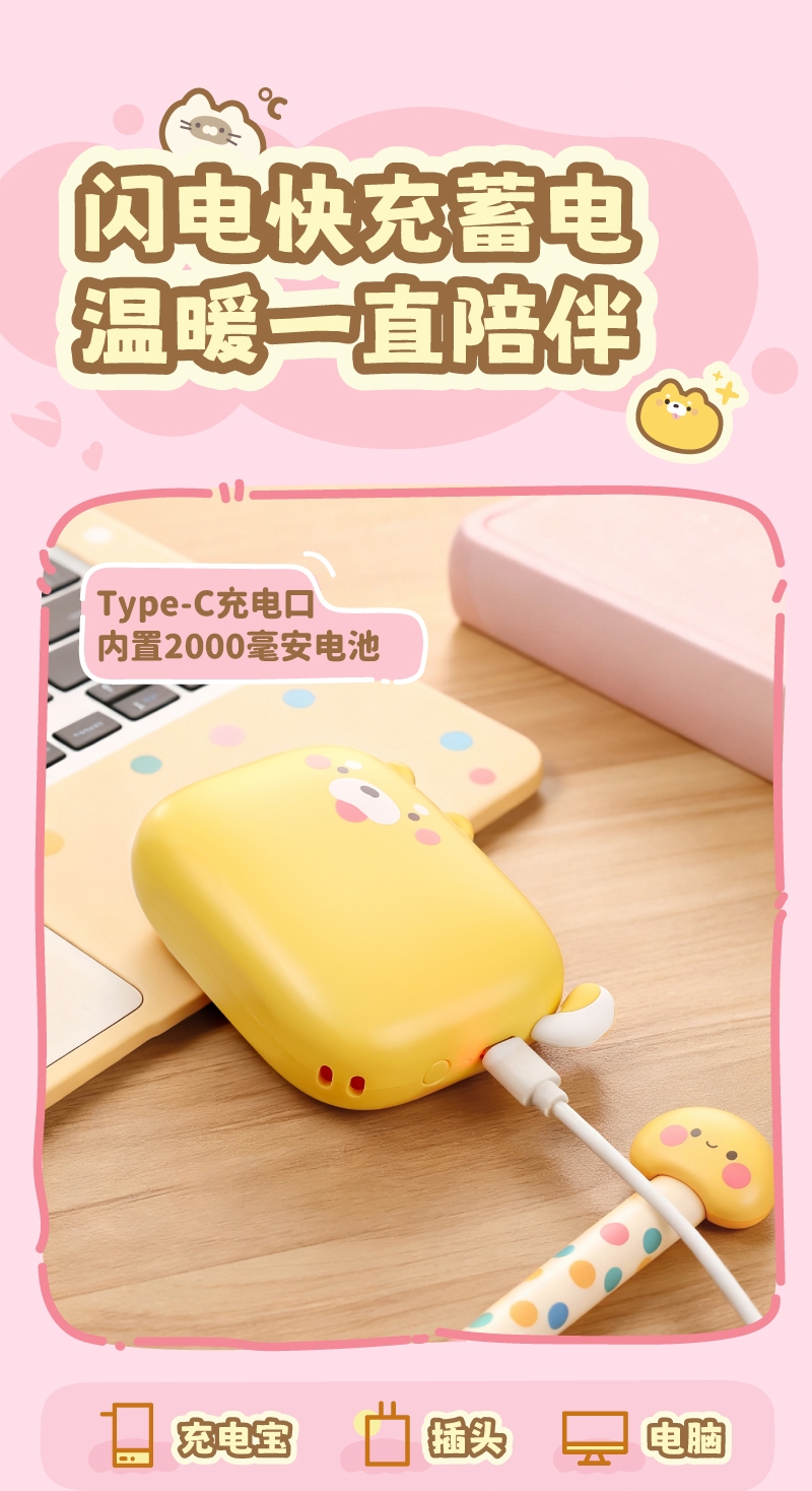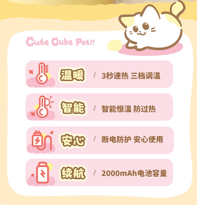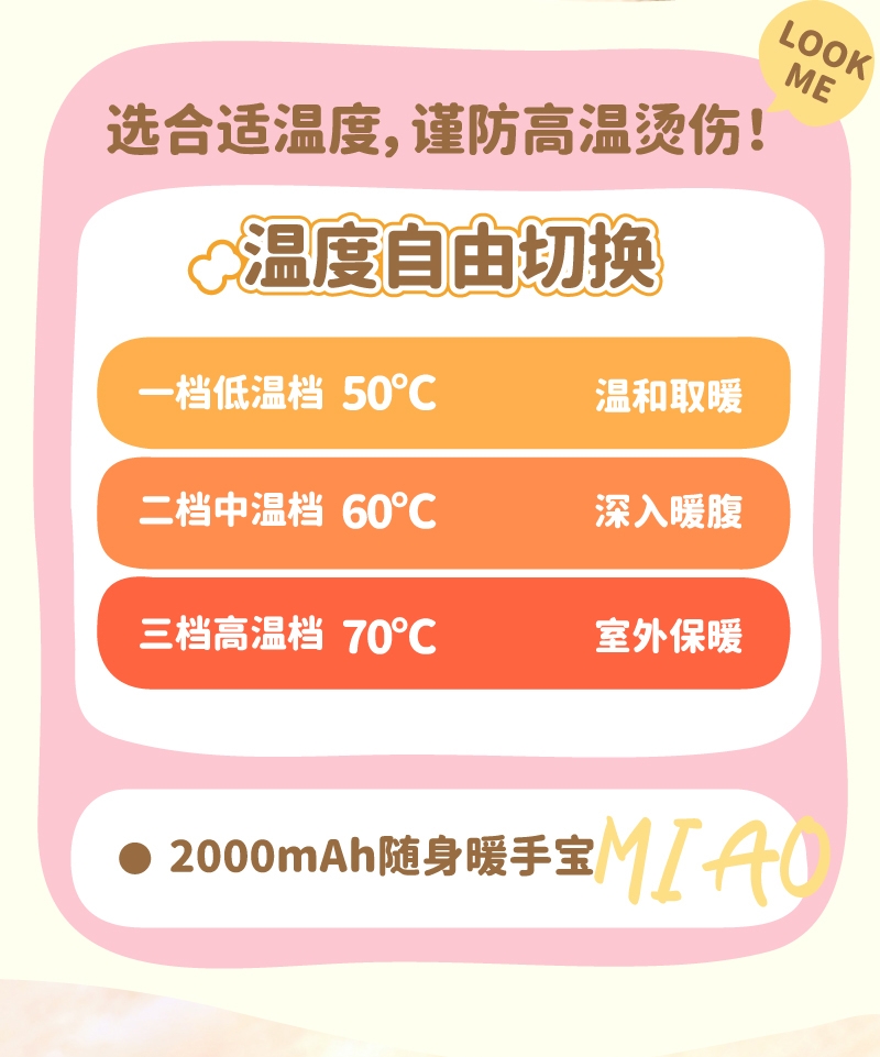 迷你小巧便携,携带方便;智能恒温供暖,安全放心使用;2000毫安大电池,闪电快充续电