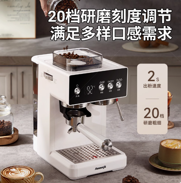 低温低压冷萃技术 数显温度显示;升级研磨一体,黑科技直落粉仓系统,不藏粉;20段精细研磨专业防飞溅手柄,不同研磨粗细度