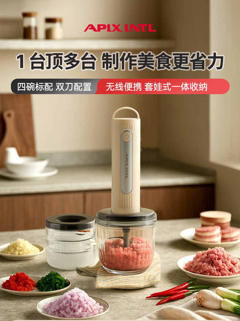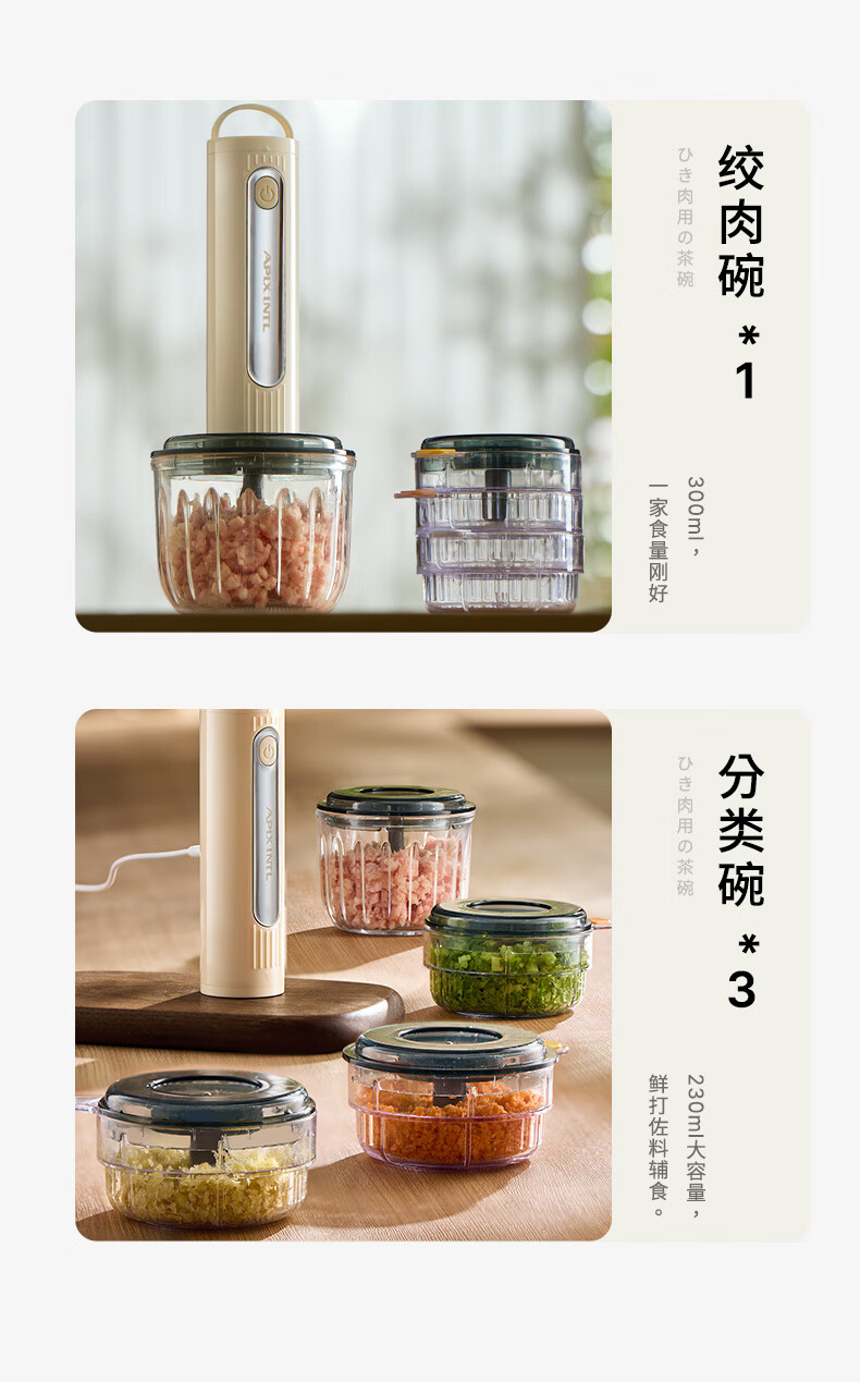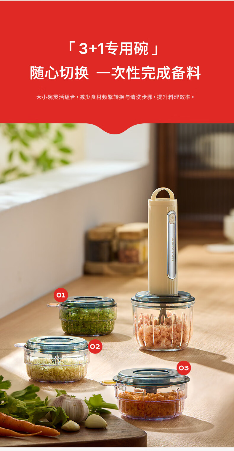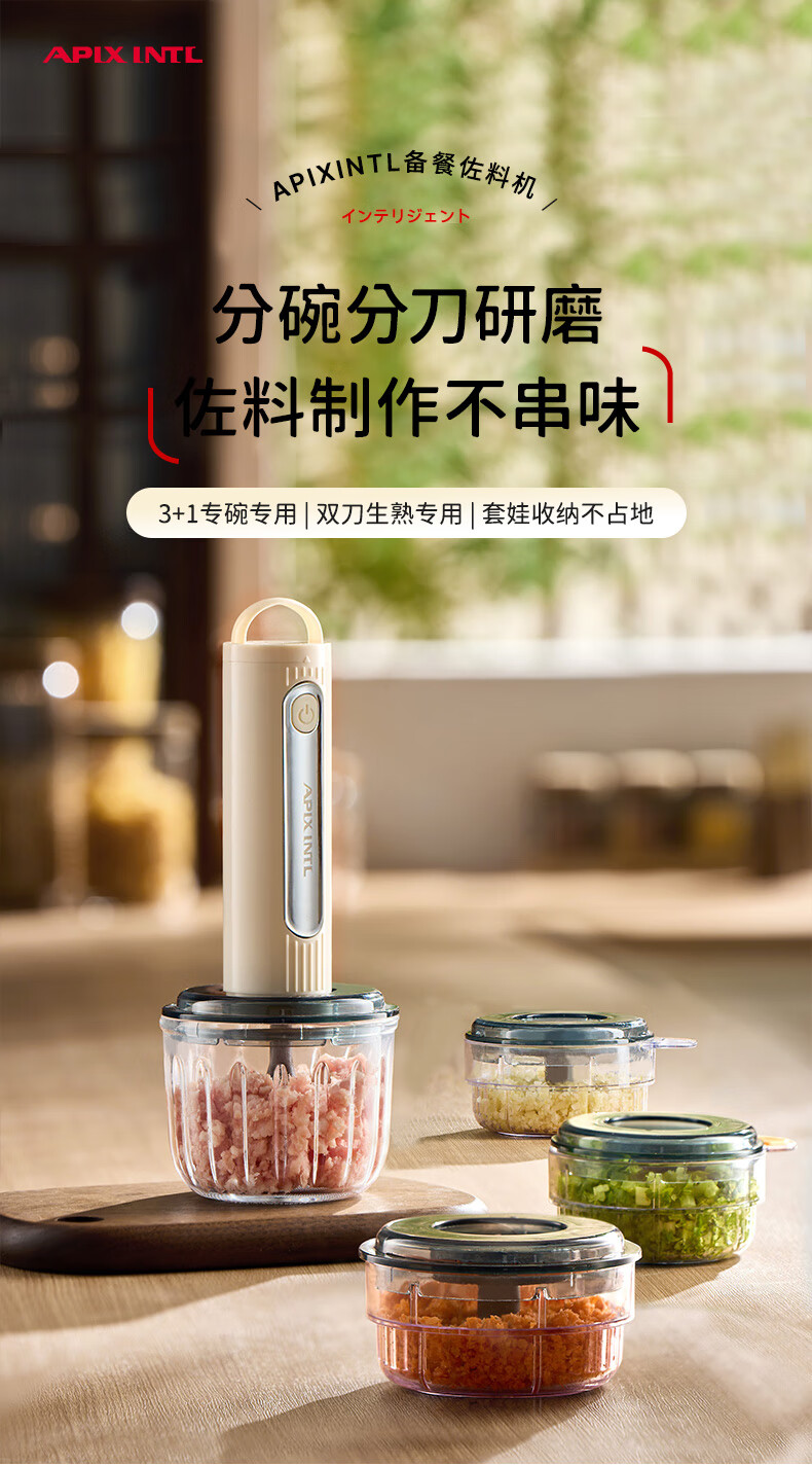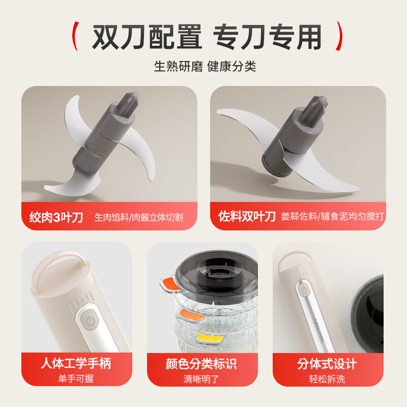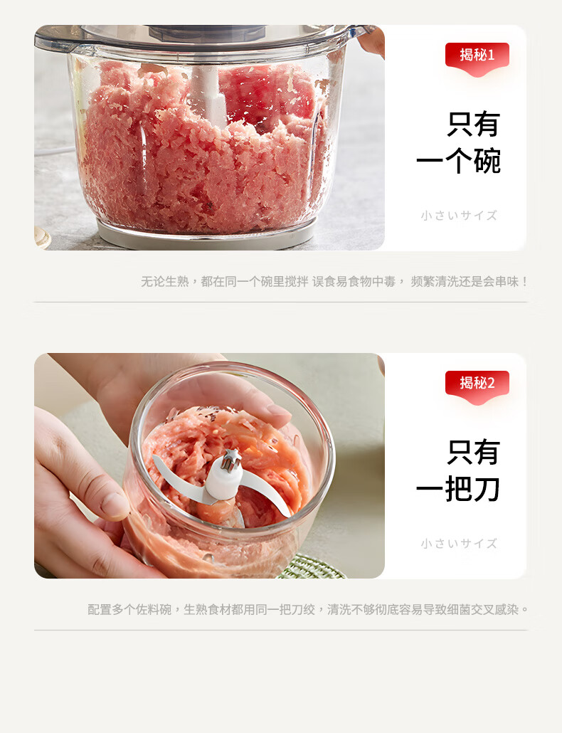 专碗专用,大碗绞肉馅,小碗绞佐料,荤素分类;无线操作,使用更方便;套娃设计,收纳不占地,小碗可直接当佐料碗使用
