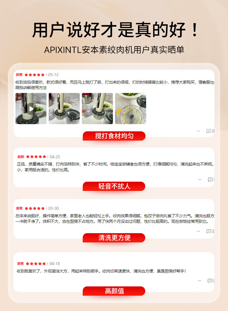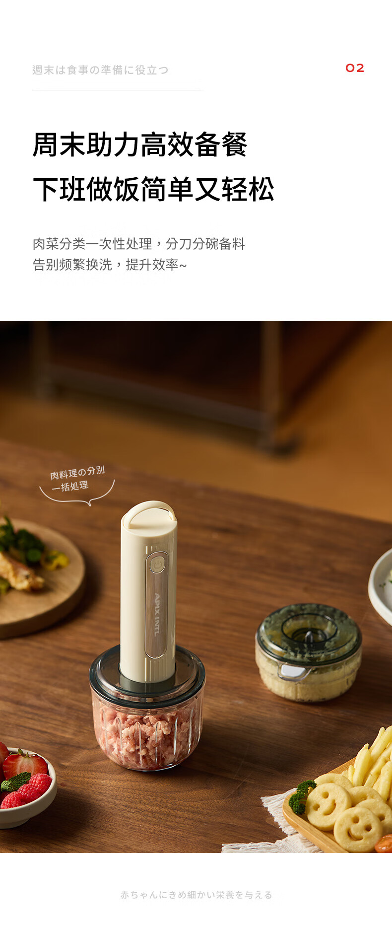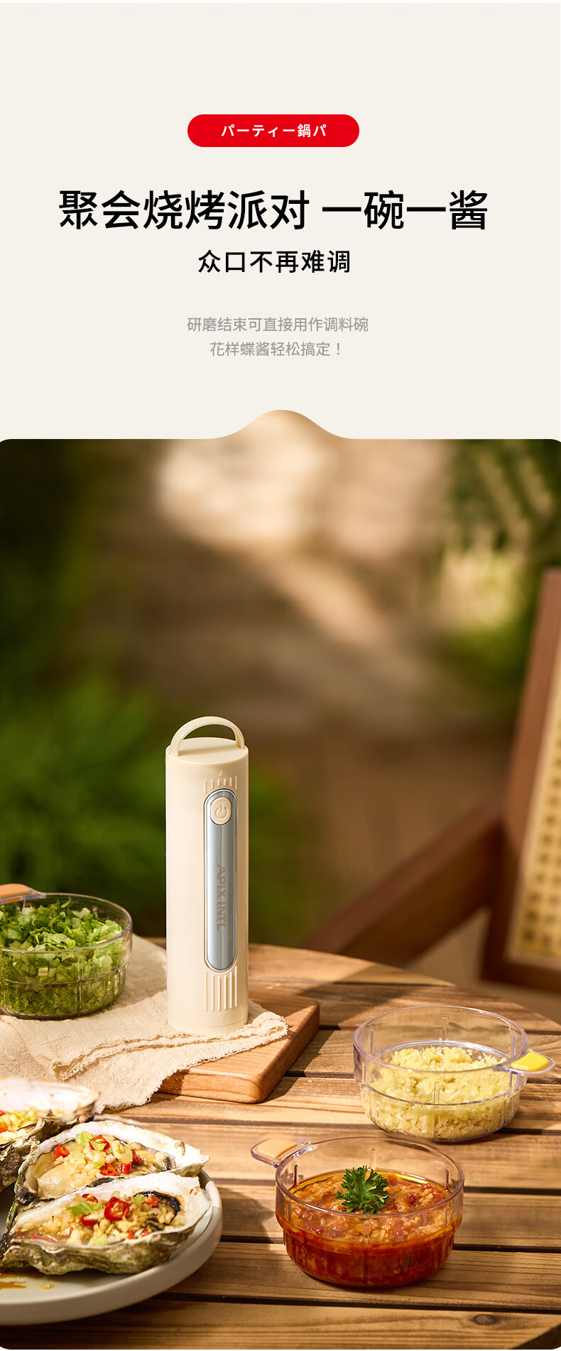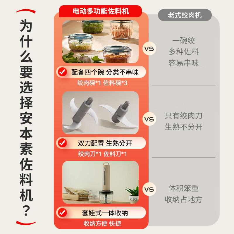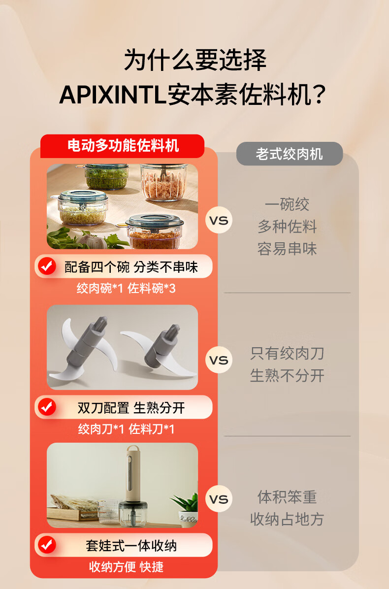 专碗专用,大碗绞肉馅,小碗绞佐料,荤素分类;无线操作,使用更方便;套娃设计,收纳不占地,小碗可直接当佐料碗使用