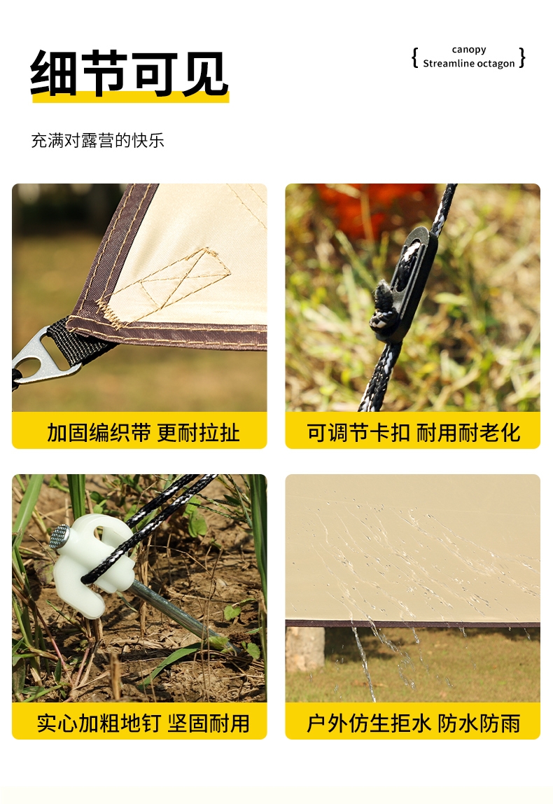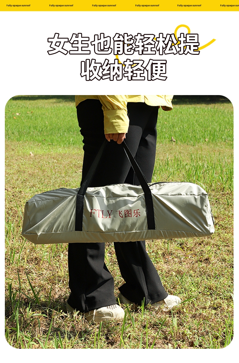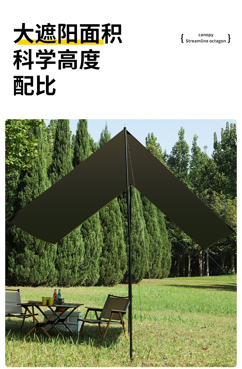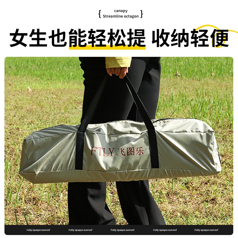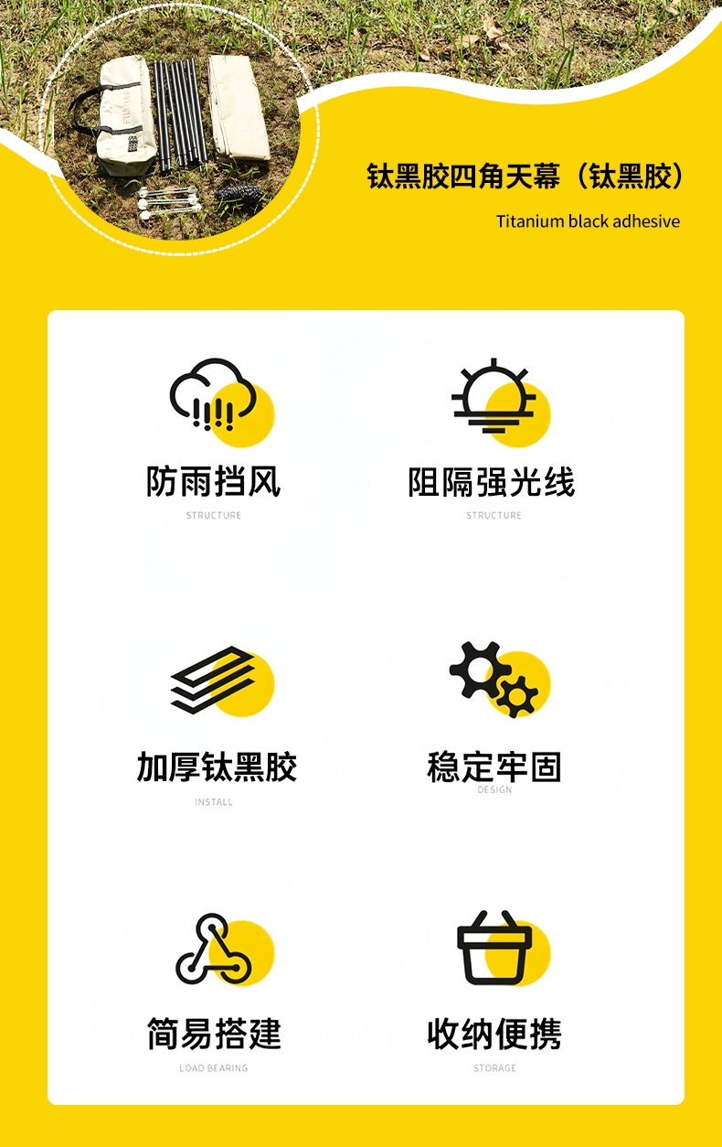 防晒UPF50+ 防水:pu3000+,有效防;升级防晒钛黑胶材质,轻奢露营;;加厚合金钢管,搭配加粗地钉,稳定牢固;;手提包收纳设计,收放自如;