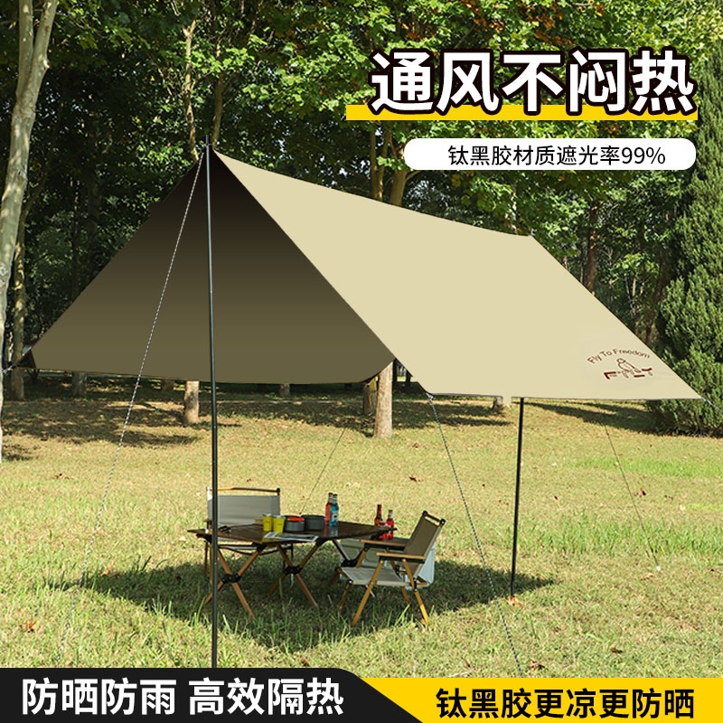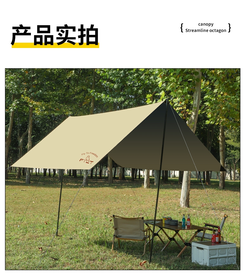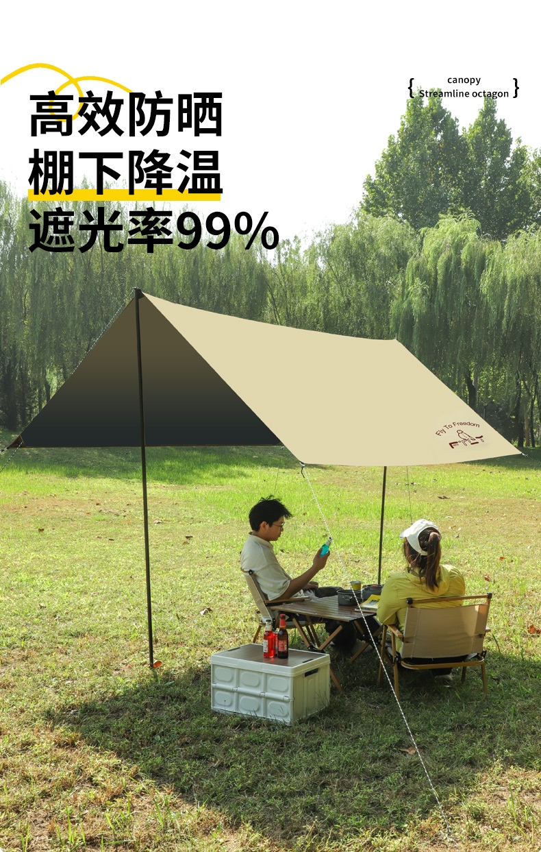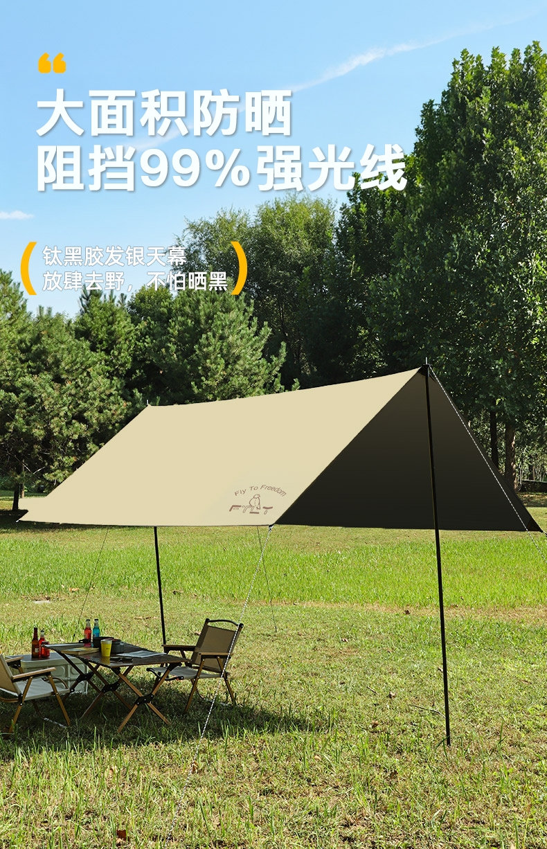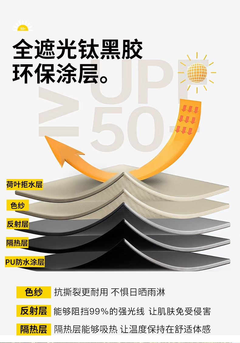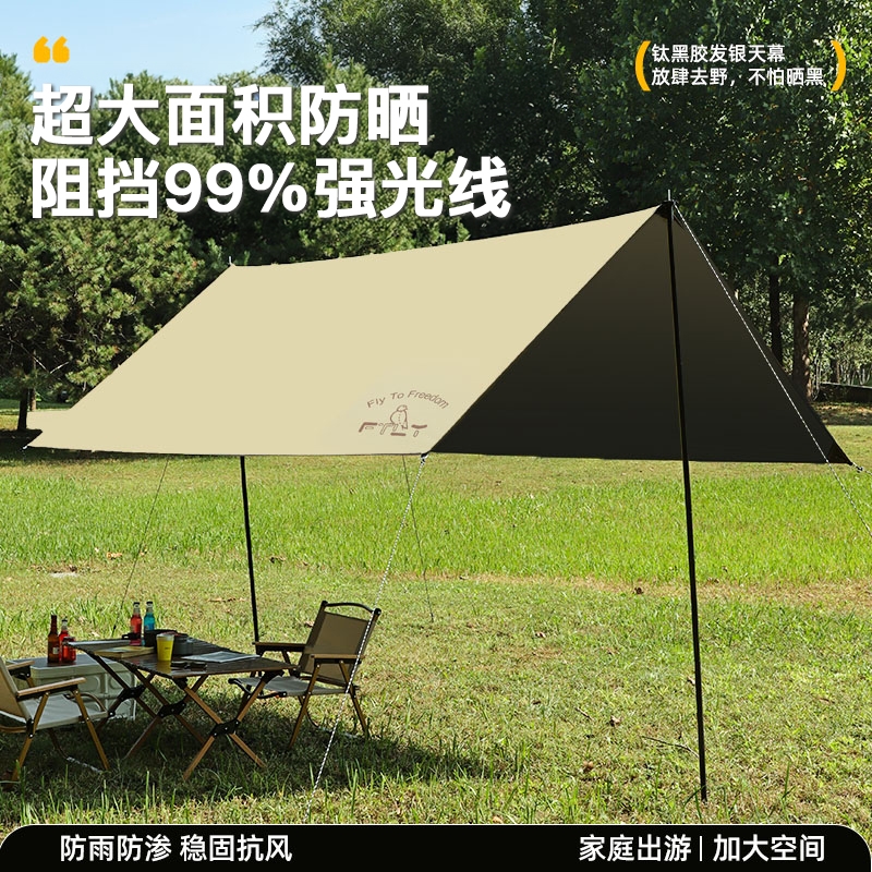 防晒UPF50+ 防水:pu3000+,有效防;升级防晒钛黑胶材质,轻奢露营;;加厚合金钢管,搭配加粗地钉,稳定牢固;;手提包收纳设计,收放自如;