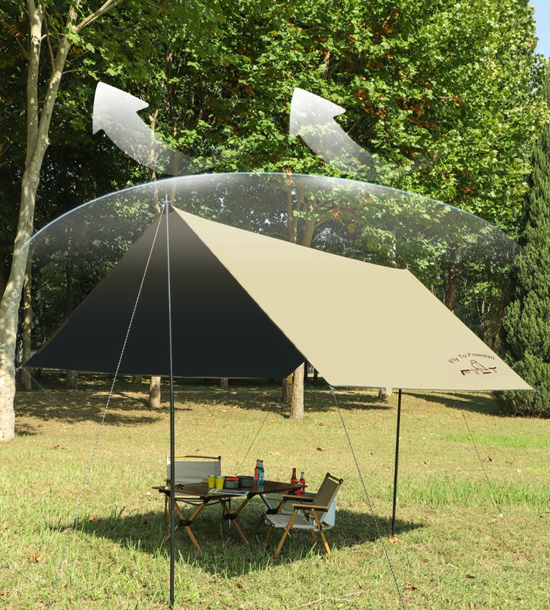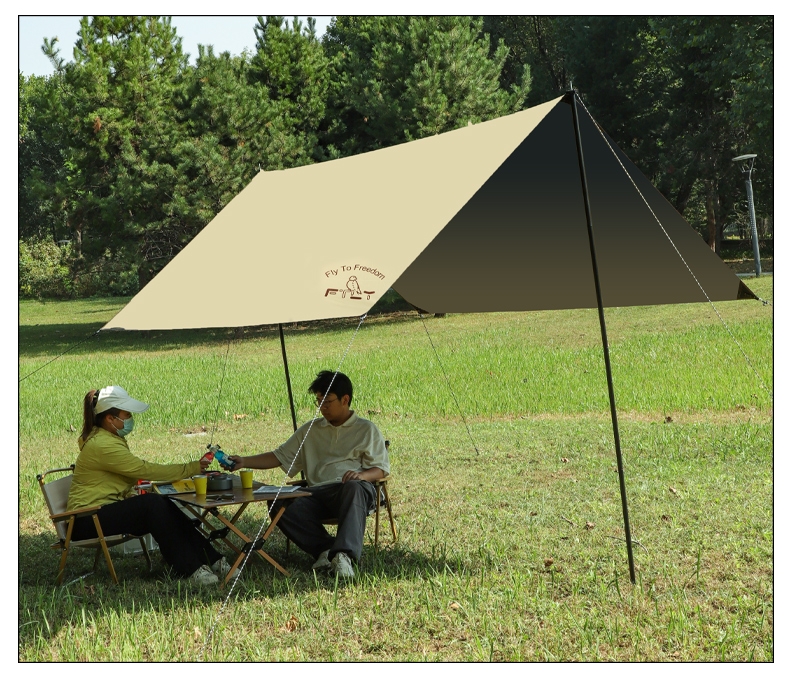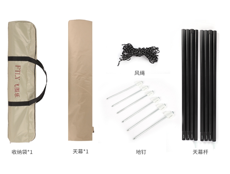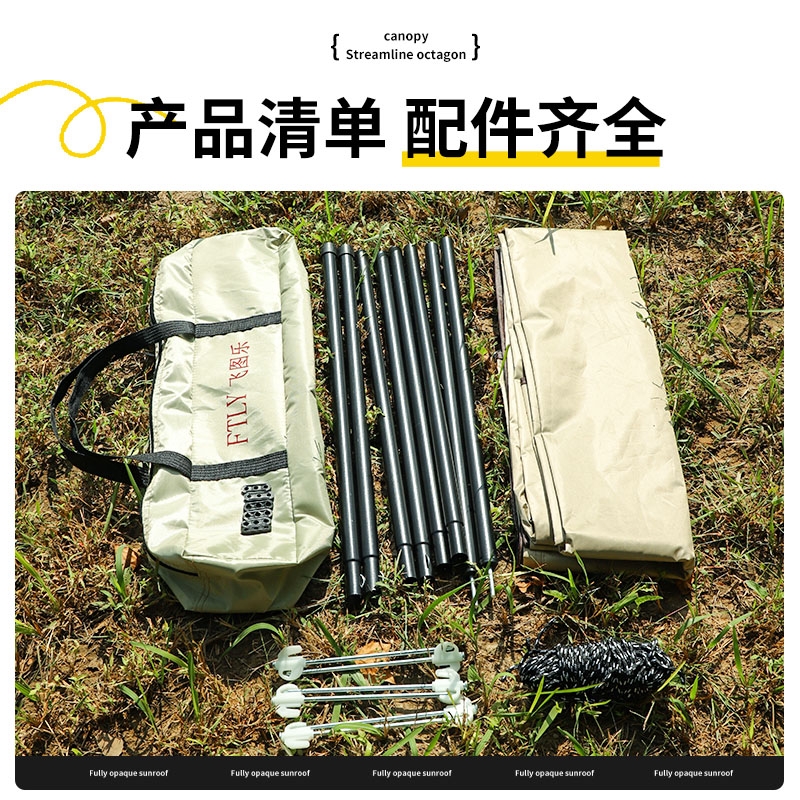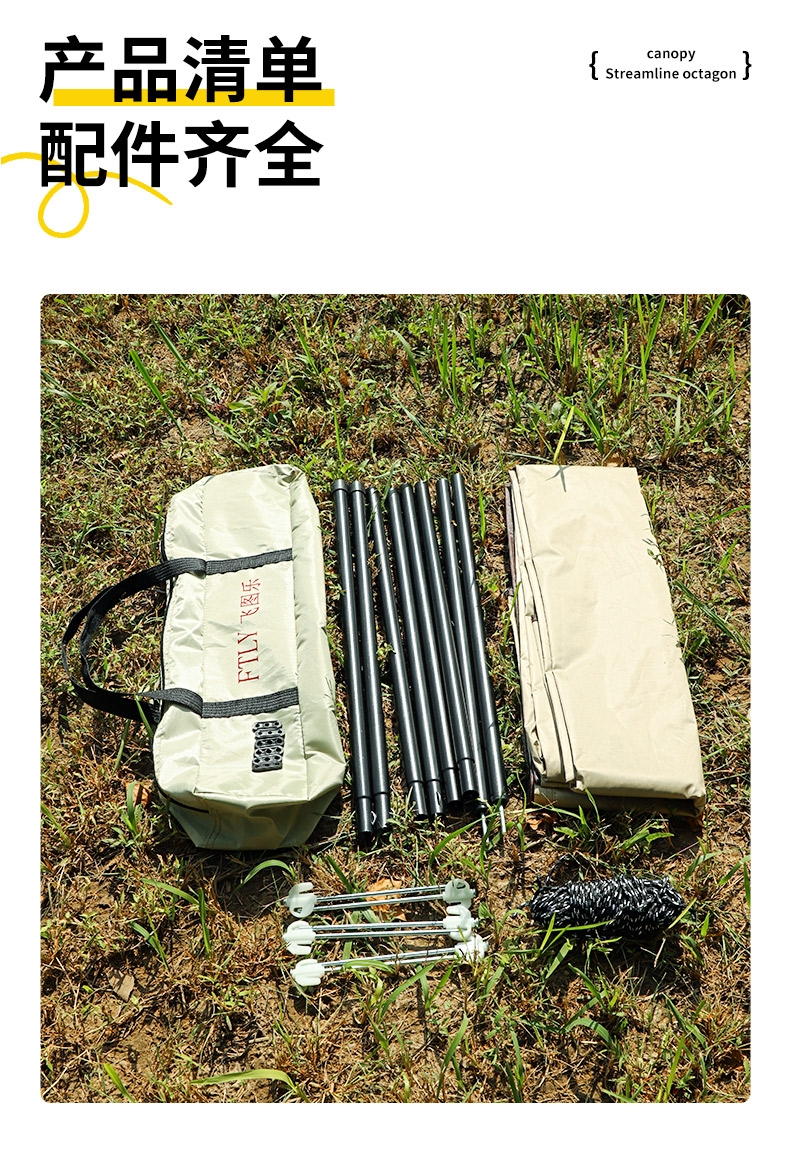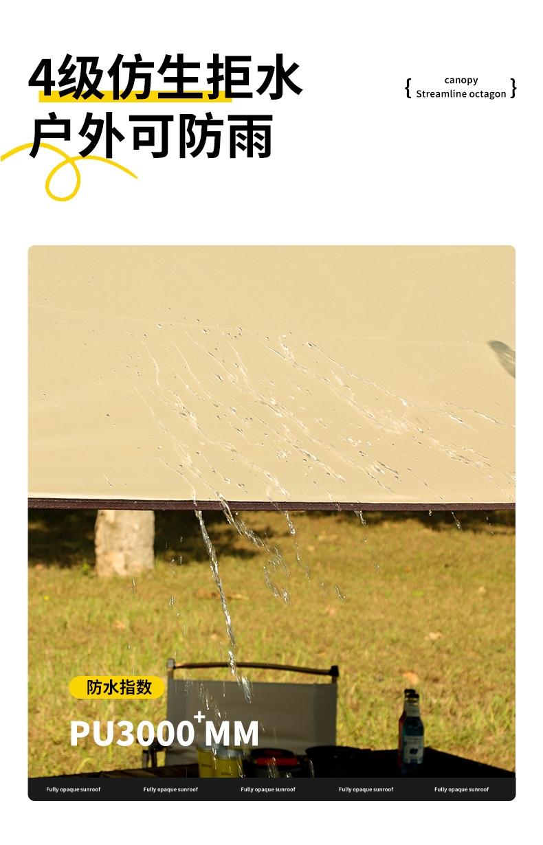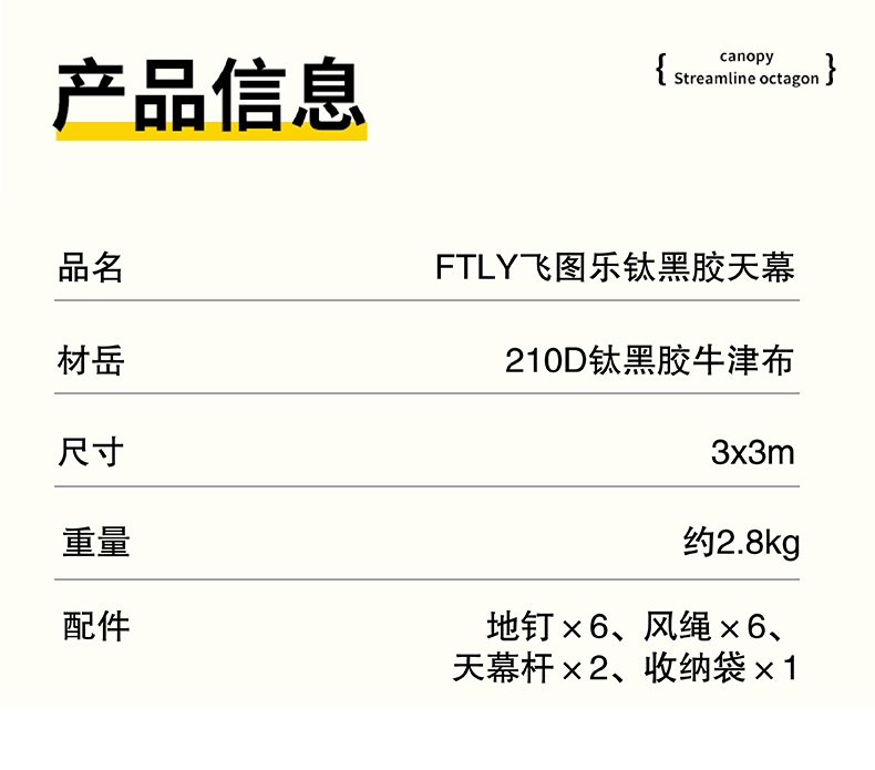 防晒UPF50+ 防水:pu3000+,有效防;升级防晒钛黑胶材质,轻奢露营;;加厚合金钢管,搭配加粗地钉,稳定牢固;;手提包收纳设计,收放自如;