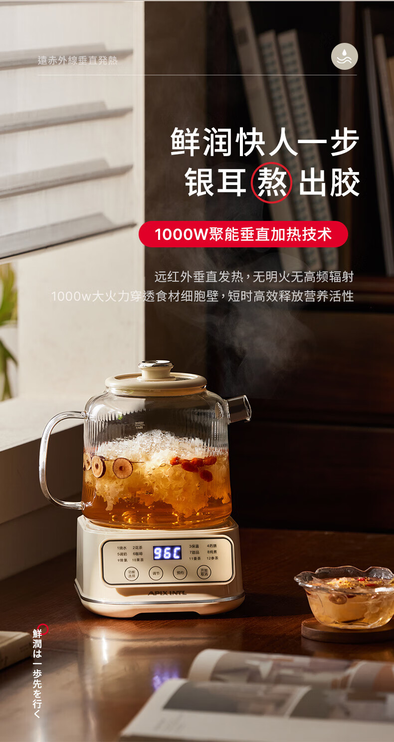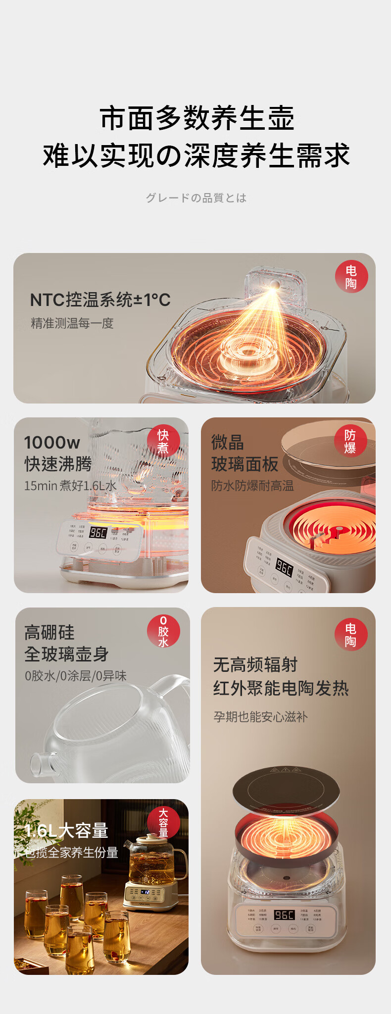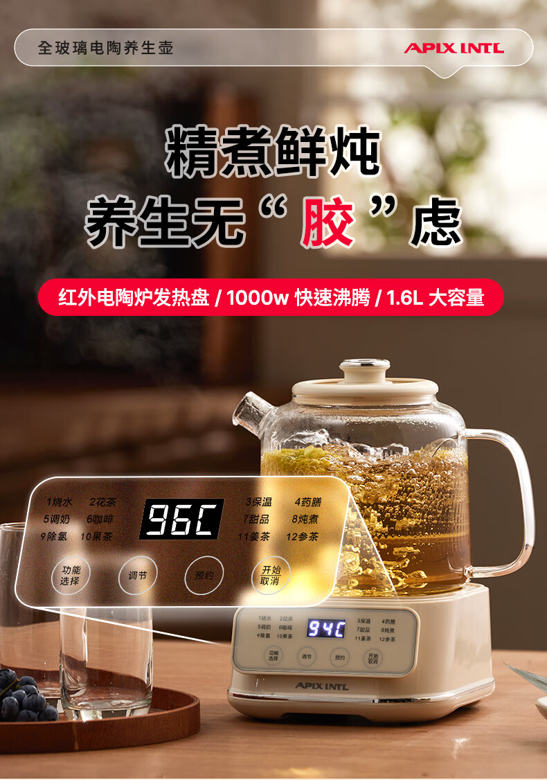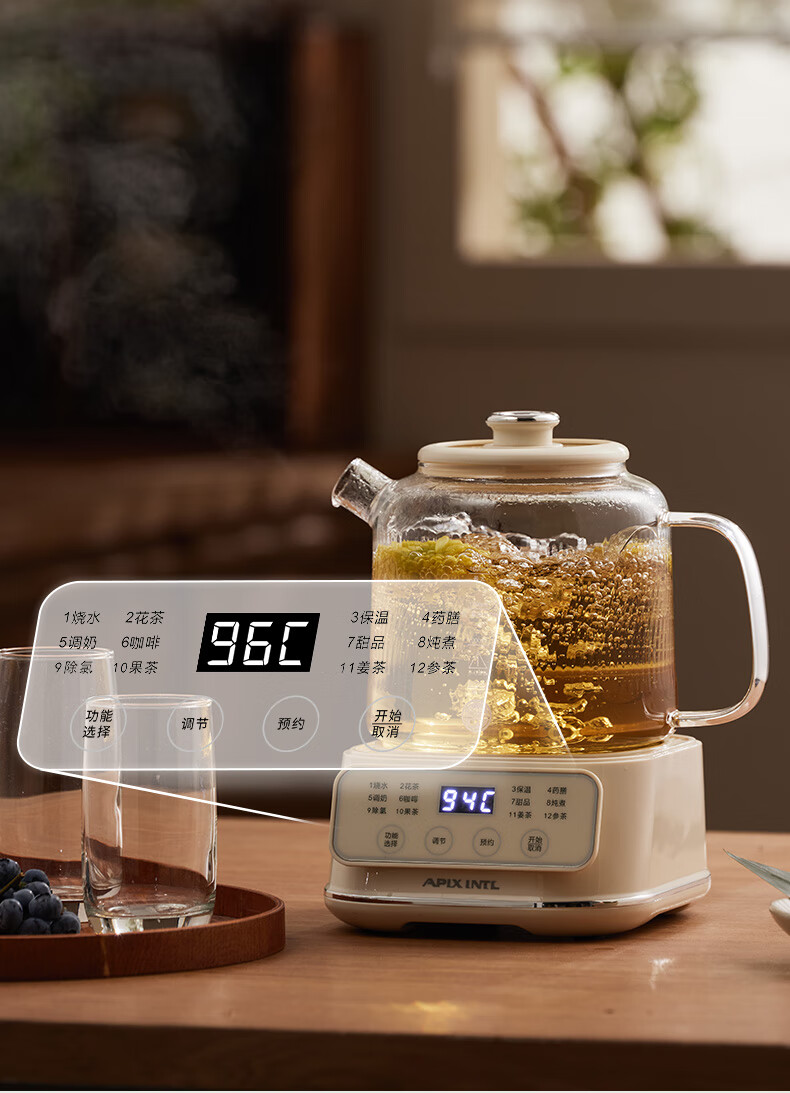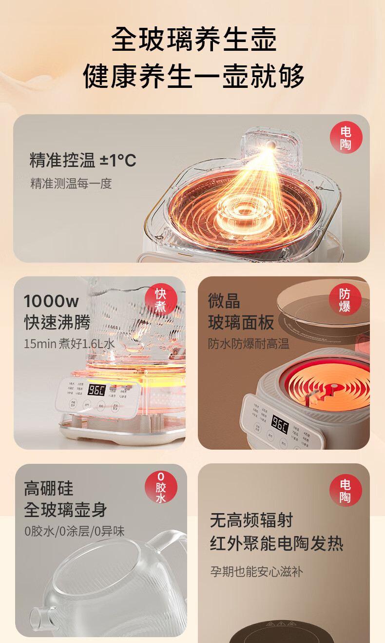 全玻璃机身,0硅胶0涂层;1000W大功率,15分钟快速沸腾;12大养生功能,可一键除氯