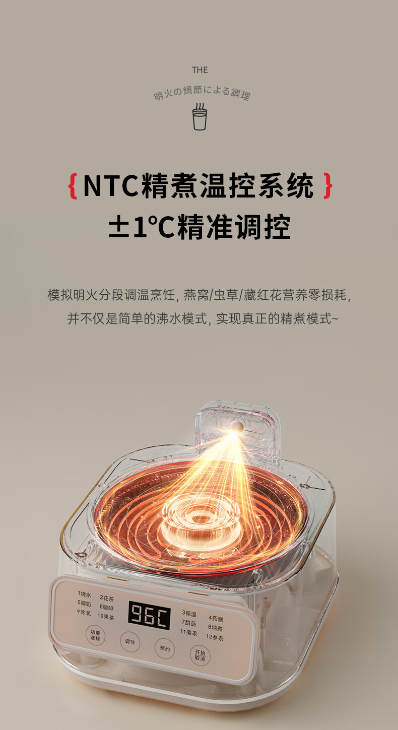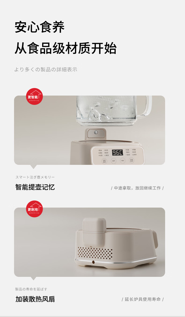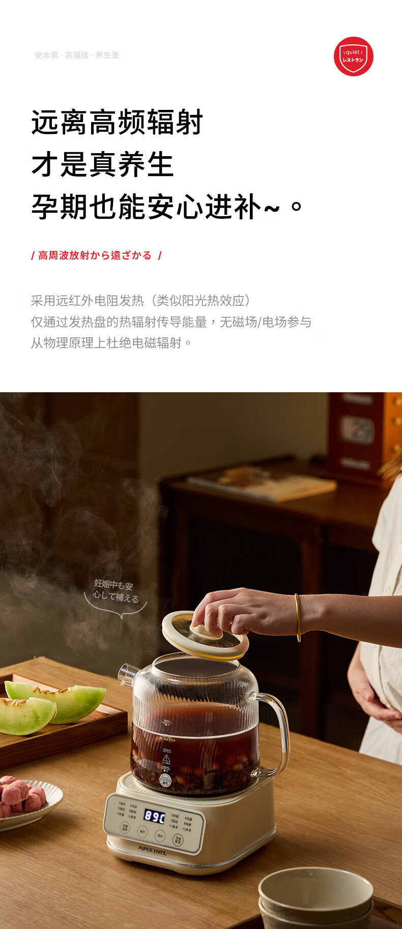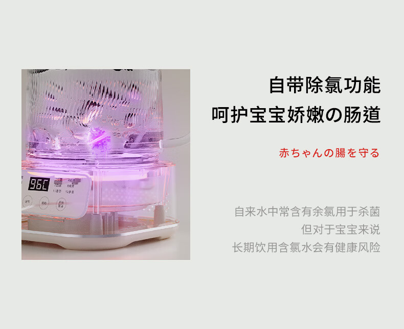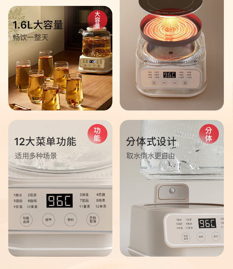 全玻璃机身,0硅胶0涂层;1000W大功率,15分钟快速沸腾;12大养生功能,可一键除氯