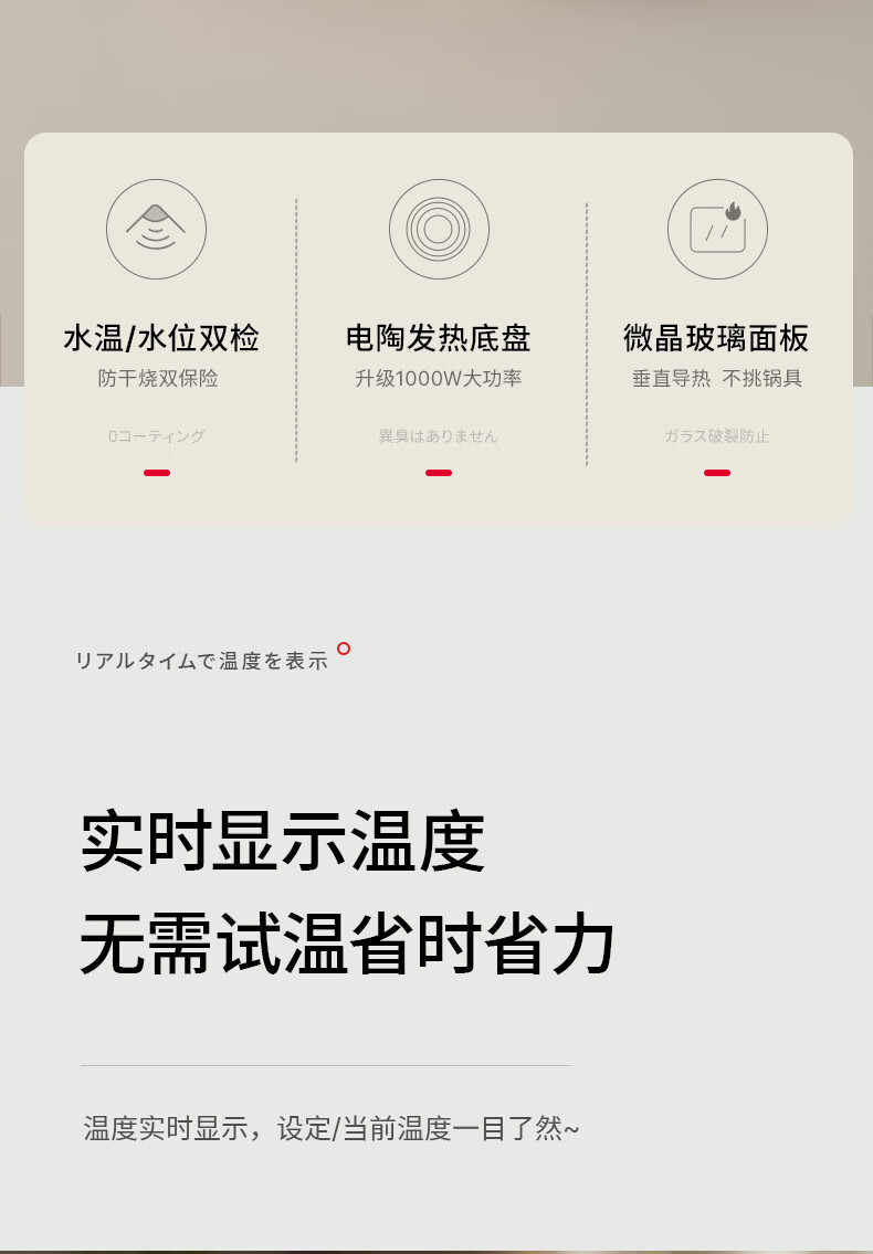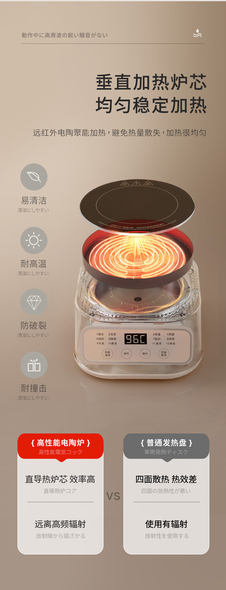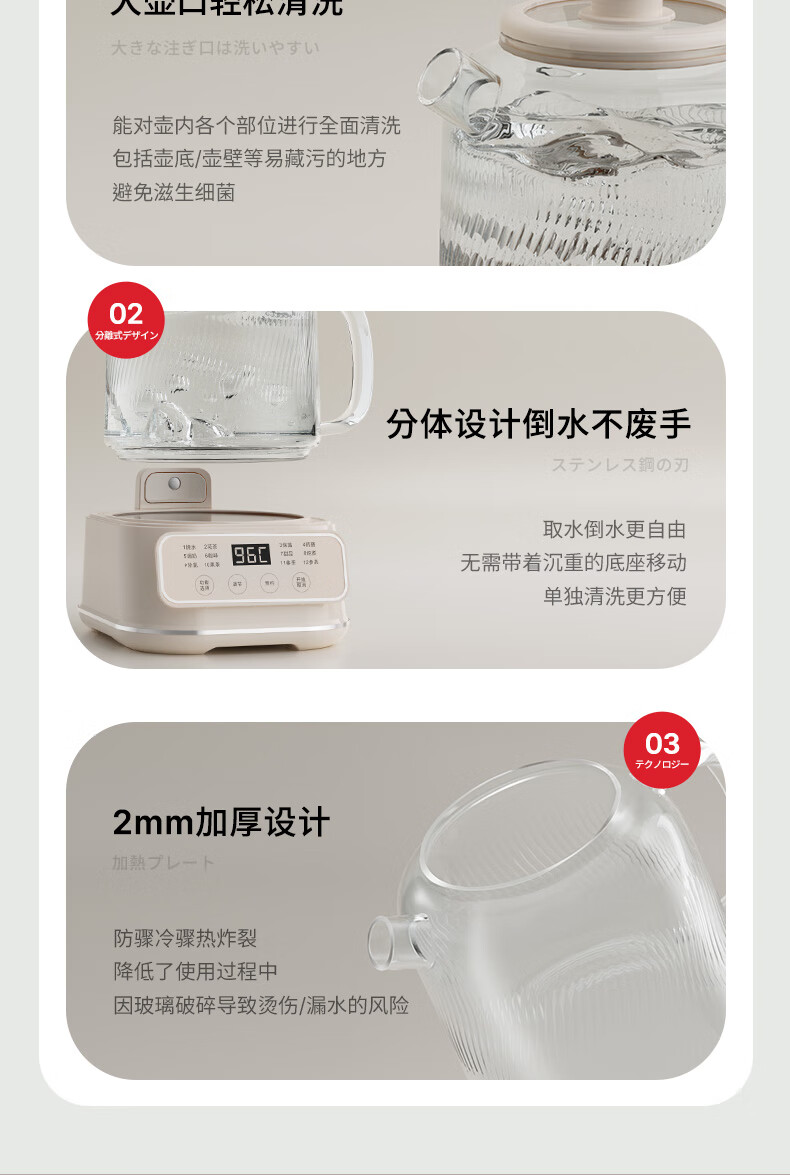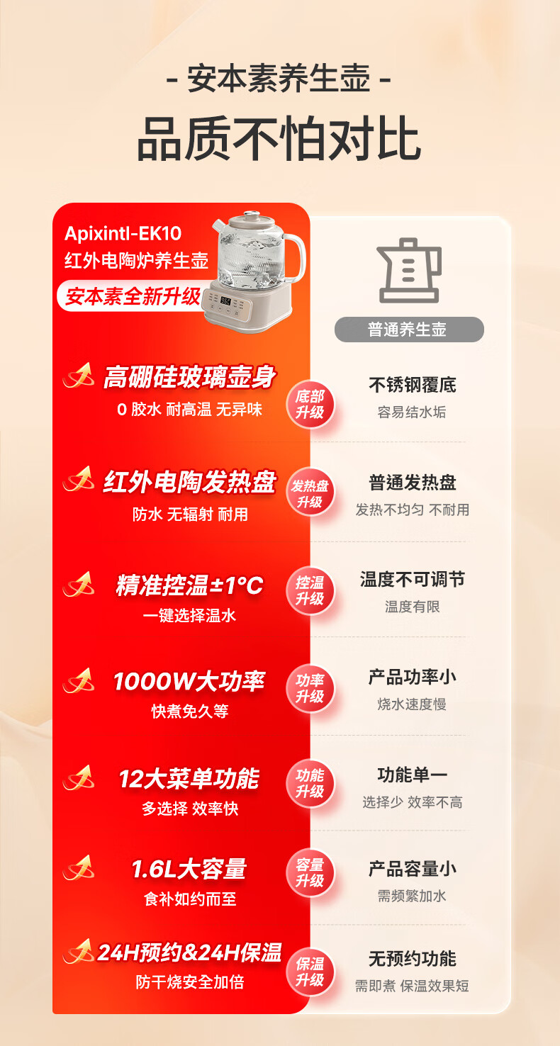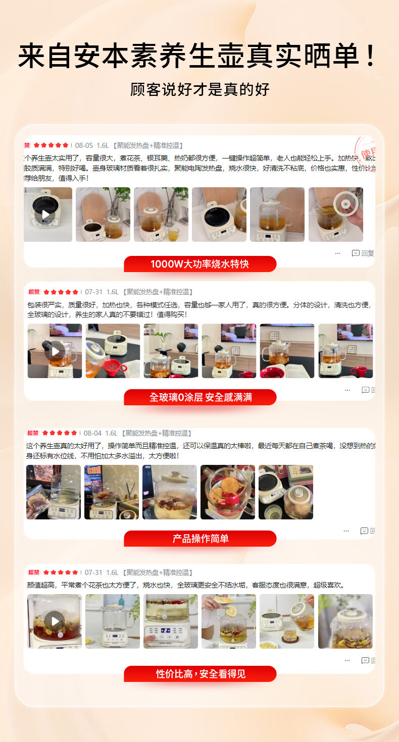 全玻璃机身,0硅胶0涂层;1000W大功率,15分钟快速沸腾;12大养生功能,可一键除氯