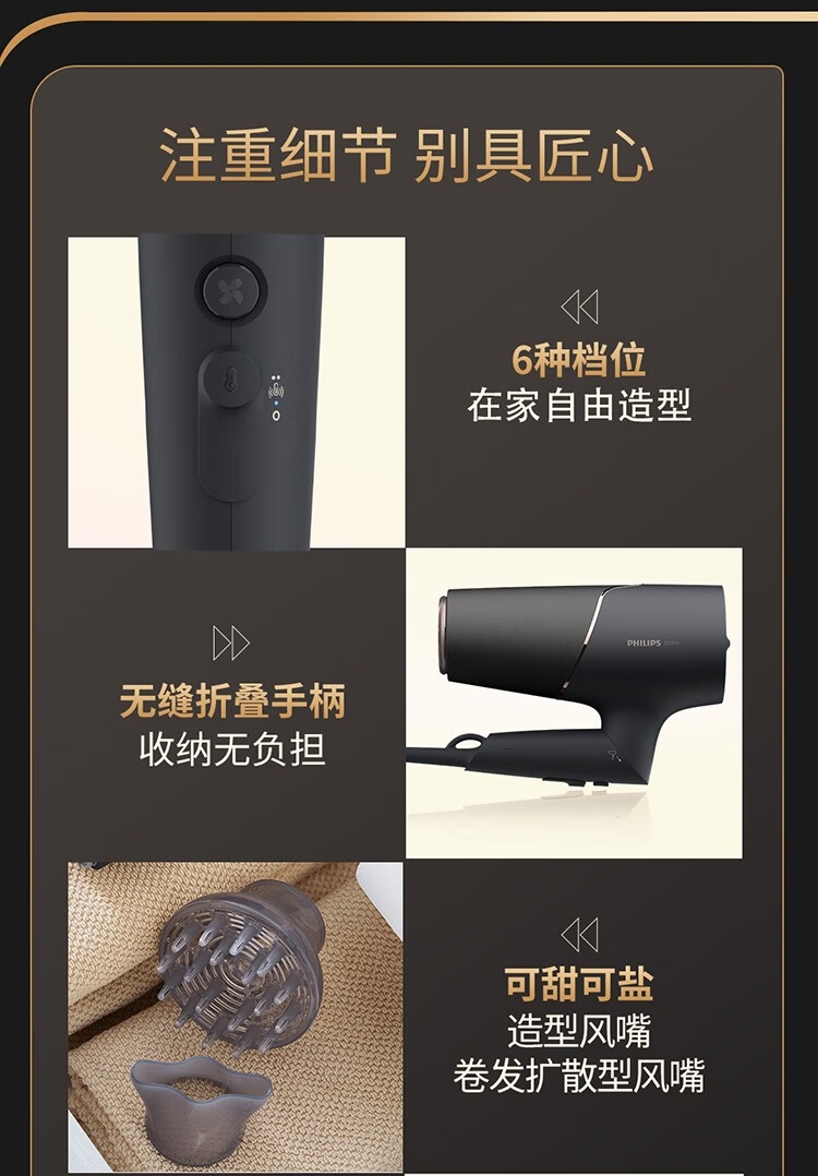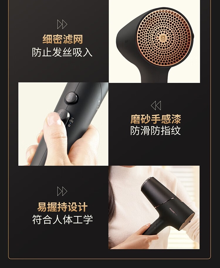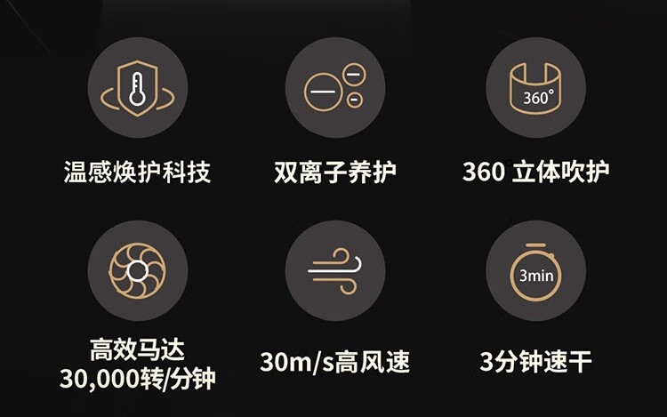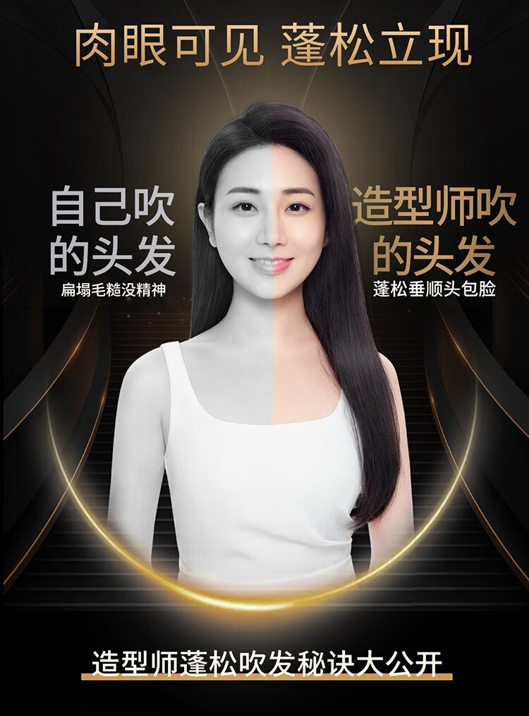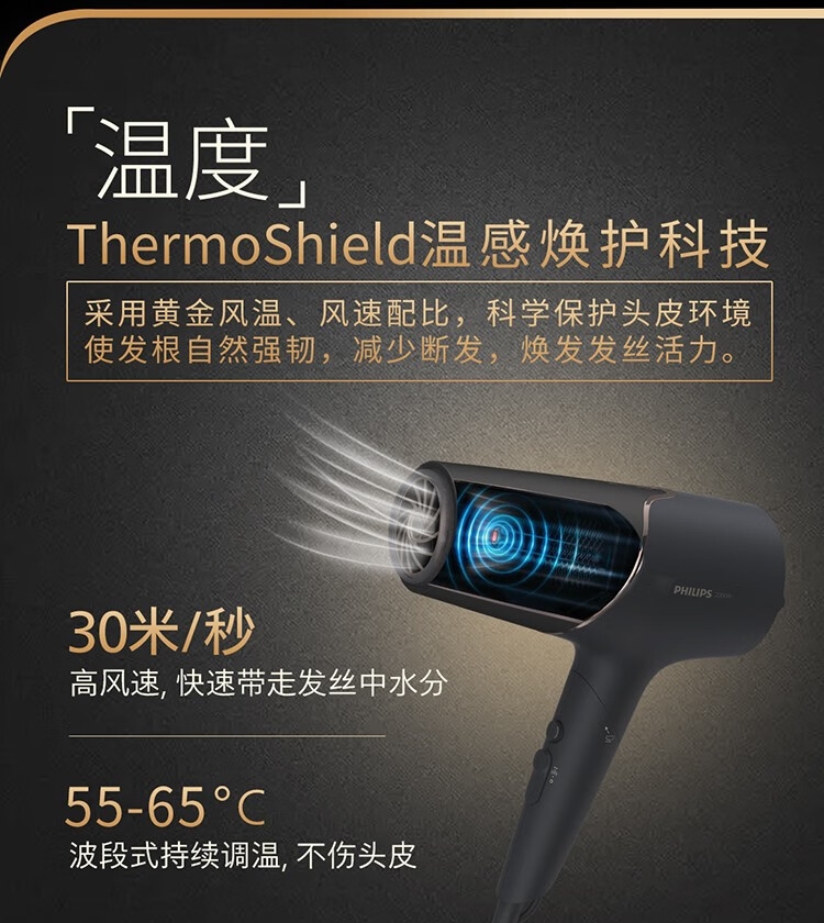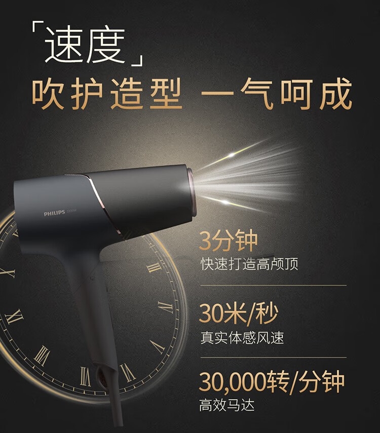 3分钟打造蓬松造型,在家吹出沙龙级高颅顶;30米/秒高风速,快速带走发丝中水分;55-65°C 波段式持续调温,不伤头皮