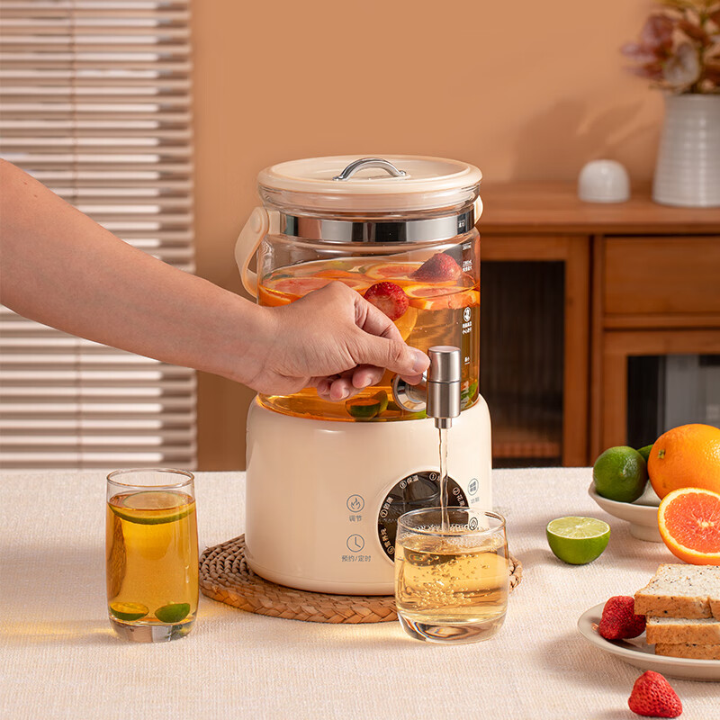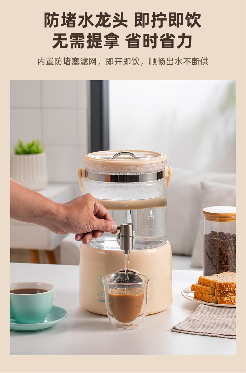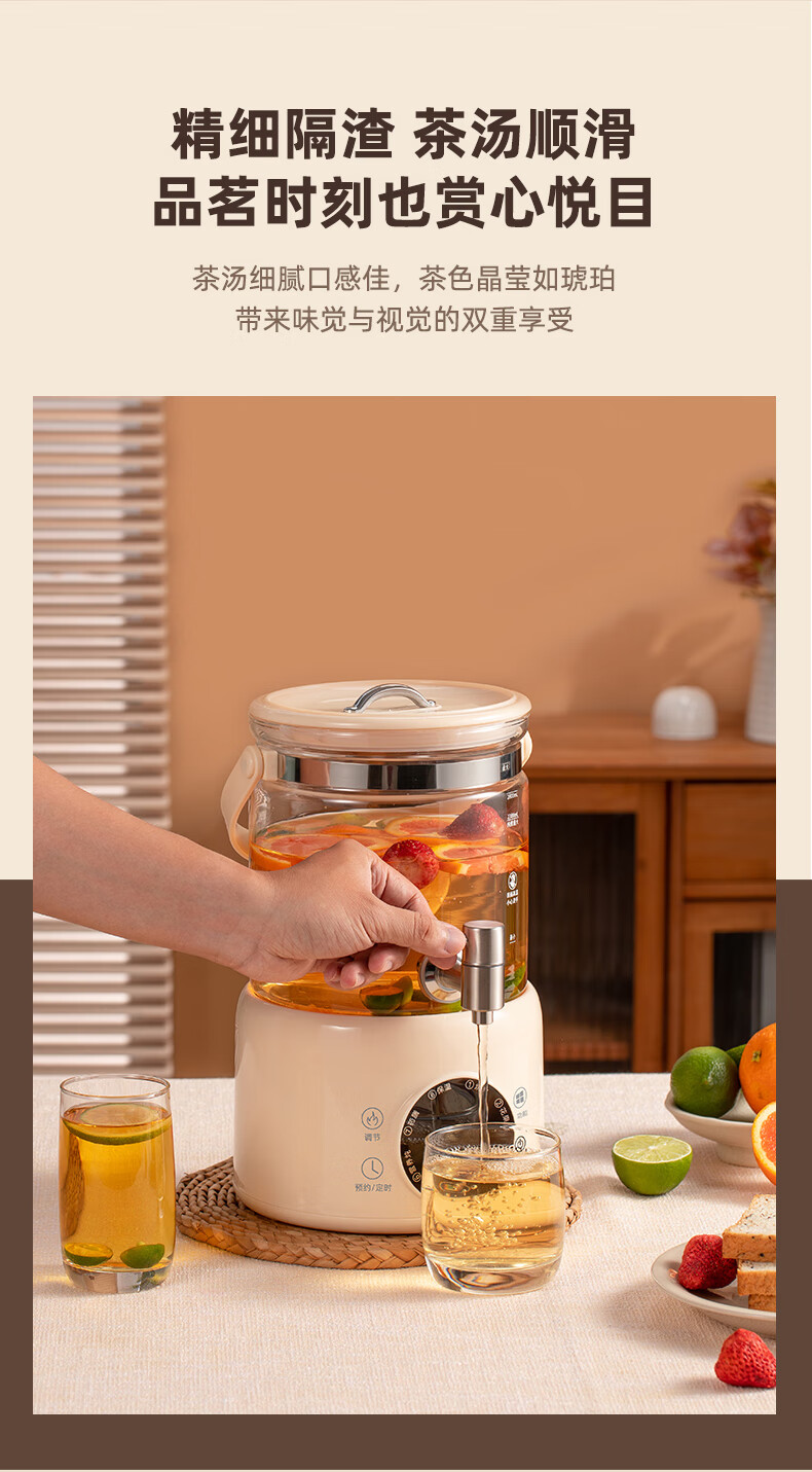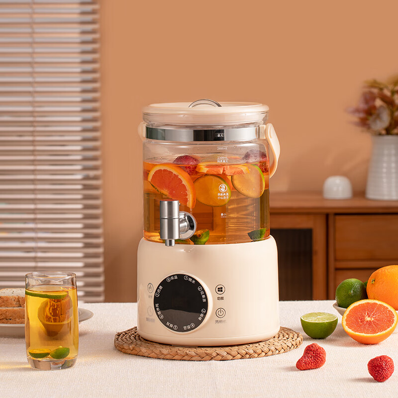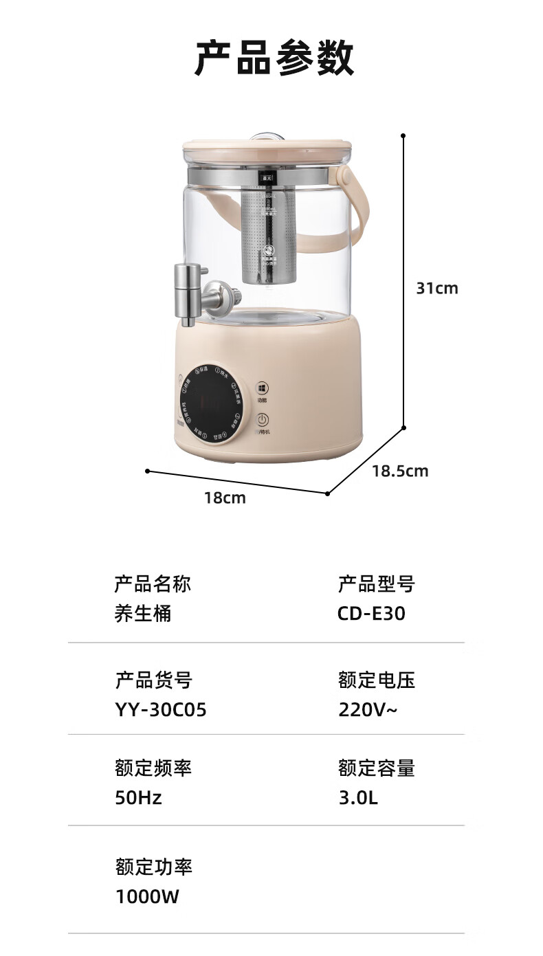 新式养生桶煮茶壶,3升大容量满足多人需求;高硼硅玻璃壶体,304不锈钢大滤网茶漏;不锈钢水龙头接水,不用提壶倒水,可预约定时;烧水、花茶、咖啡、甜品、炖煮、保温等多种功能;包装方式:彩包+网购包装
