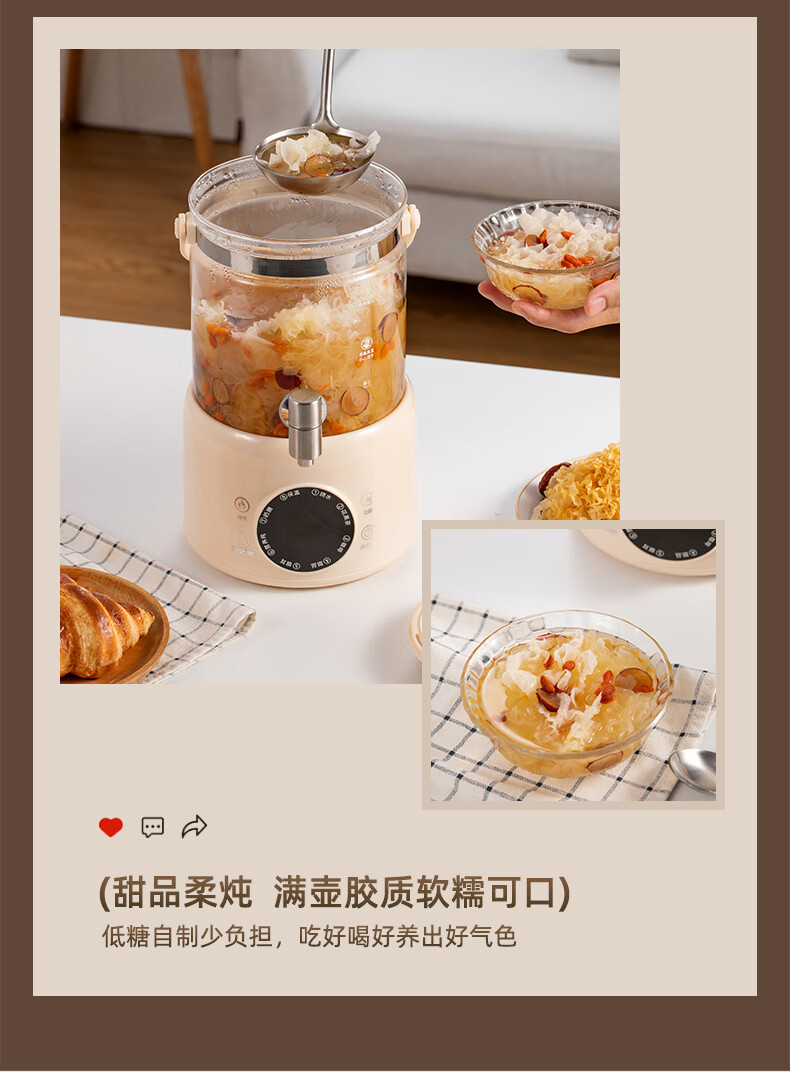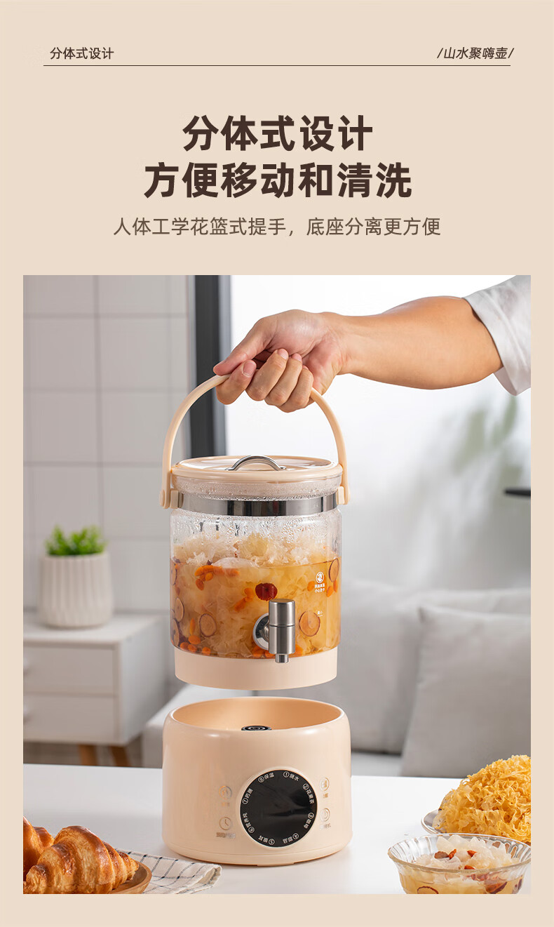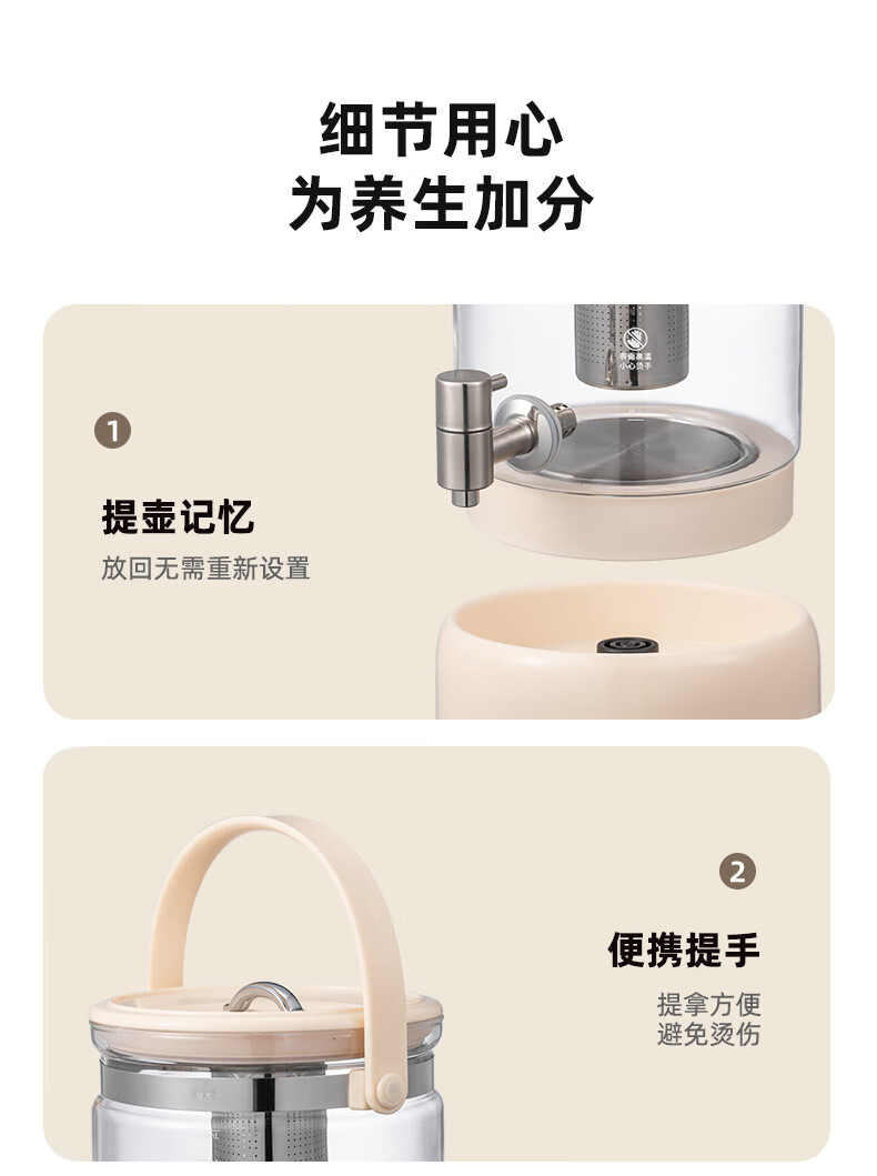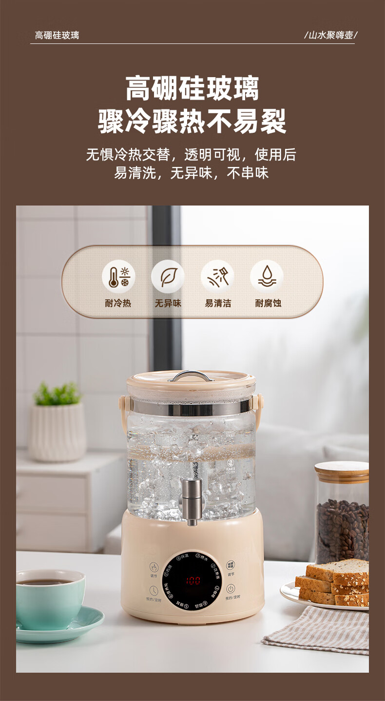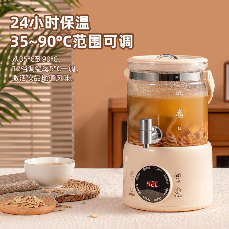 新式养生桶煮茶壶,3升大容量满足多人需求;高硼硅玻璃壶体,304不锈钢大滤网茶漏;不锈钢水龙头接水,不用提壶倒水,可预约定时;烧水、花茶、咖啡、甜品、炖煮、保温等多种功能;包装方式:彩包+网购包装