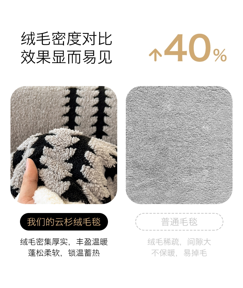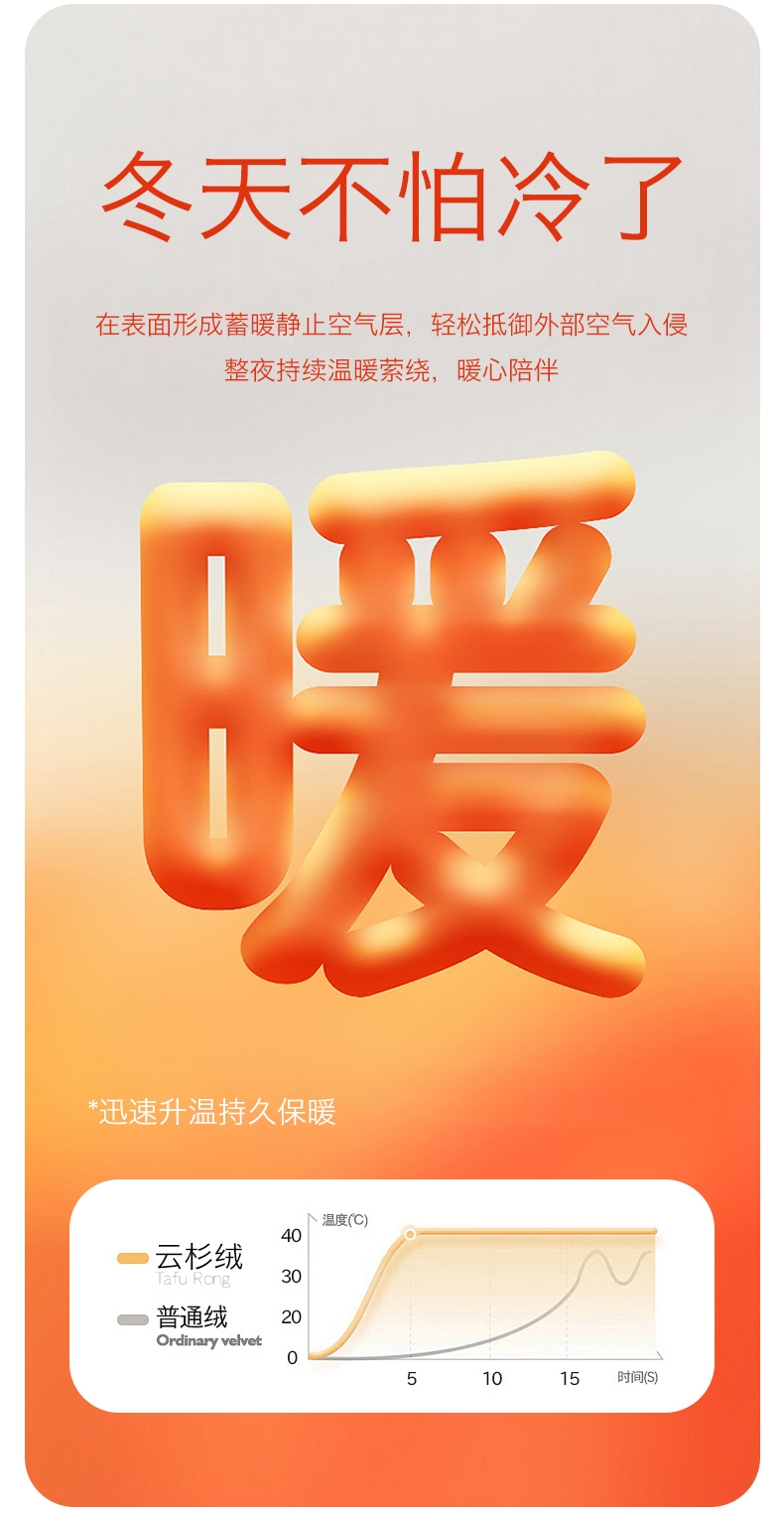 向暖而生云杉绒,绒毛密集厚实,丰盈蓬松柔软。;柔软亲肤,保留原始的温暖质感,动态循环调节热感平衡;拥有丰厚的绒毛,手感细腻顺滑,触感更温润。