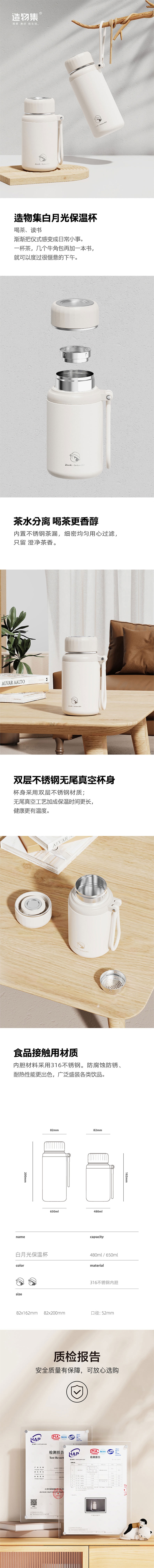 内置食品级不锈钢茶漏,细密均匀用心过滤;杯身采用 双层食品级不锈钢材质;保温时间更长;内胆采用316不锈钢,防腐蚀防锈、耐热性能更出色