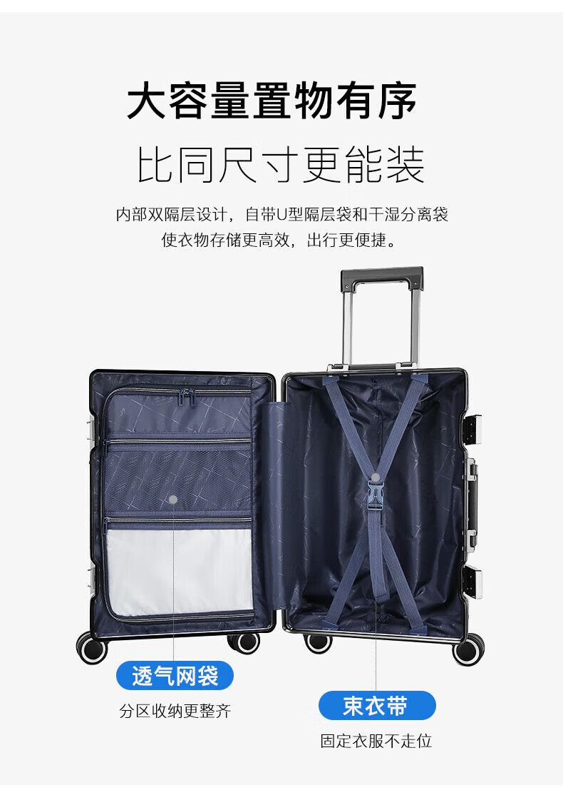 分区收纳设计,一面保护隐私,一面固定衣物;高硬度6系铝合金边框,承重抗压不变形;前置人性化挂钩,全金属隐藏式设计.加强防撞包角