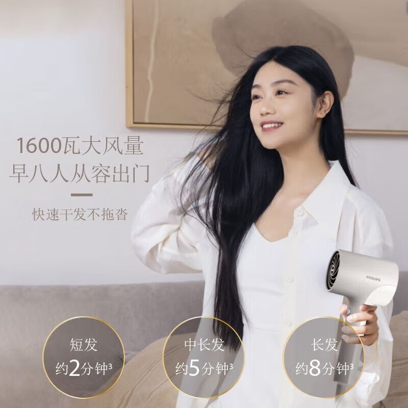 1600瓦大功率,3-5分钟快速干发;2千万负离子,秀发柔顺光泽;4种吹发模式随心切换