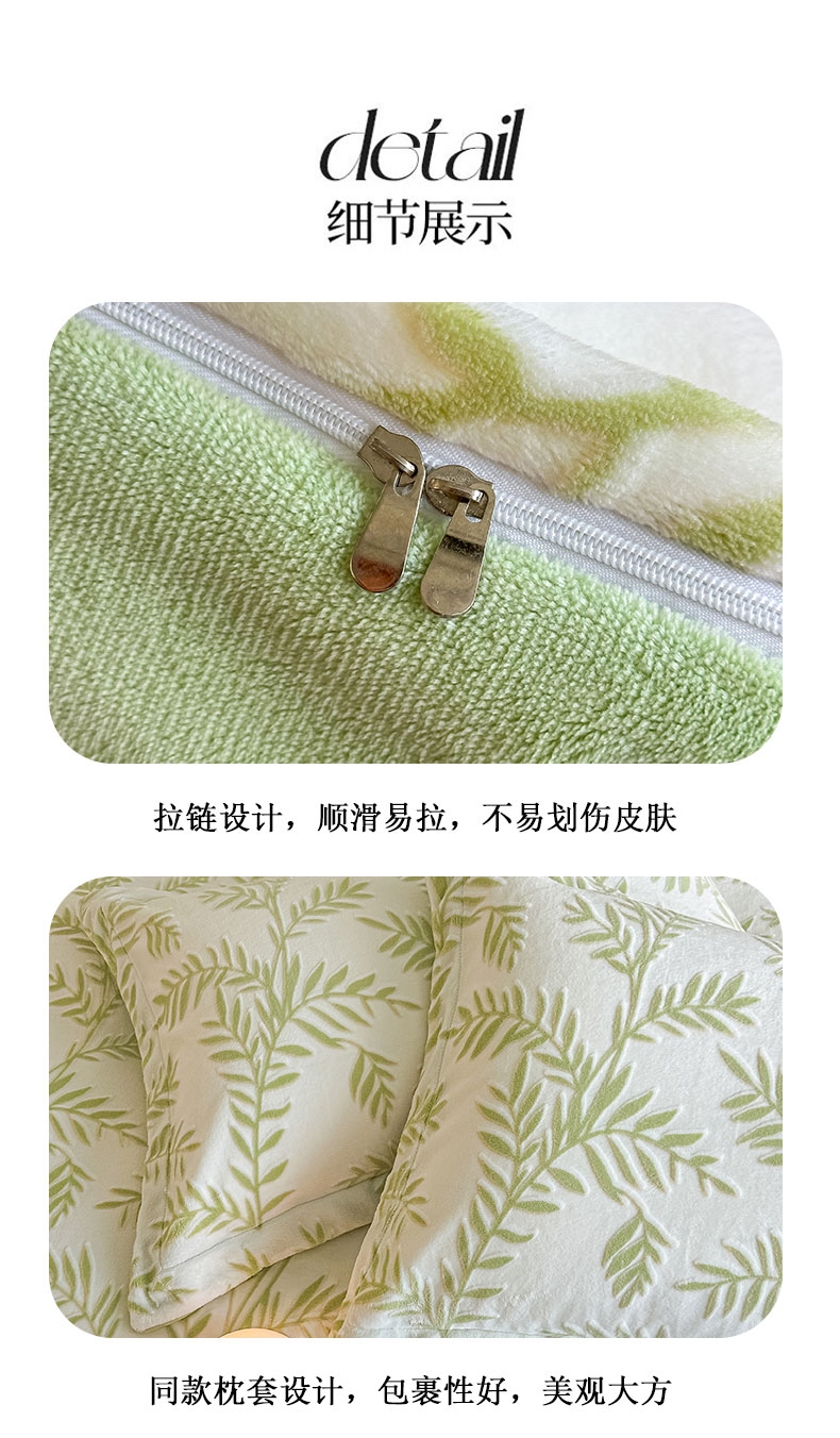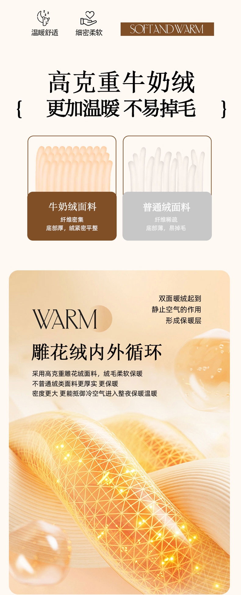 牛奶绒面料,享温暖,用身体去感触。;牛奶绒面料质地蓬松,透气性好。;牛奶绒面料温暖舒适,云朵般细腻。