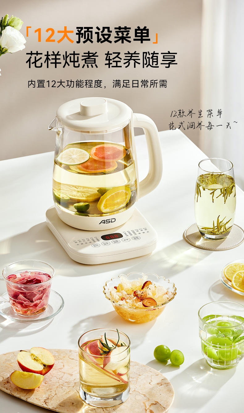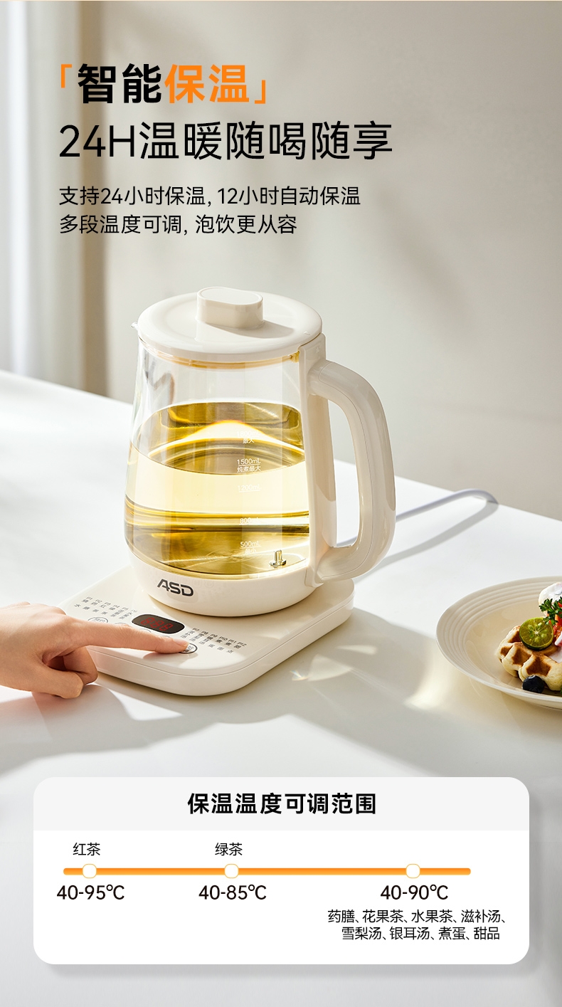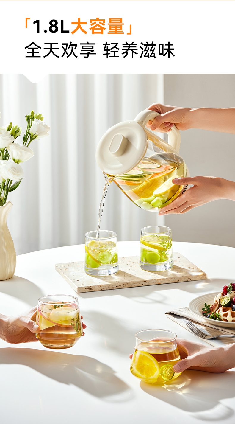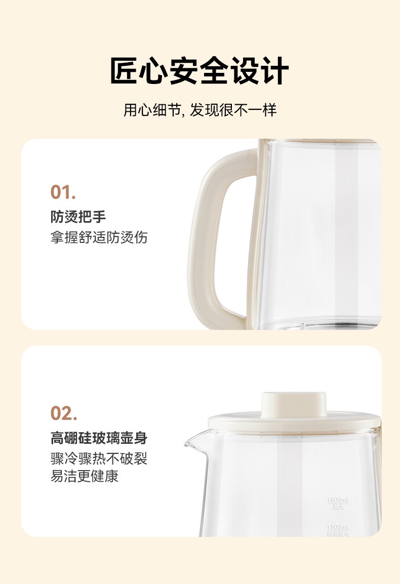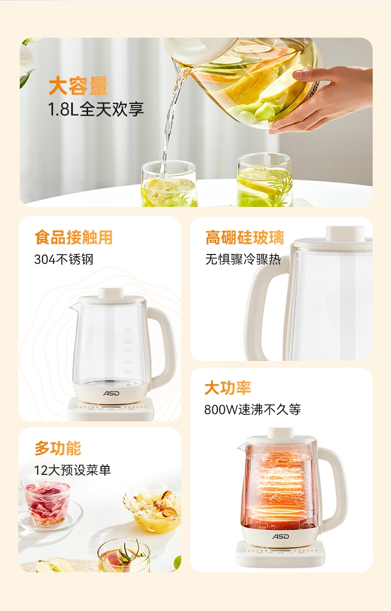 1.8L超大容量,续杯无忧;304不锈钢底盘和壶下盖,健康无忧;高硼硅壶身,无惧骤冷骤热;12大功能菜单,养生不重样;24小时保温功能,12小时自动保温热饮随时享