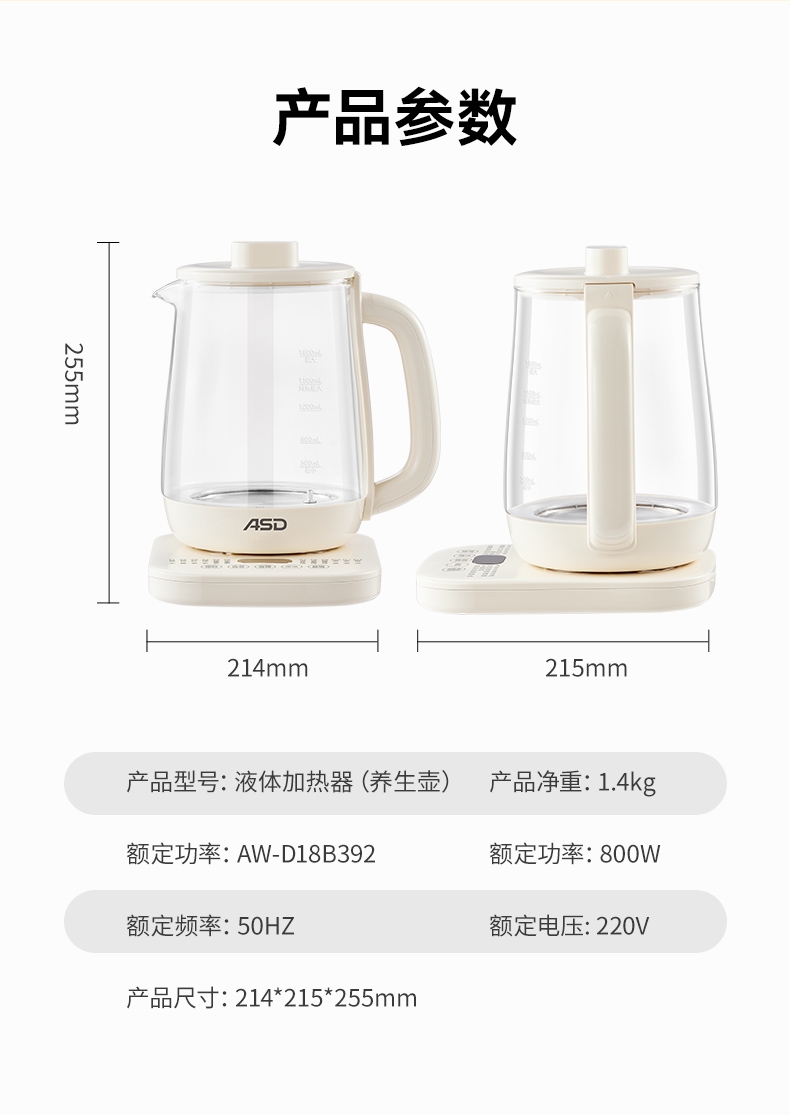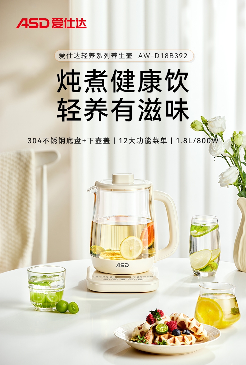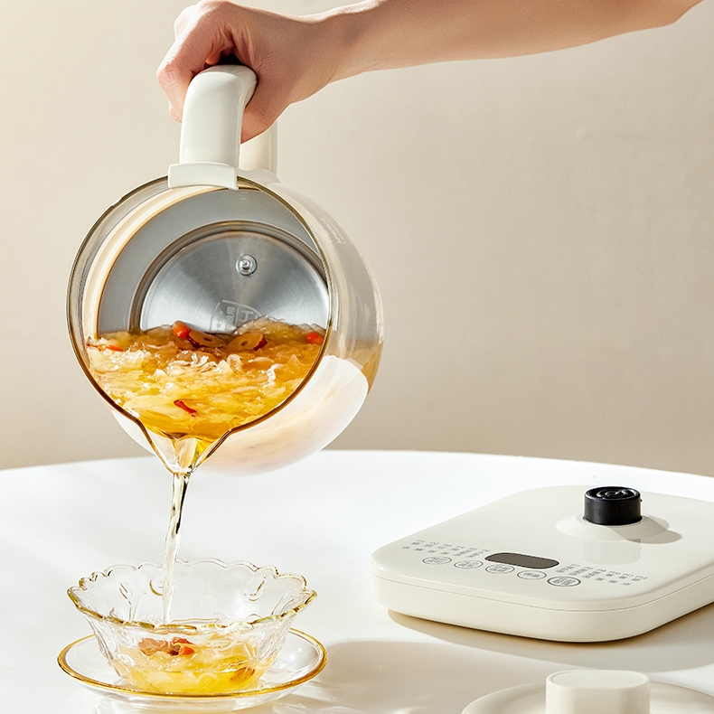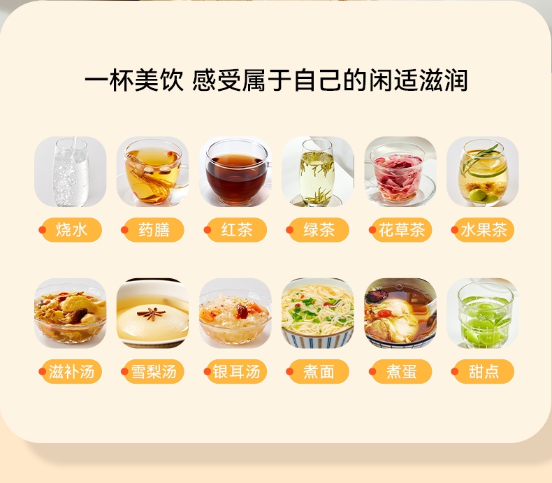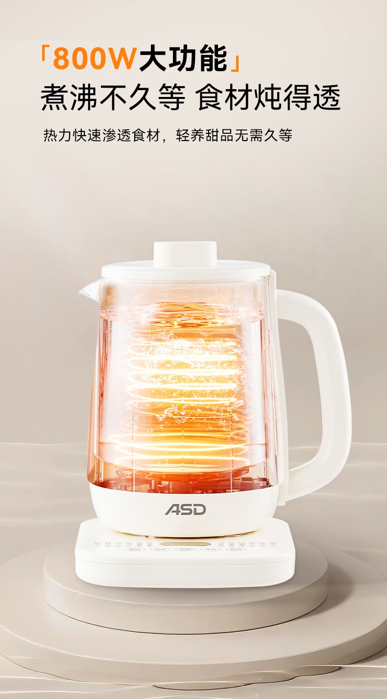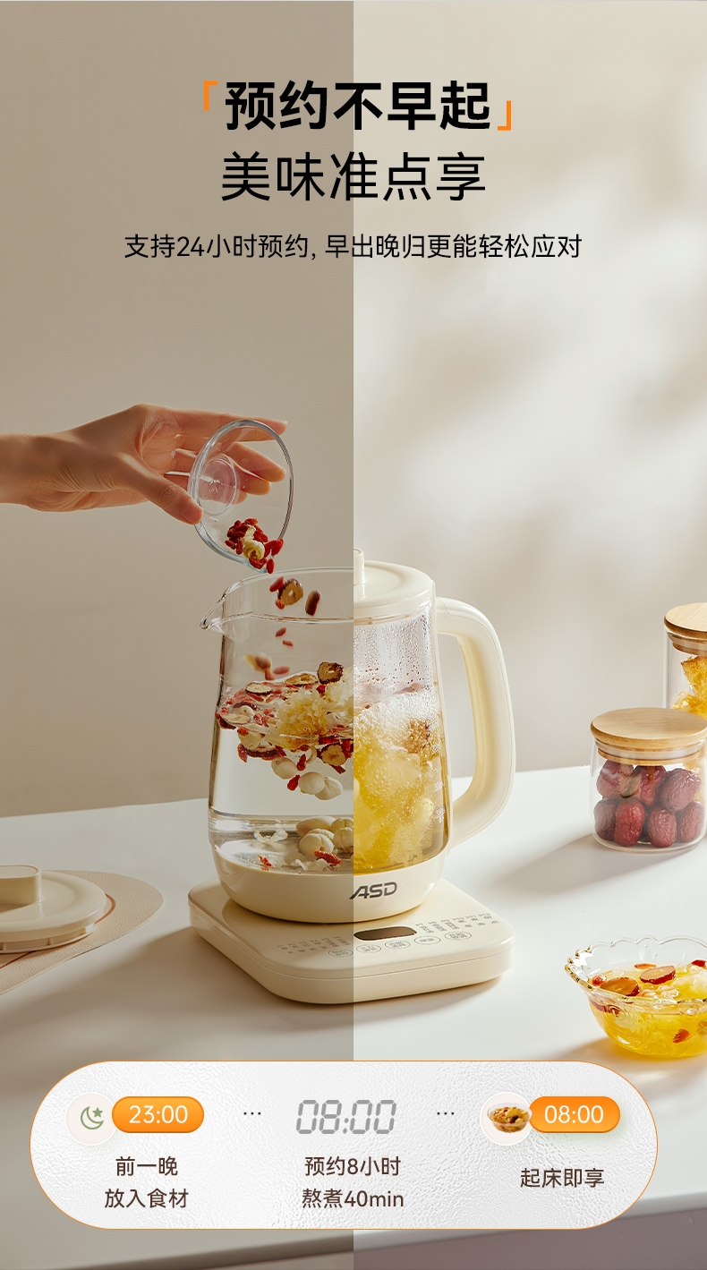 1.8L超大容量,续杯无忧;304不锈钢底盘和壶下盖,健康无忧;高硼硅壶身,无惧骤冷骤热;12大功能菜单,养生不重样;24小时保温功能,12小时自动保温热饮随时享