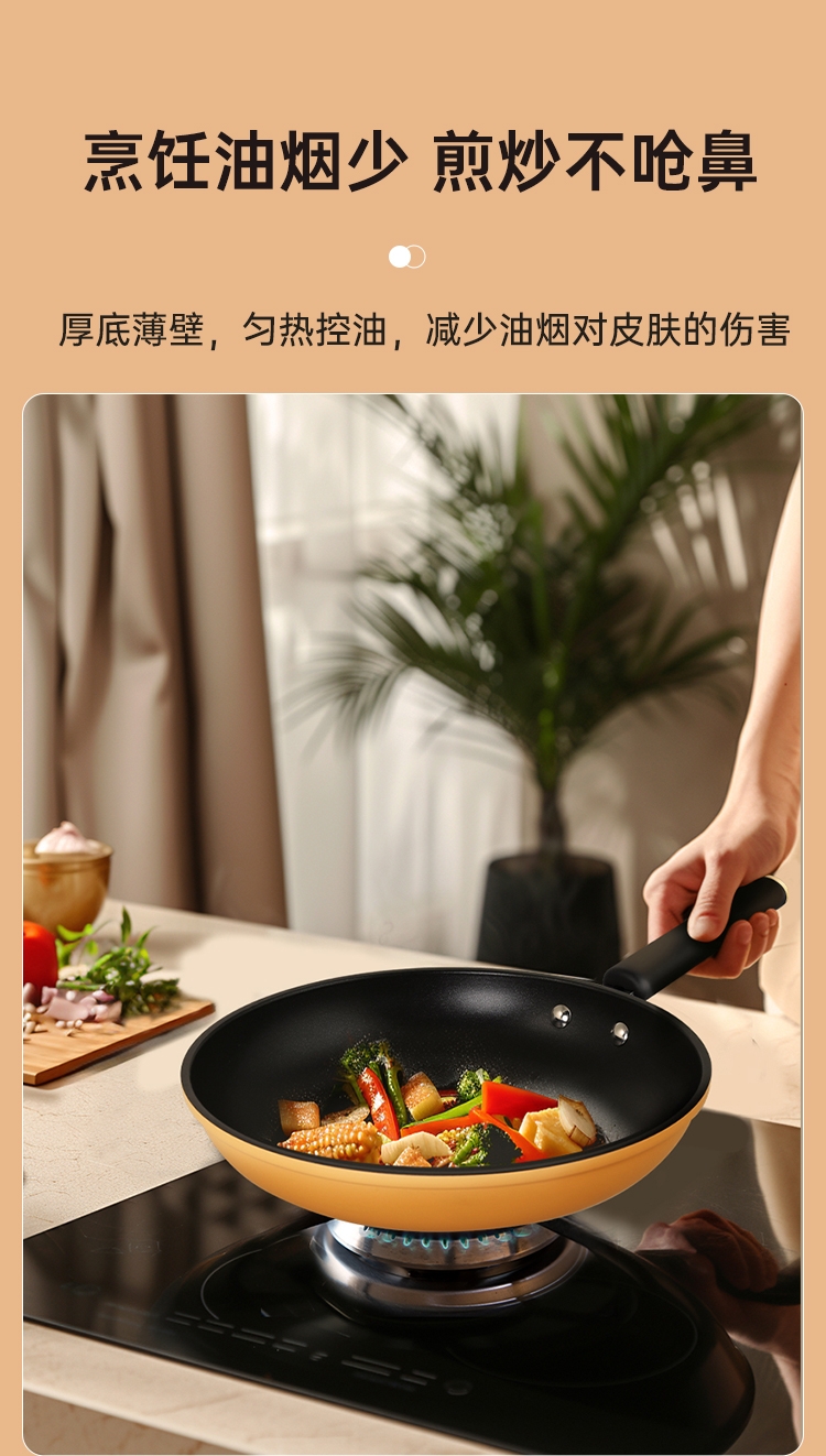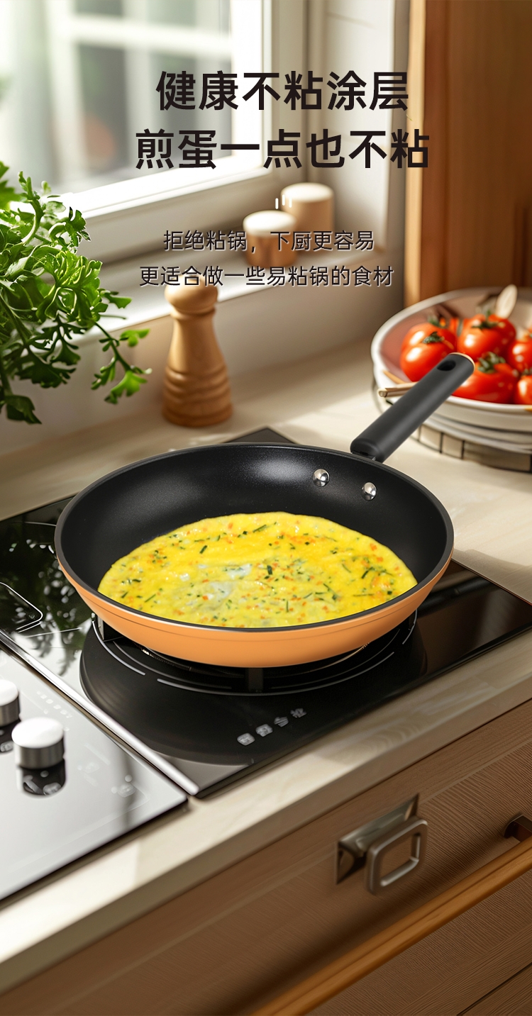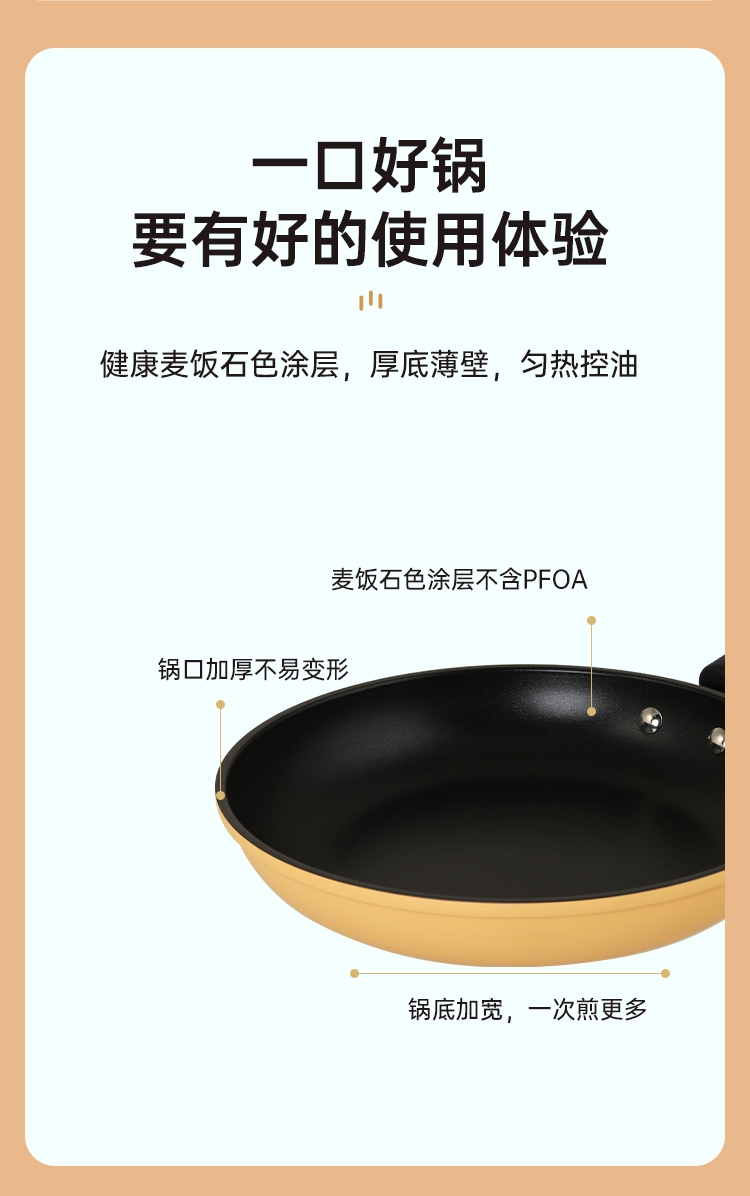 厚底薄壁,匀热控油,减少油烟对皮肤的伤害。;健康涂层不含PFOA,锅口加厚不易变形。;健康不粘涂层煎蛋一点也不粘。