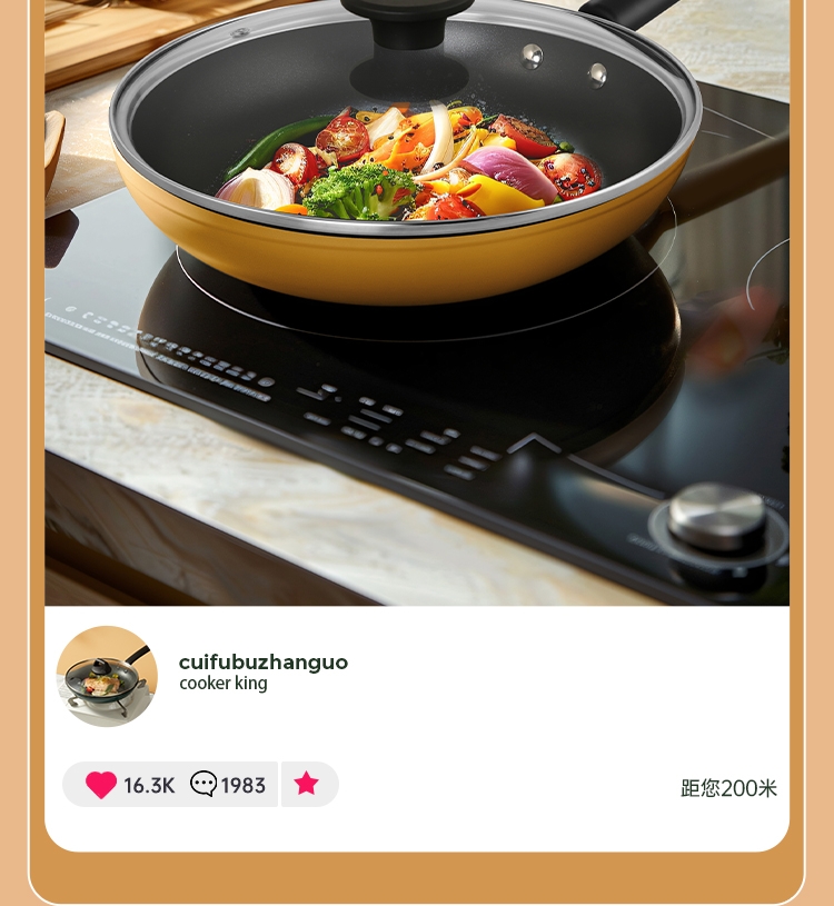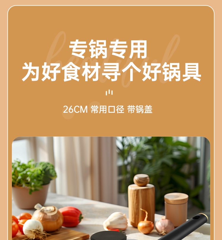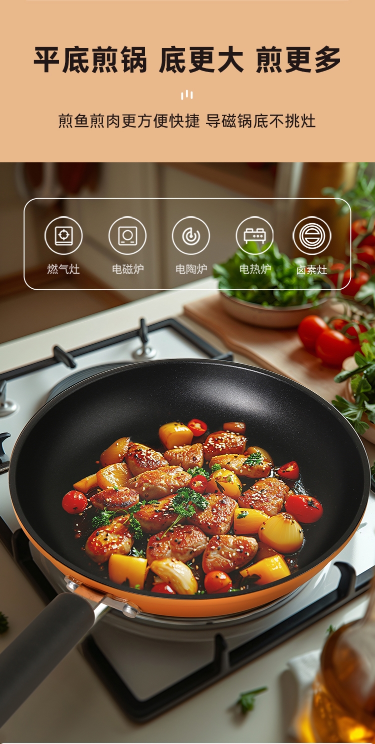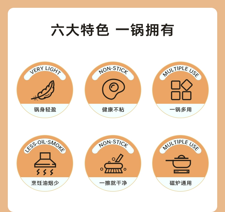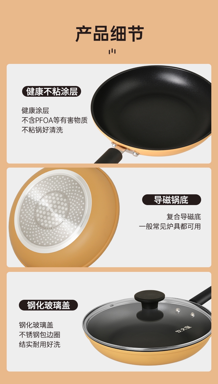 厚底薄壁,匀热控油,减少油烟对皮肤的伤害。;健康涂层不含PFOA,锅口加厚不易变形。;健康不粘涂层煎蛋一点也不粘。