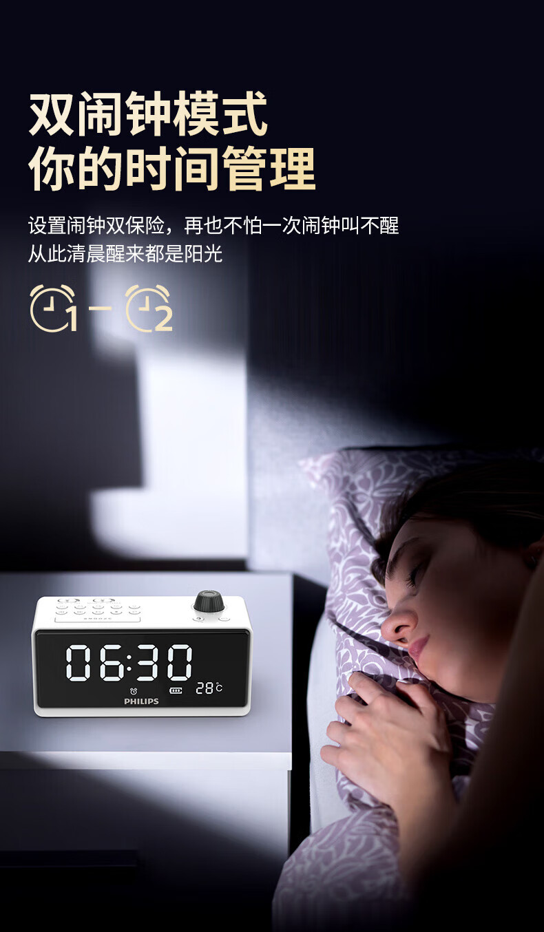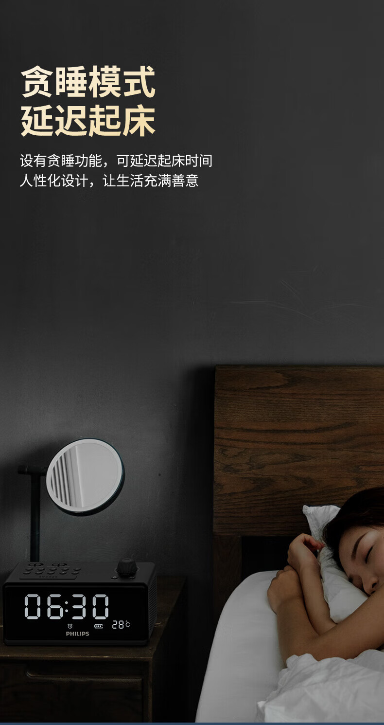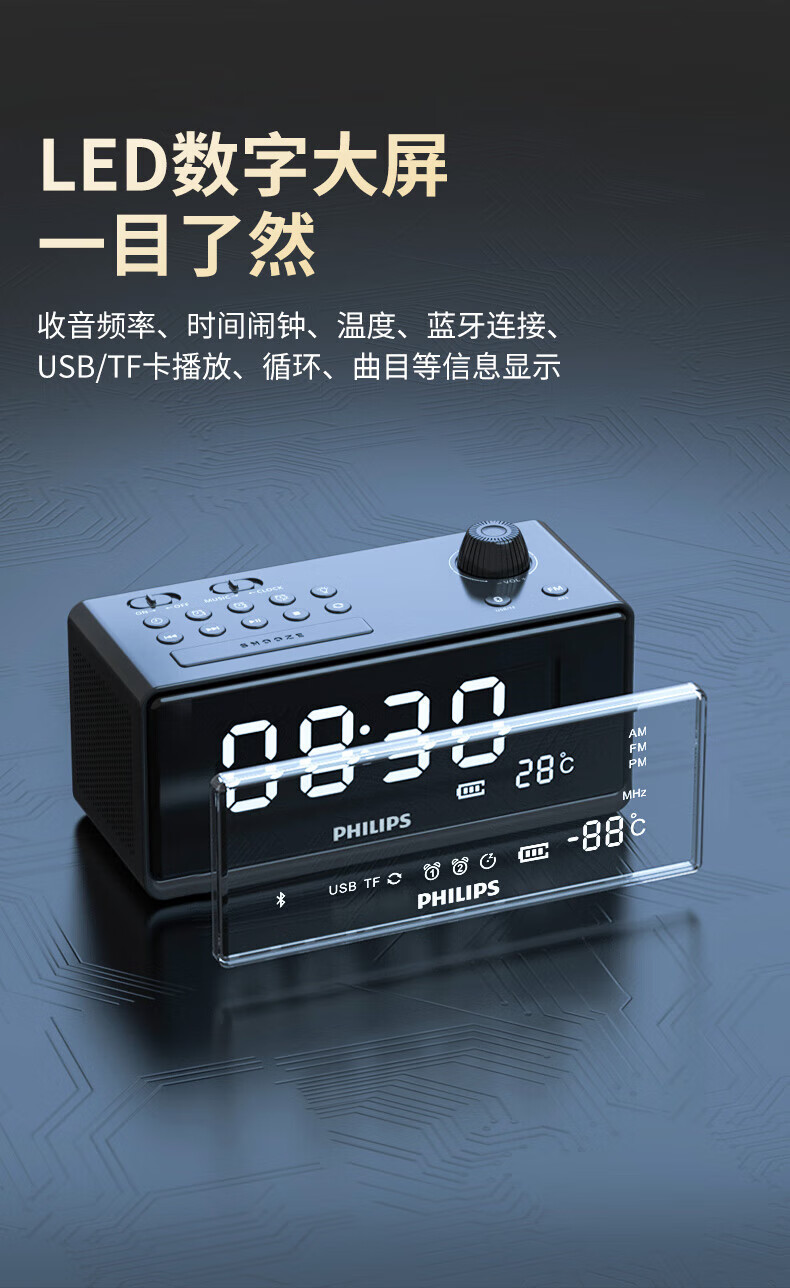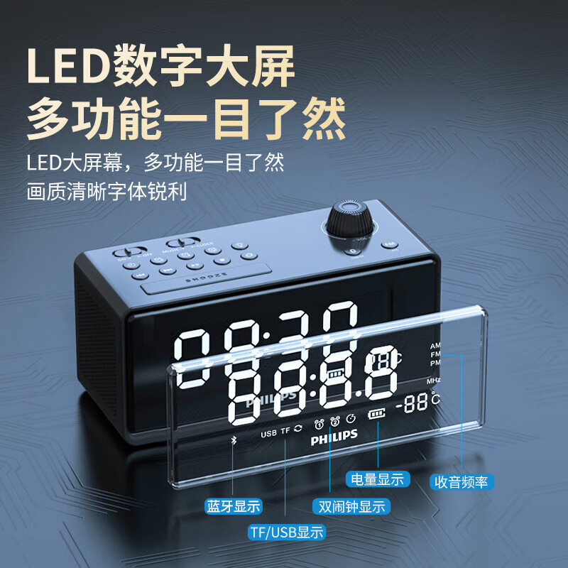 时钟+双闹钟+睡眠;;支持蓝牙播放;;LED大屏显示